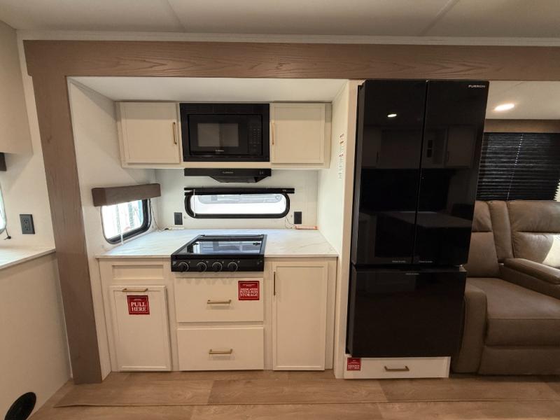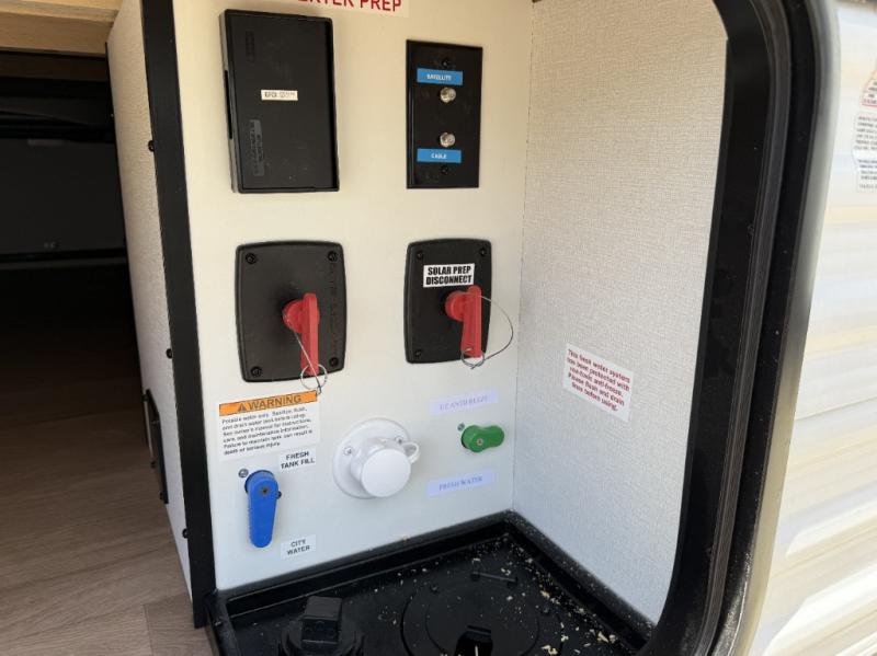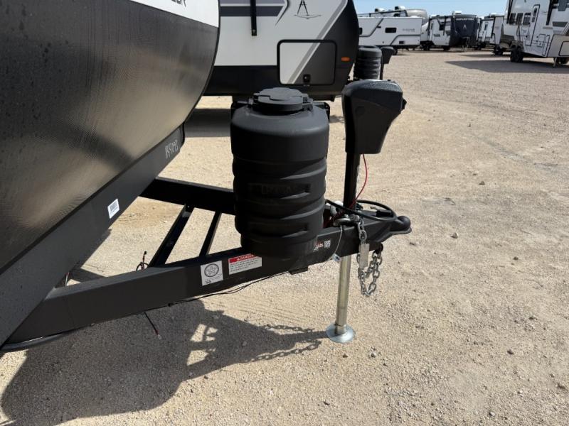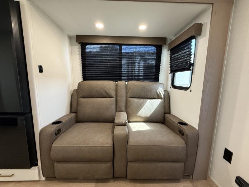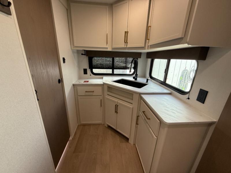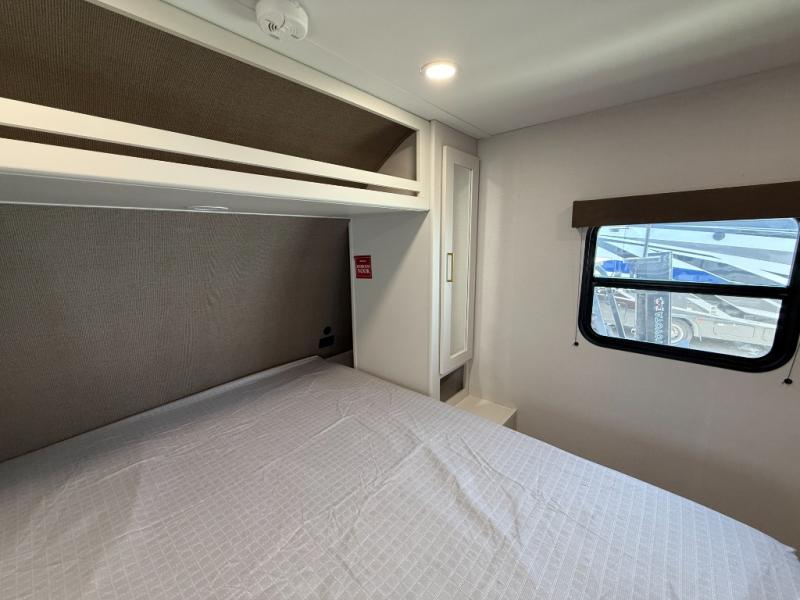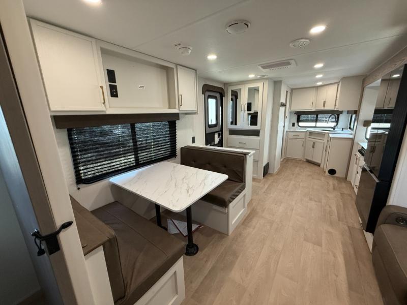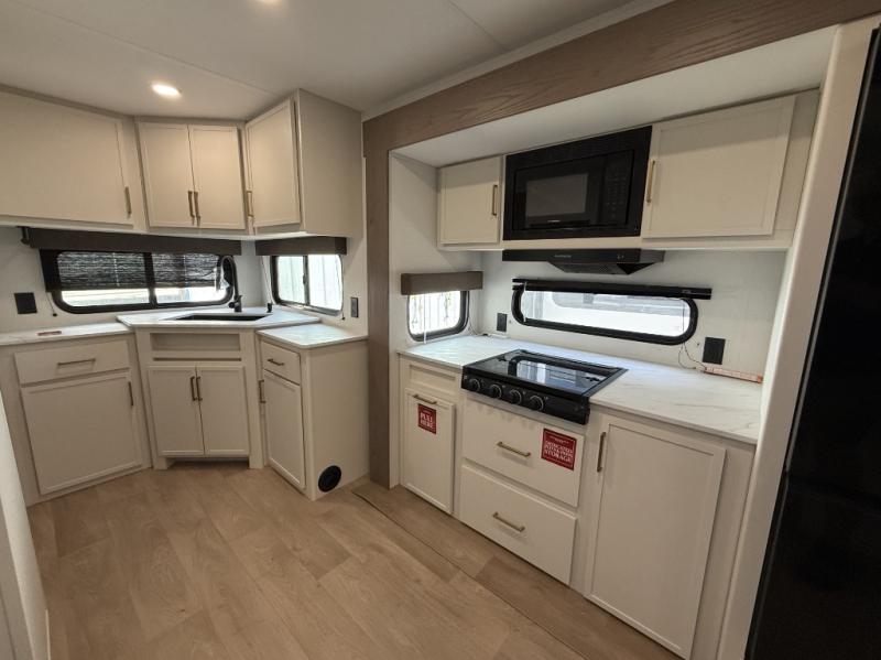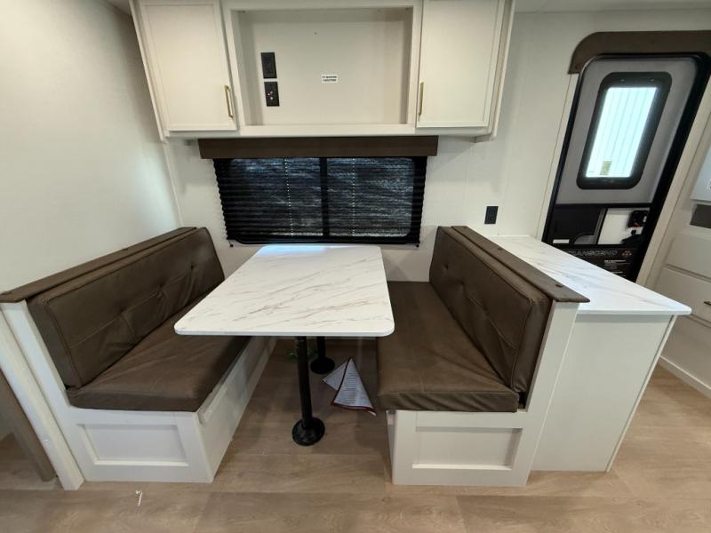 It will be so easy to enjoy camping trips in this travel trailer for five to six! The main living area is made spacious by the large slide out, and here you'll find the 60" sleeper sofa and the kitchen appliances. A booth dinette across the room provides a place to dine and play board games, or you can head outdoors to sit under the 17' power awning with LED lights. The queen bed in the front private bedroom will have you feeling right at home, and the TV prep here gives you the option to watch movies in bed. This model also includes a rear corner kitchen with ample counter space and a large sink, and you'll find the full bath in the other rear corner!