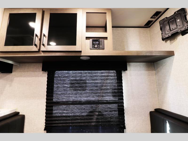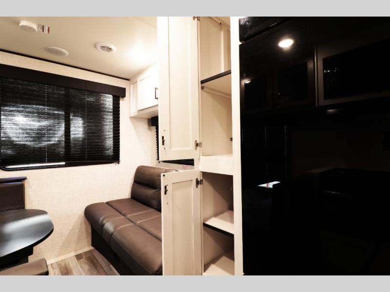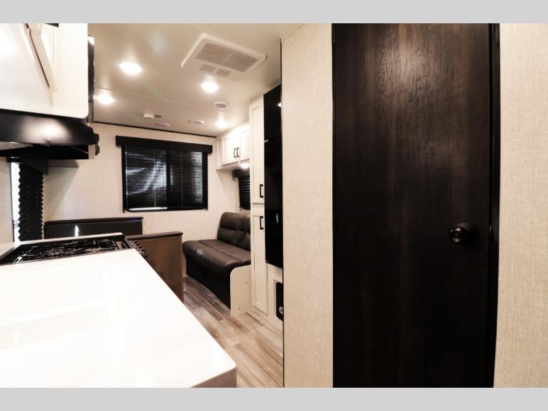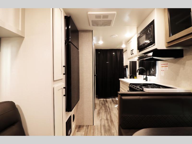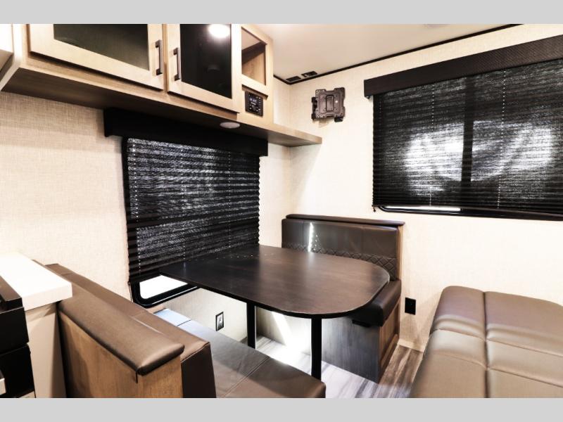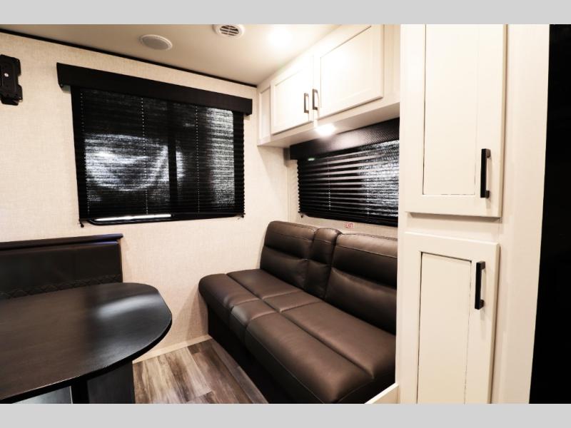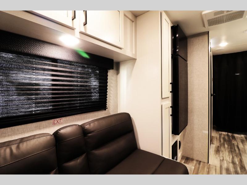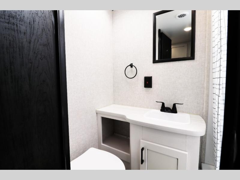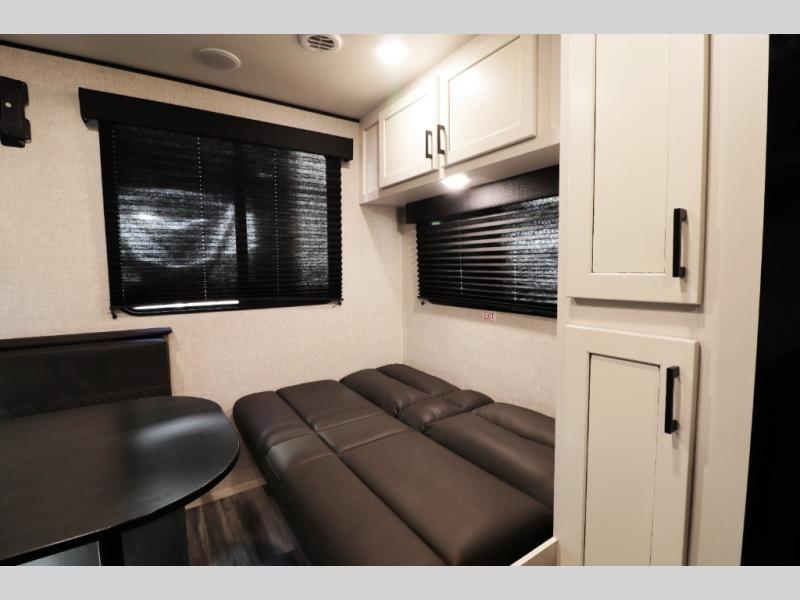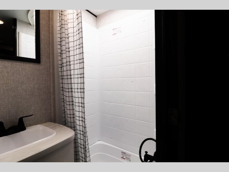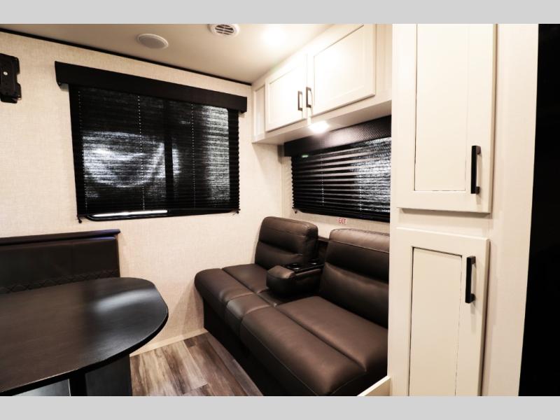This family-focused bunkhouse model features double-size bunks and dual entry doors, giving kids, guests, or extended family their own comfortable sleeping space while allowing easy access to both the bathroom and main living area. The open floorplan with slide-out creates a roomy interior, while theater seating and convertible dining areas provide relaxing comfort after a day of travel or camping. A private front queen master bedroom offers couples the comfort and privacy they want, making this RV ideal for both family trips and romantic getaways.
