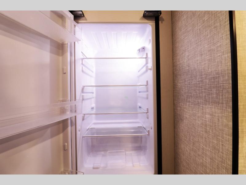 Residential-style kitchen with large 12V refrigerator and convection cooking capability