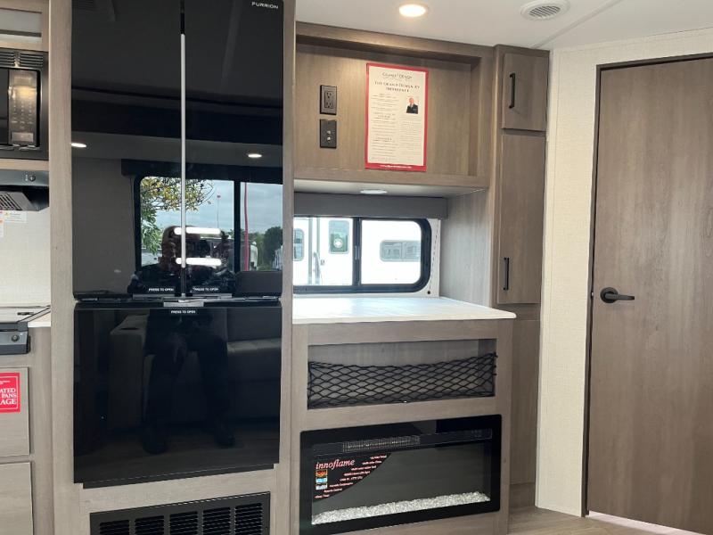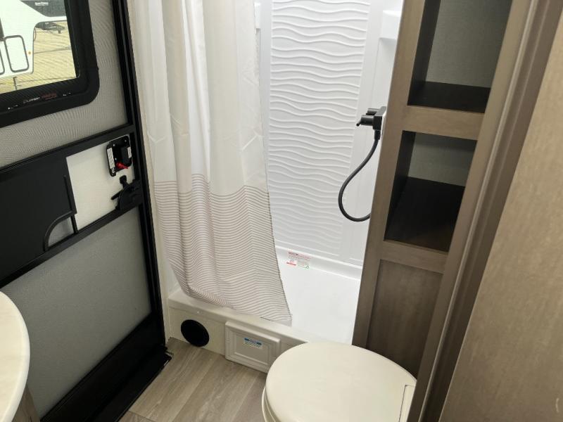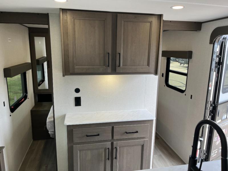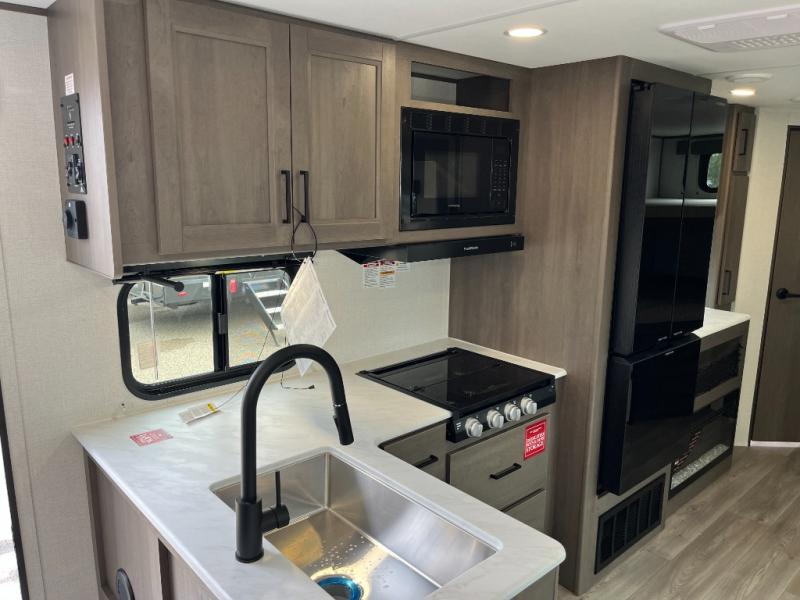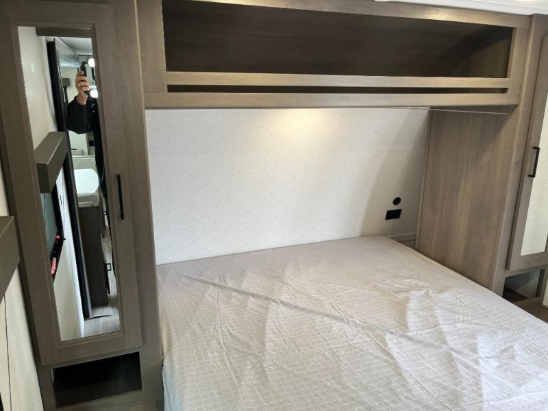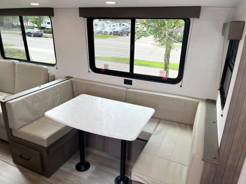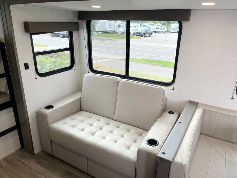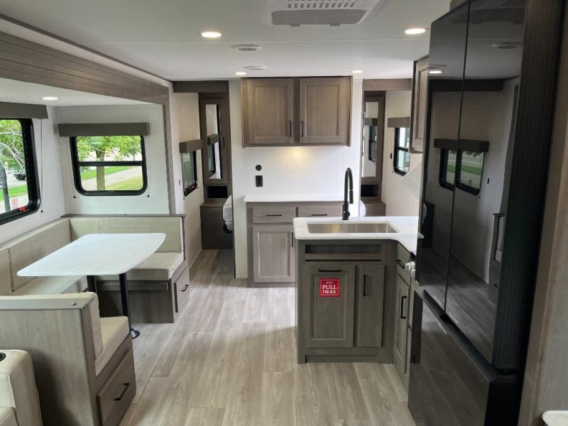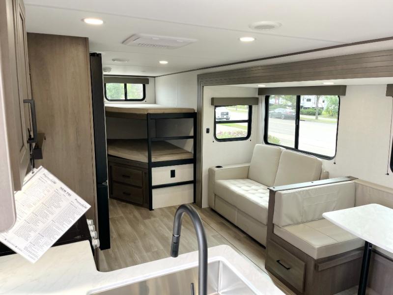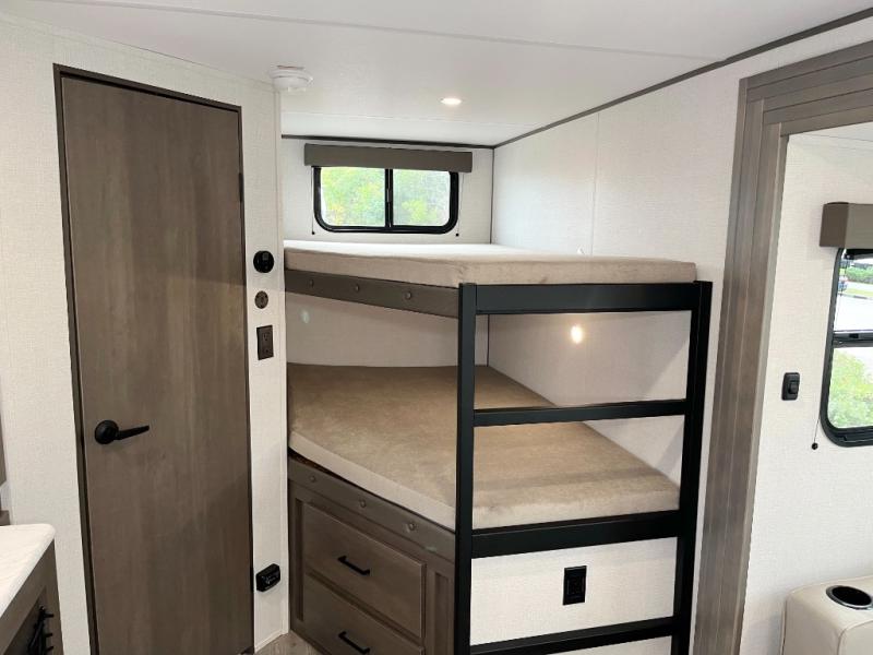 Get ready to take your travels to new heights with our incredible luxury travel trailer! The front bedroom has a queen bed, wardrobe, and overhead cabinets for all your favorite belongings, the perfect place to relax and recharge after a long day of adventure. The living room/kitchen combined area is equipped with a U-shaped dinette, three-burner cooktop, microwave, refrigerator, pantry, and 62” theater seating. Perfect for cooking up your favorite meals, entertaining friends and family, or simply relaxing and enjoying the comforts of home. The full bathroom is spacious and complete with a linen closet for added convenience. And with double-sized bunk beds featuring curtains and under-bunk storage, the kids will have their cozy retreat. But the adventure doesn't stop there! Outside, you'll find an exterior griddle with a 1.7 refrigerator, perfect for cooking up a storm in the great outdoors. And with a massive 19’ awning, you'll have plenty of shade and protection from the elements, plus, with two entry/exit doors and pass-through storage, you'll have easy access to the trailer and all your gear.