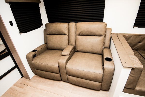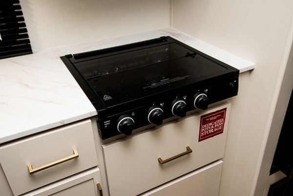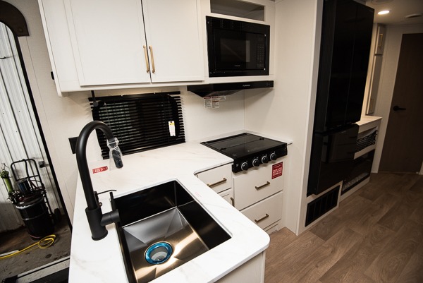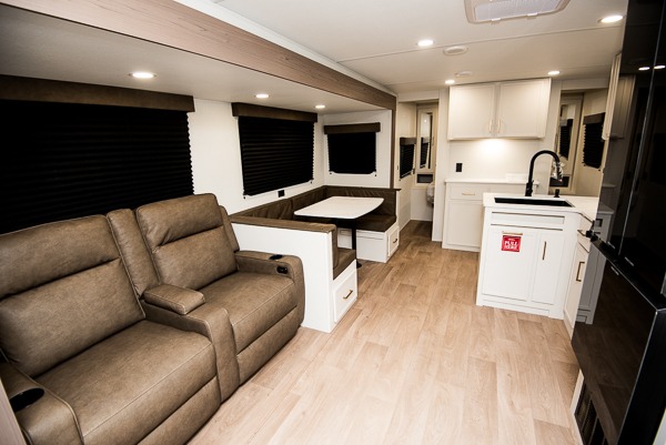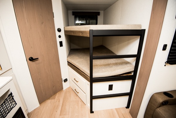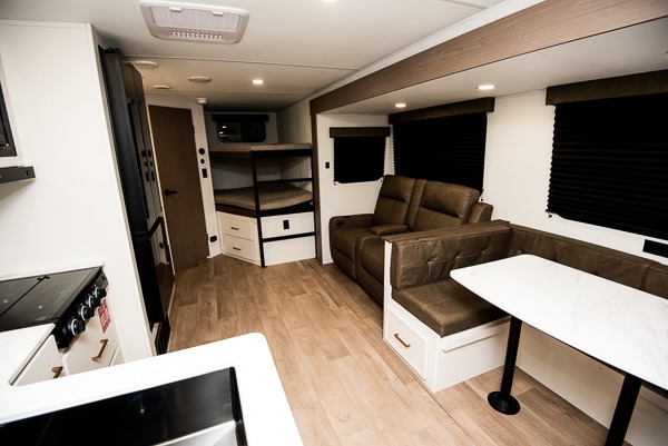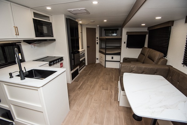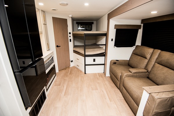 Get ready to take your travels to new heights with our incredible luxury travel trailer! The front bedroom has a queen bed, wardrobe, and overhead cabinets for all your favorite belongings, the perfect place to relax and recharge after a long day of adventure. The living room/kitchen combined area is equipped with a U-shaped dinette, three-burner cooktop, microwave, refrigerator, and pantry. The full bathroom is spacious and complete with a linen closet for added convenience. And with double-sized bunk beds featuring curtains and under-bunk storage, the kids will have their cozy retreat. But the adventure doesn't stop there! Outside, you'll find an exterior griddle with a 1.7 refrigerator, perfect for cooking up a storm in the great outdoors. And with a massive 19’ awning, you'll have plenty of shade and protection from the elements, plus, with two entry/exit doors and pass-through storage, you'll have easy access to the trailer and all your gear.