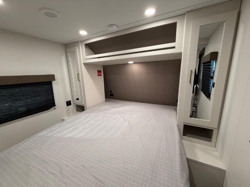 Get ready to take your travels to new heights with our incredible luxury travel trailer! The front bedroom has a queen bed, wardrobe, and overhead cabinets for all your favorite belongings, the perfect place to relax and recharge after a long day of adventure. The living room/kitchen combined area is equipped with a U-shaped dinette, three-burner cooktop, microwave, refrigerator, and pantry. The full bathroom is spacious and complete with a linen closet for added convenience. And with double-sized bunk beds featuring curtains and under-bunk storage, the kids will have their cozy retreat. But the adventure doesn't stop there! Outside, you'll find an exterior griddle with a 1.7 refrigerator, perfect for cooking up a storm in the great outdoors. And with a massive 19’ awning, you'll have plenty of shade and protection from the elements, plus, with two entry/exit doors and pass-through storage, you'll have easy access to the trailer and all your gear.