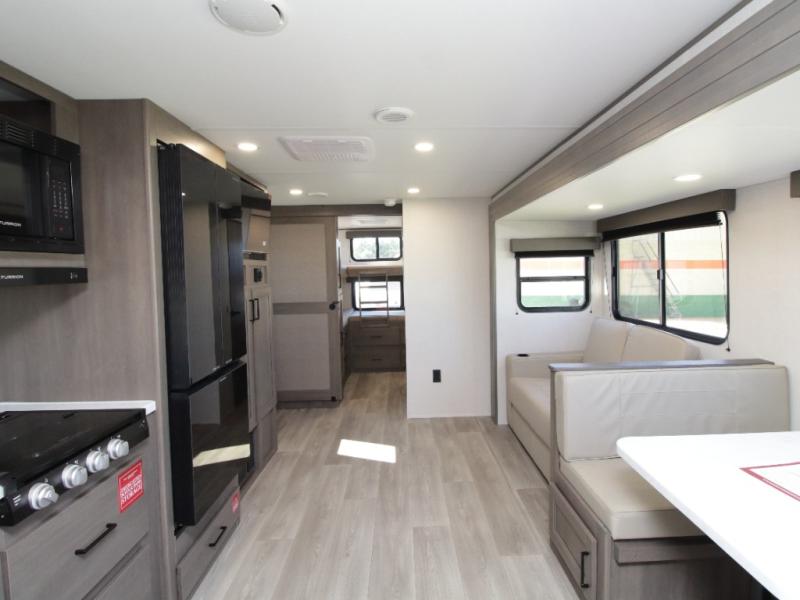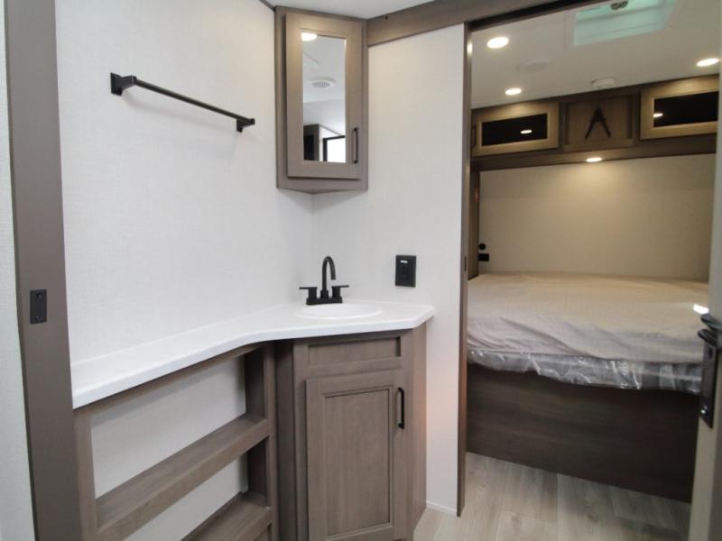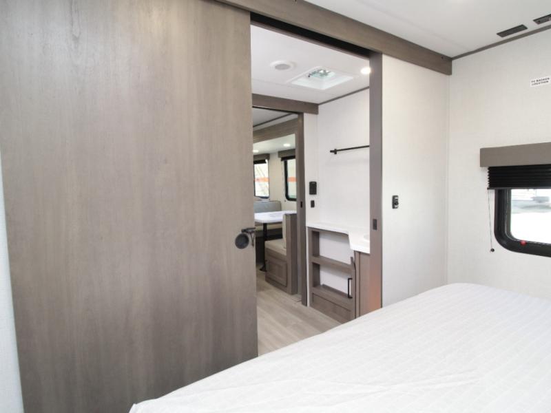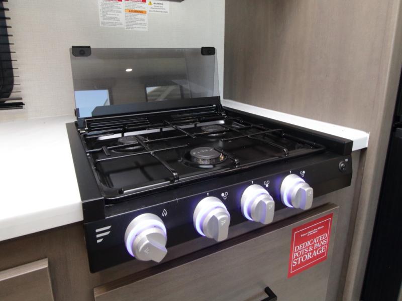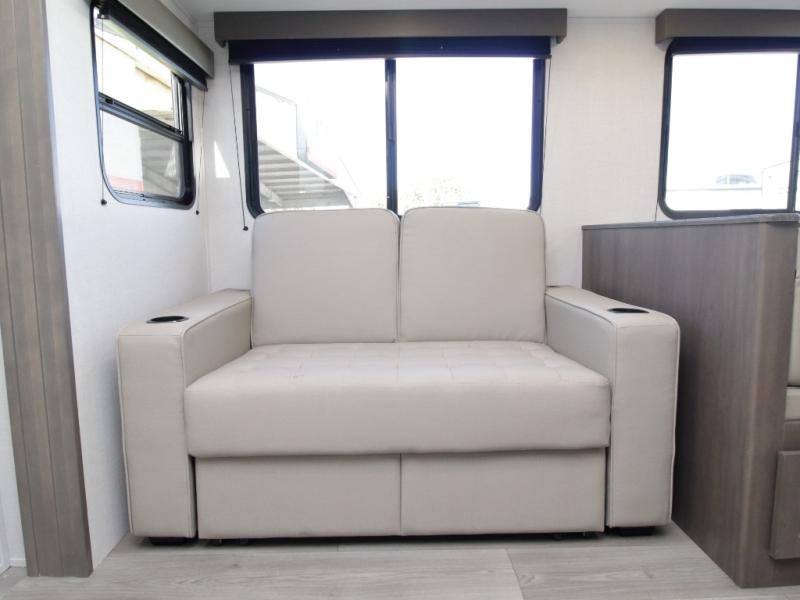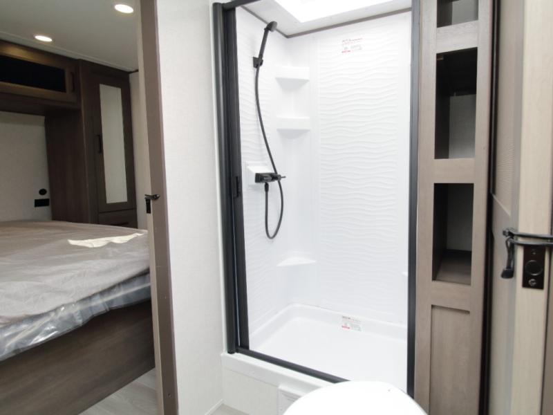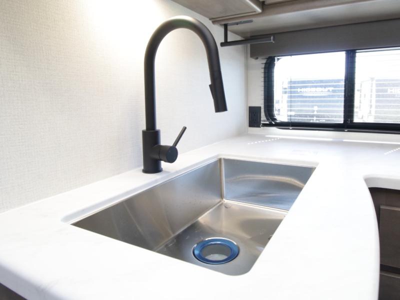 Enjoy high-end details such as thermoformed seamless countertops, JBL sound system with interior and exterior speakers, and multiple charging outlets throughout. The Solar Prep Package comes standard with a 200W solar panel, 30 AMP Bluetooth controller, and 2000W inverter prep, giving you the flexibility to enjoy off-grid adventures.
