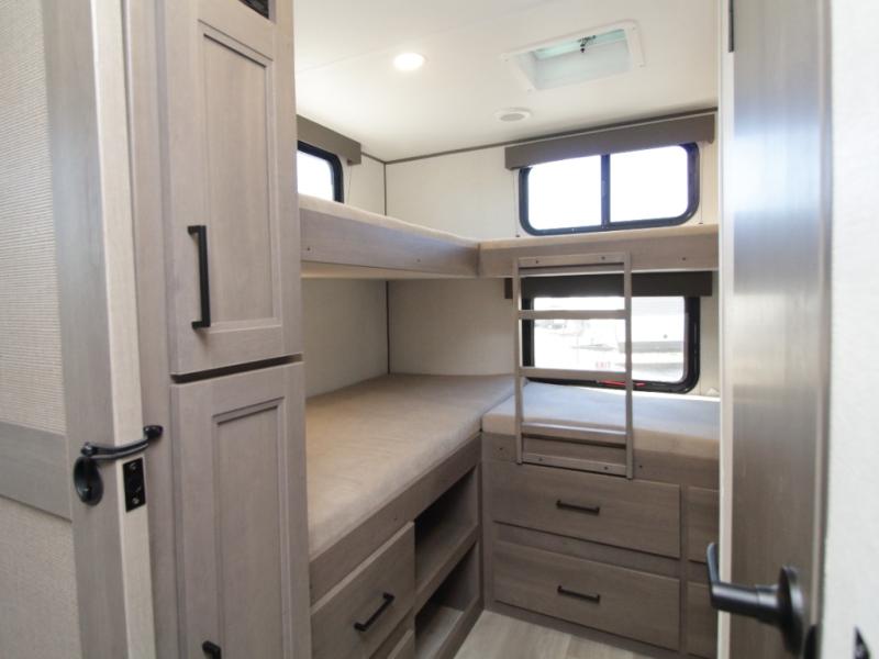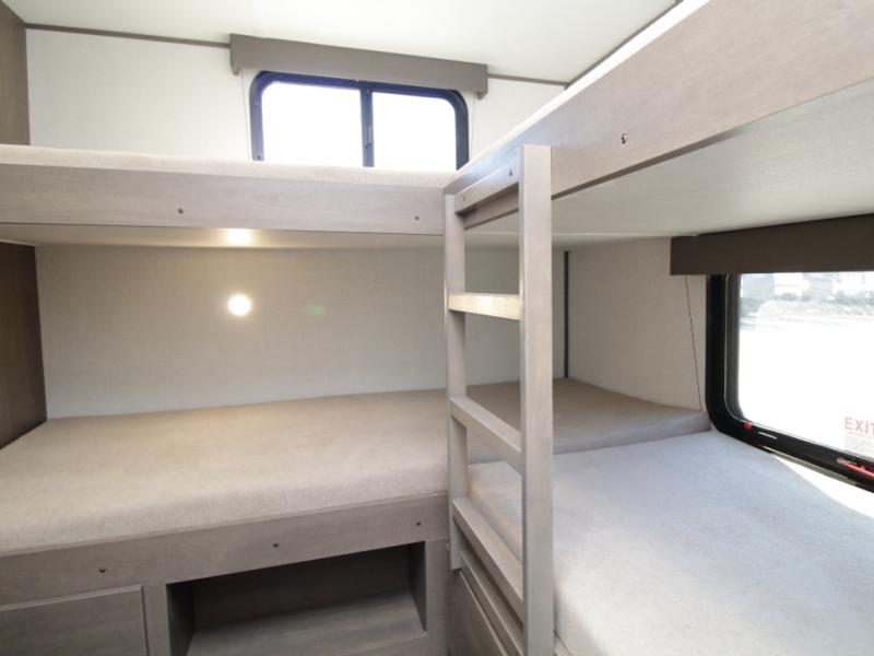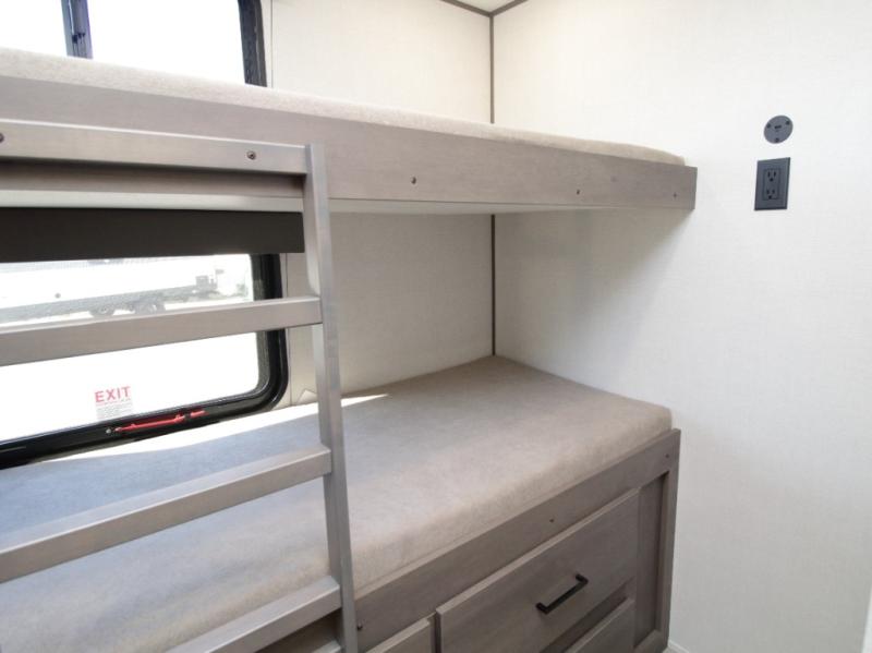 Rear Private Bunkhouse Suite – Includes four bunks, convenient storage drawers, and a private half bath for the kids or guests.