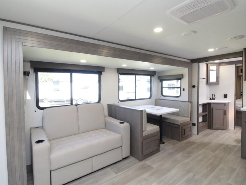 Spacious Living Area – Relax on the sleeper sofa or gather around the booth dinette while watching the 32" TV.