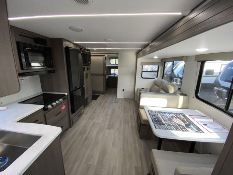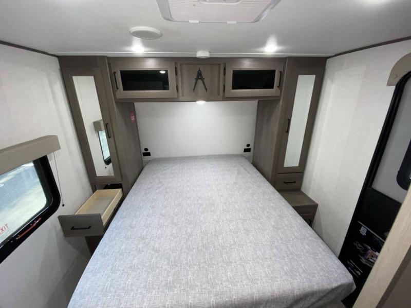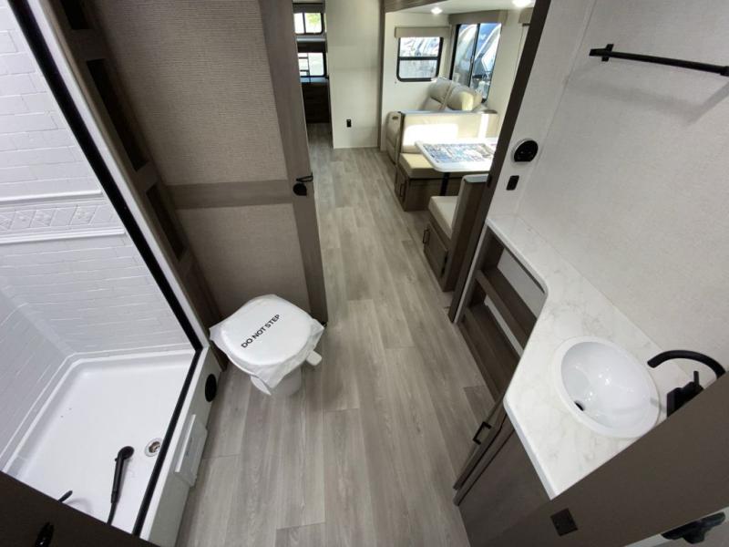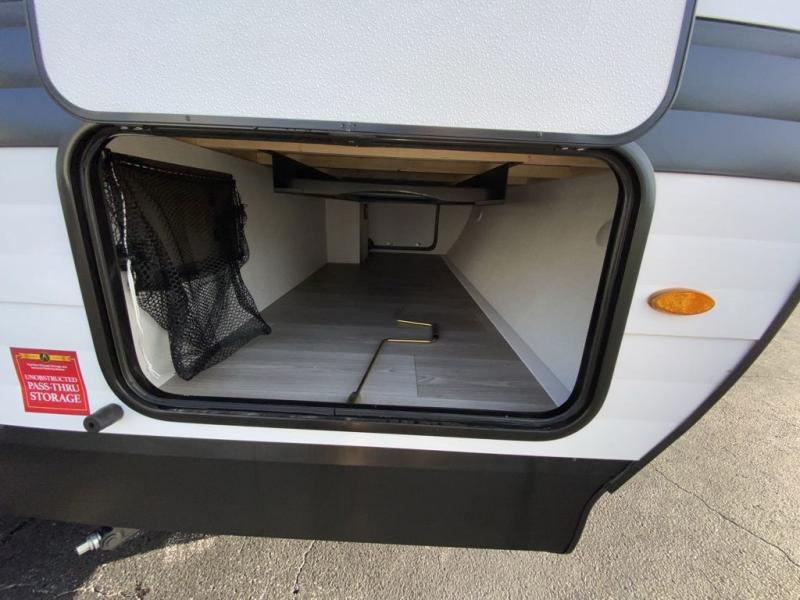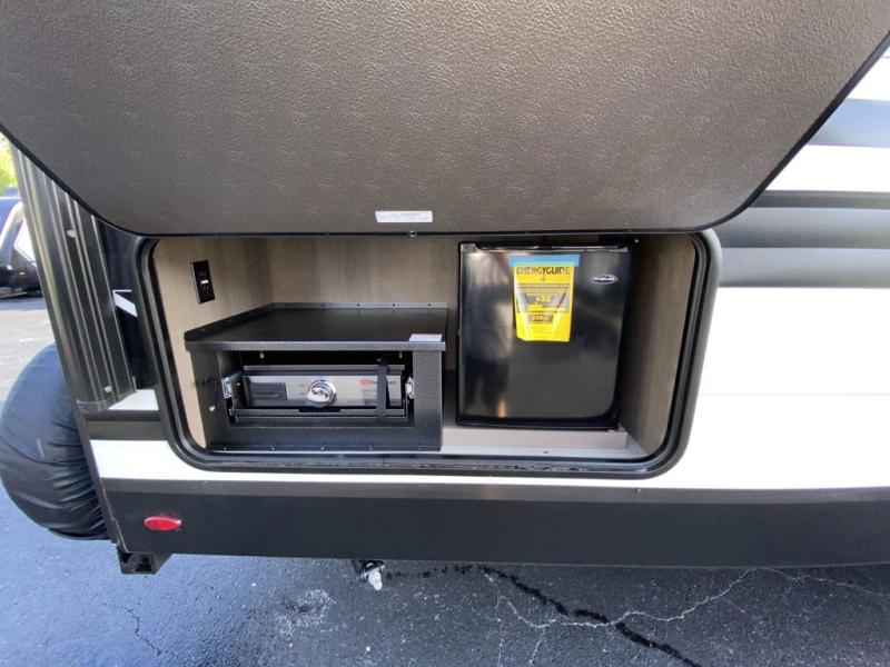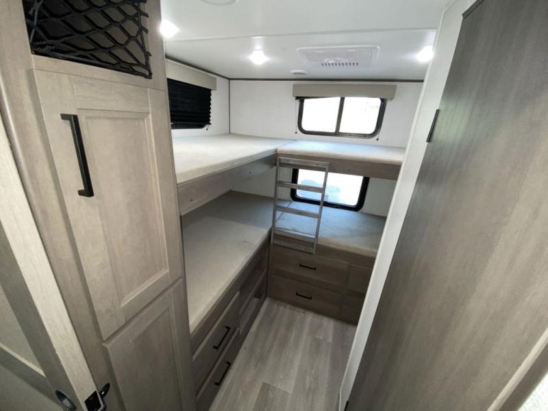 Your crew of nine will love camping in this spacious travel trailer! There are four bunks in the rear bunkhouse, along with storage drawers, and a convenient half bath! A full walk-thru bath will create a front master bedroom you are sure to love, especially with its queen bed, wardrobe storage, and private exterior entry door! The main living area will be a favorite place to hang out with its booth dinette, sleeper sofa and 32" TV. If the weather is nice, you may just find yourselves outdoors since there is an exterior griddle and 1.7 cu. ft. refrigerator!
