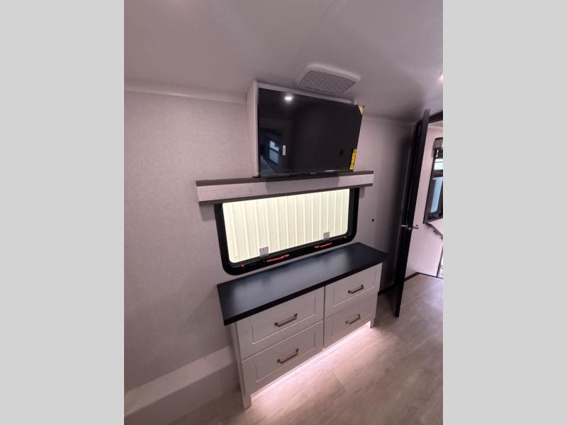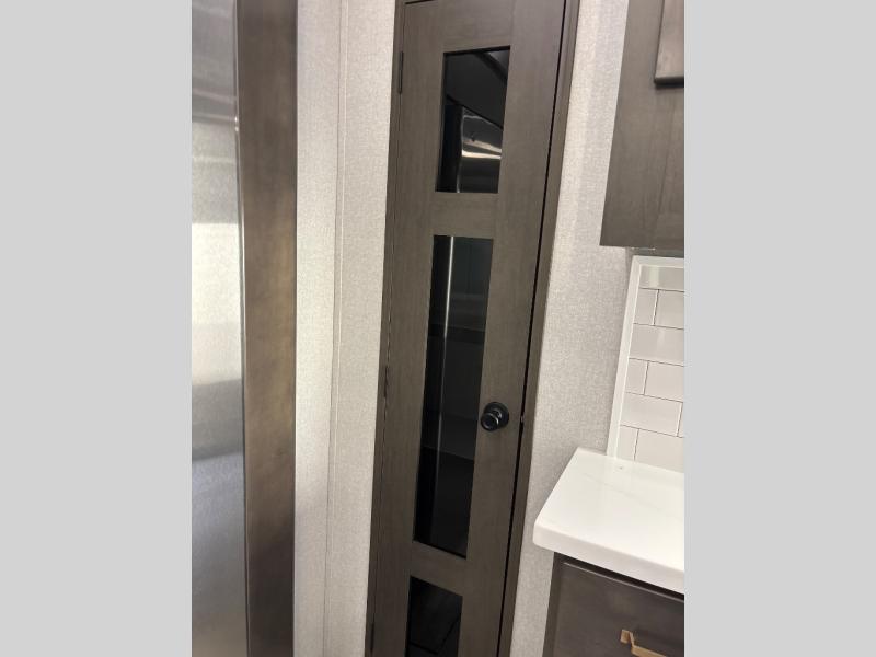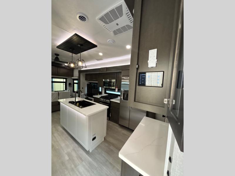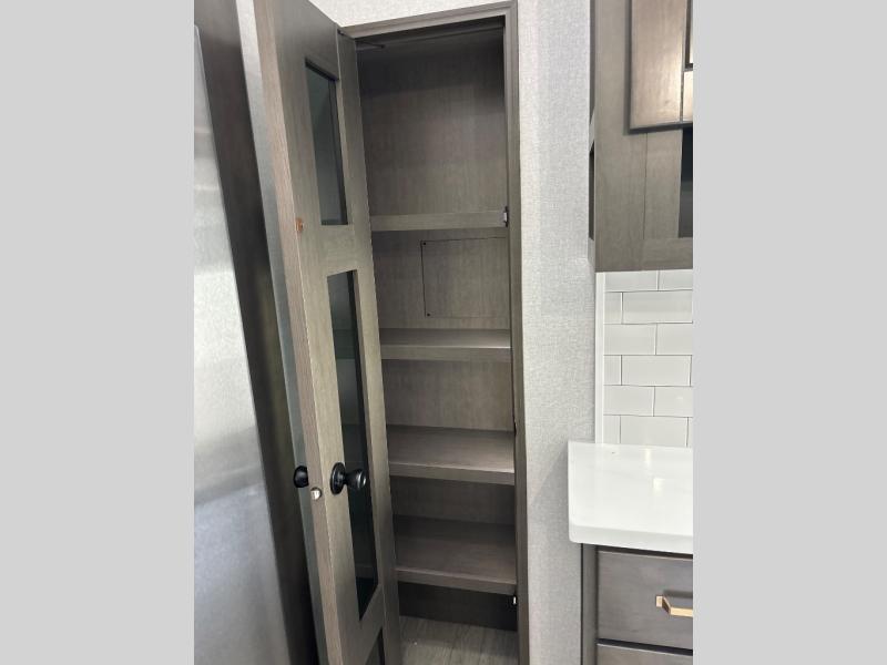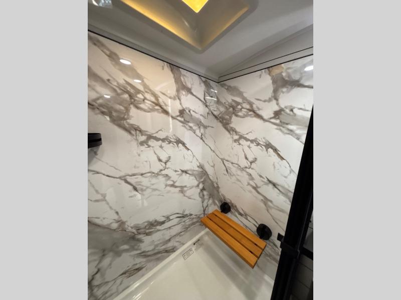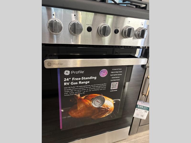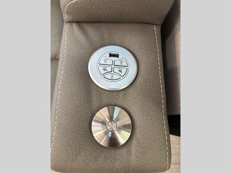 At the front of the unit, the spacious main bedroom offers a 72" x 80" king bed, providing ample room to relax and unwind. A wardrobe with drawers and a built-in hamper ensures plenty of organized storage for clothing and essentials, while a flip-up dresser across from the bed adds even more convenience. Moving down the hall, you’ll find a full bathroom featuring a large 36" x 48" shower with a built-in seat for added comfort. Toward the rear, the main living area has dual opposing slides that open up the space for maximum comfort and functionality. One slide hosts the fully equipped kitchen, complete with overhead cabinets, a convection microwave with built-in air fryer, a 24" range, and a 21-cu. ft. residential refrigerator, everything you need to cook in comfort. The central kitchen island features a residential “Do-It-All” sink with a pull-out faucet, glass rinse, vegetable rinse, and a pull-out cutting board for easy meal prep, while the corner pantry provides generous storage. Opposite the kitchen, you can relax in the theater seating or enjoy meals at the roll-out table. At the rear, a 78" hide-a-bed sofa offers additional lounging space or converts into extra-sleeping accommodations when needed.