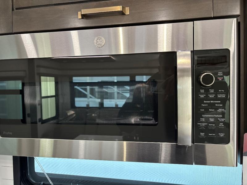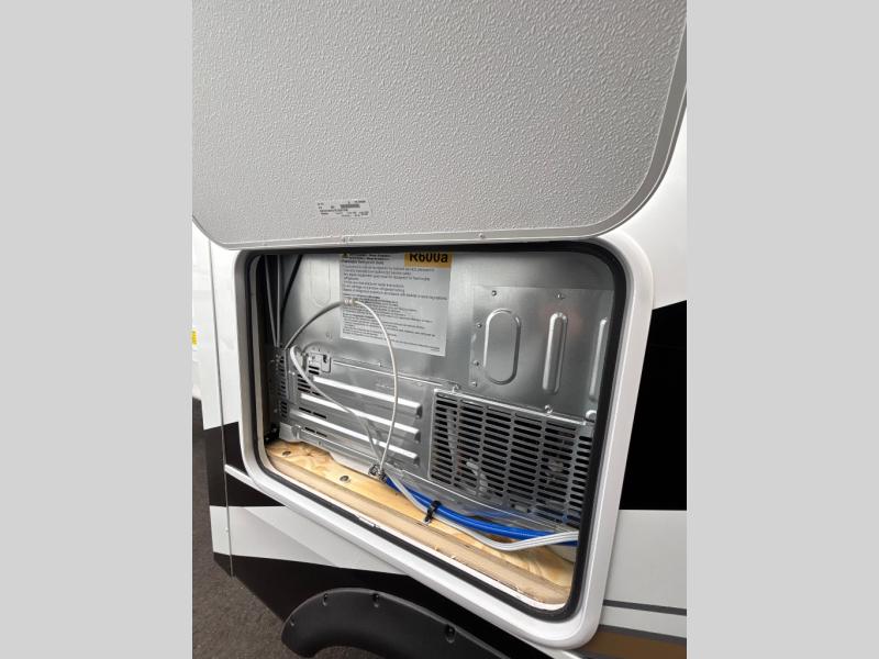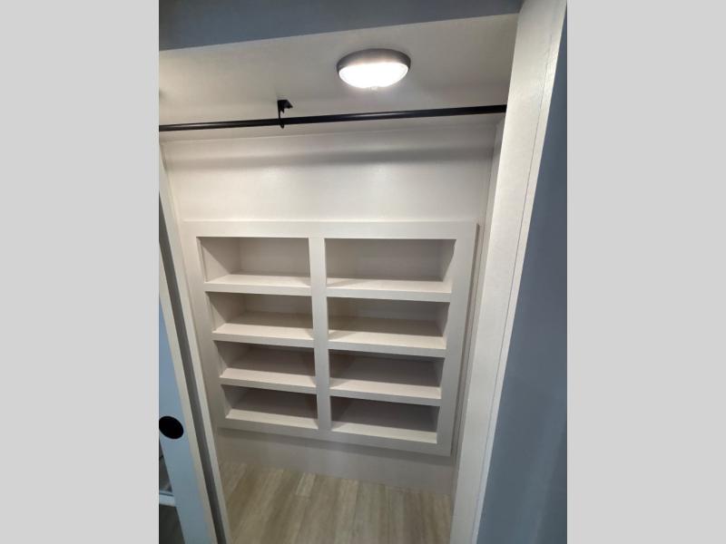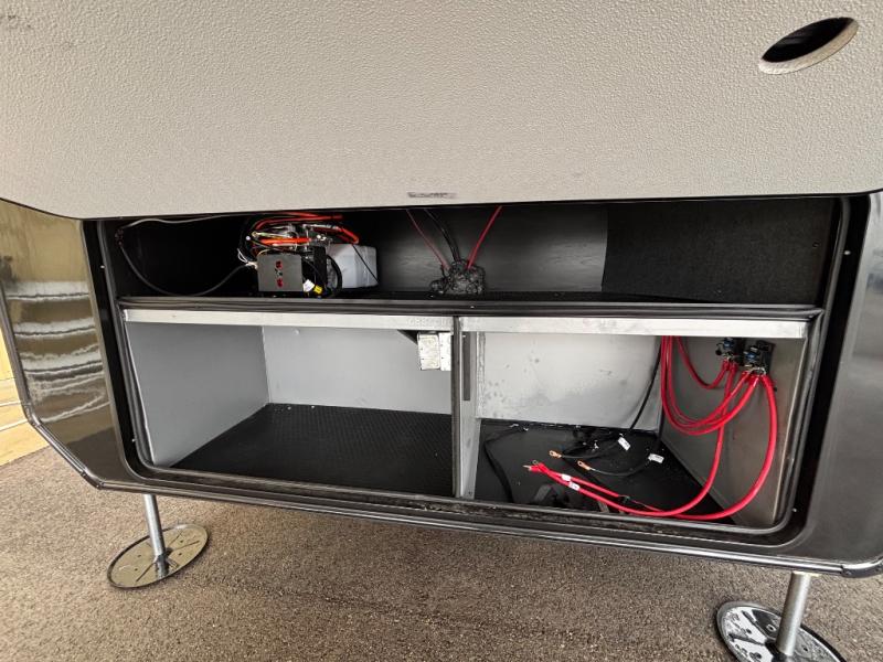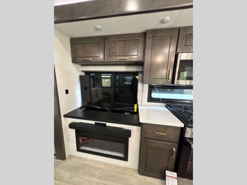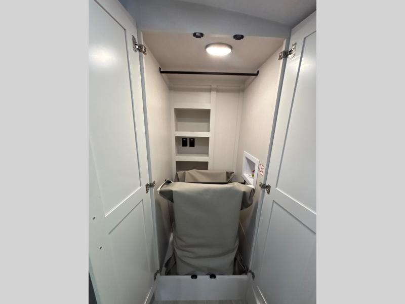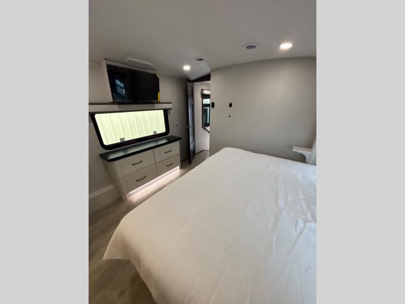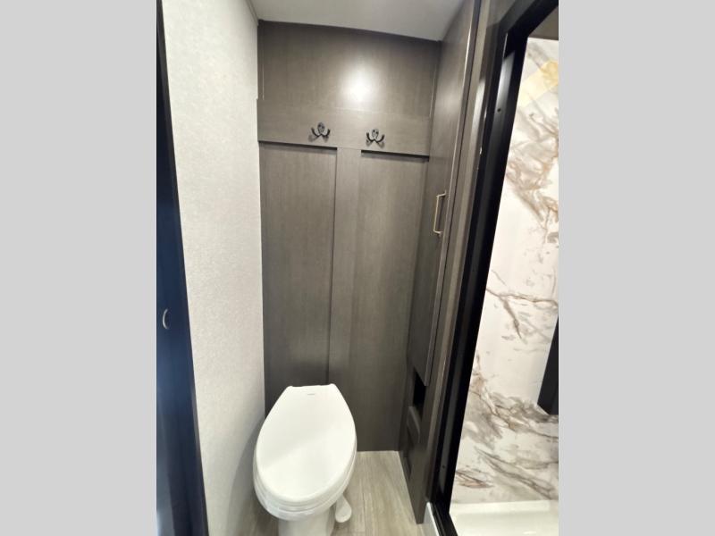 At the front of the unit, the spacious main bedroom offers a 72" x 80" king bed, providing ample room to relax and unwind. A wardrobe with drawers and a built-in hamper ensures plenty of organized storage for clothing and essentials, while a flip-up dresser across from the bed adds even more convenience. Moving down the hall, you’ll find a full bathroom featuring a large 36" x 48" shower with a built-in seat for added comfort. Toward the rear, the main living area has dual opposing slides that open up the space for maximum comfort and functionality. One slide hosts the fully equipped kitchen, complete with overhead cabinets, a convection microwave with built-in air fryer, a 24" range, and a 21-cu. ft. residential refrigerator, everything you need to cook in comfort. The central kitchen island features a residential “Do-It-All” sink with a pull-out faucet, glass rinse, vegetable rinse, and a pull-out cutting board for easy meal prep, while the corner pantry provides generous storage. Opposite the kitchen, you can relax in the theater seating or enjoy meals at the roll-out table. At the rear, a 78" hide-a-bed sofa offers additional lounging space or converts into extra-sleeping accommodations when needed.