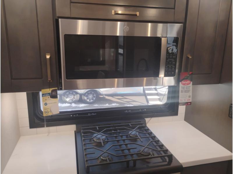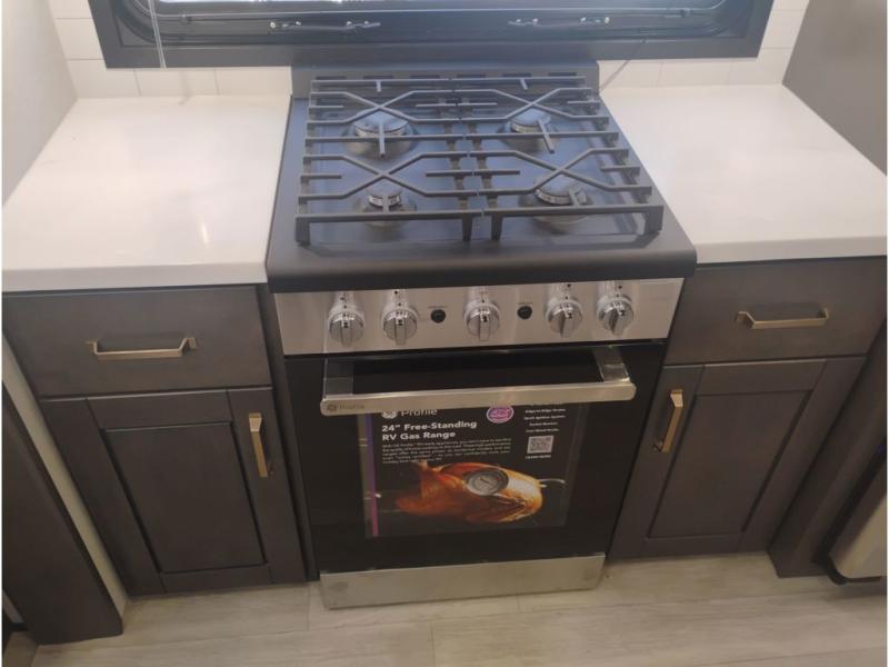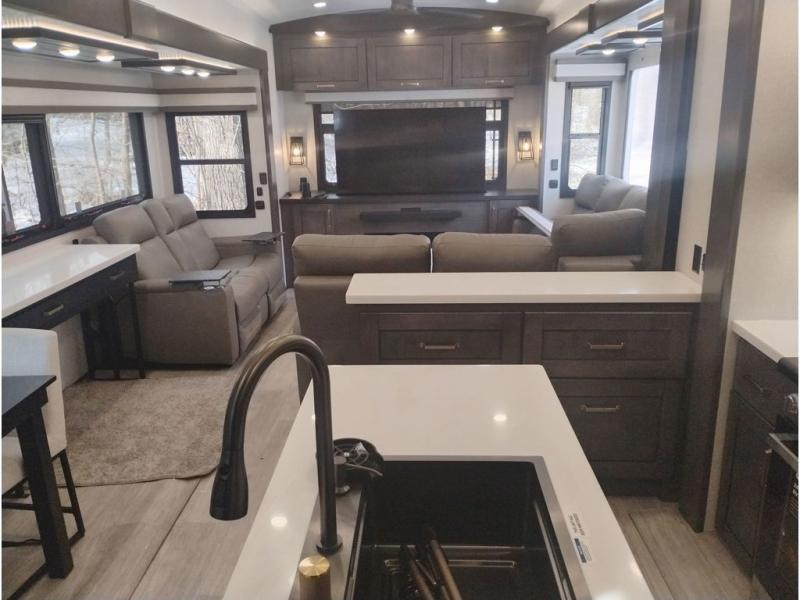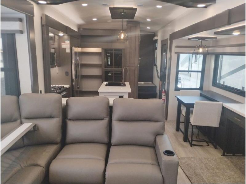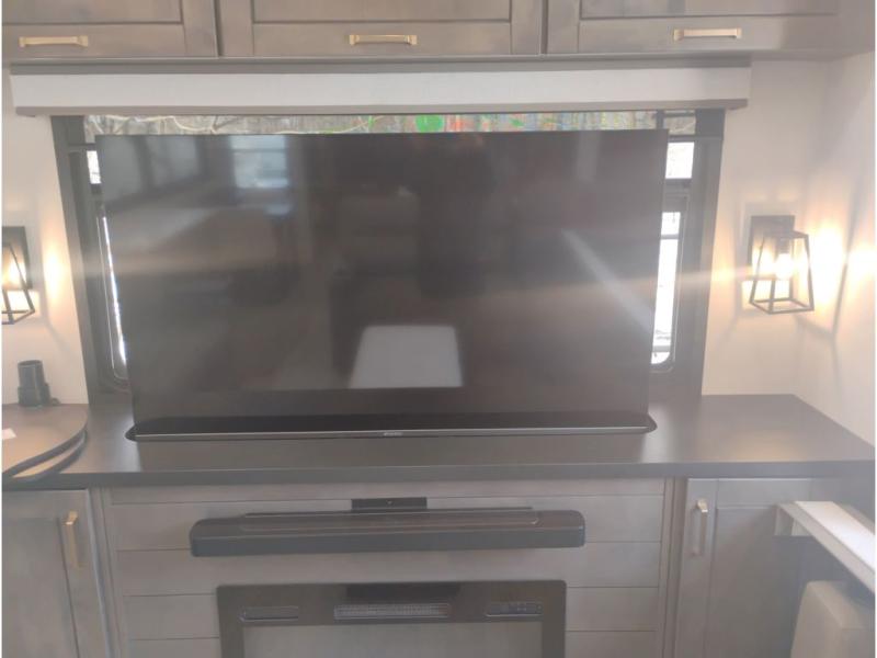 At the front of this 38RE layout, you’ll find a private bedroom featuring a spacious 72" x 80" king bed slide-out, creating a comfortable retreat to rest and recharge. The room also includes a wardrobe and dresser with a TV above, providing ample storage for clothing and essentials. Moving down the hall, the full bathroom offers both comfort and convenience with its 36" x 48" shower complete with a built-in seat for accessibility, plus linen shelves for added storage. At the heart of the unit, the kitchen is thoughtfully designed with everything needed to cook in comfort, including a pantry, a pull-out cutting board in the island, and a 21-cu. ft. refrigerator. Meal preparation is a breeze with the 24" range or the convection microwave featuring a built-in air fryer. Across from the kitchen, the large slide-out hosts a roll-out table perfect for dining or game nights, as well as a desk/coffee bar and cozy theater seating. At the rear, the entertainment center stands out with a TV lift and fireplace, while the L-shaped lounge and additional theater seat create the ultimate space to relax and enjoy movie nights in style.