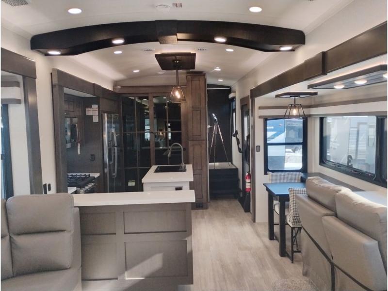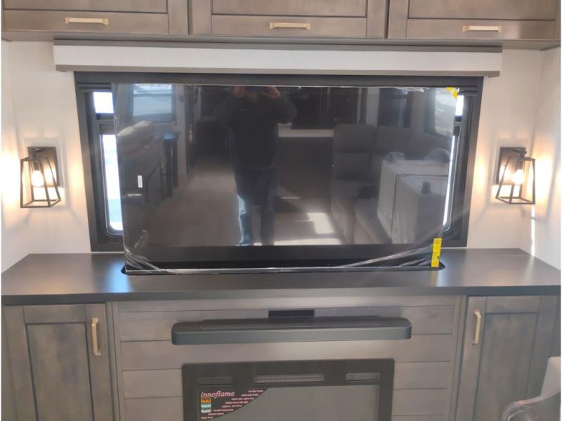 At the front of this 38RE layout, you’ll find a private bedroom featuring a spacious 72" x 80" king bed slide-out, creating a comfortable retreat to rest and recharge. The room also includes a wardrobe and dresser with a TV above, providing ample storage for clothing and essentials. Moving down the hall, the full bathroom offers both comfort and convenience with its 36" x 48" shower complete with a built-in seat for accessibility, plus linen shelves for added storage. At the heart of the unit, the kitchen is thoughtfully designed with everything needed to cook in comfort, including a pantry, a pull-out cutting board in the island, and a 21-cu. ft. refrigerator. Meal preparation is a breeze with the 24" range or the convection microwave featuring a built-in air fryer. Across from the kitchen, the large slide-out hosts a roll-out table perfect for dining or game nights, as well as a desk/coffee bar and cozy theater seating. At the rear, the entertainment center stands out with a TV lift and fireplace, while the L-shaped lounge and additional theater seat create the ultimate space to relax and enjoy movie nights in style.