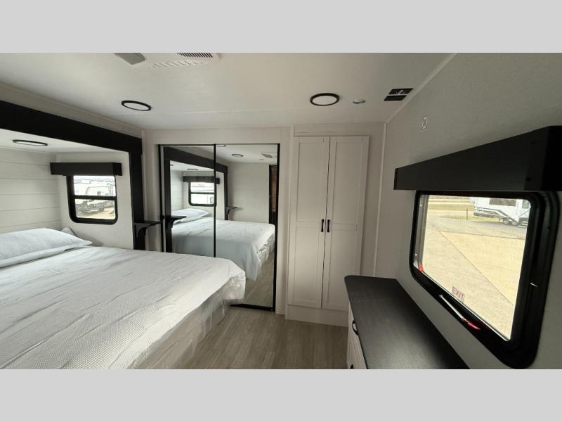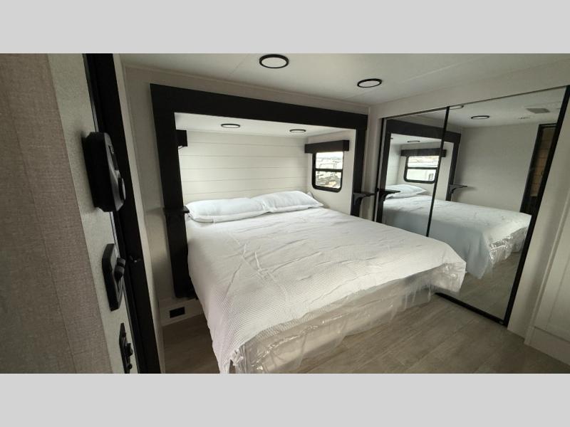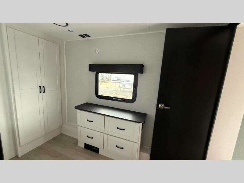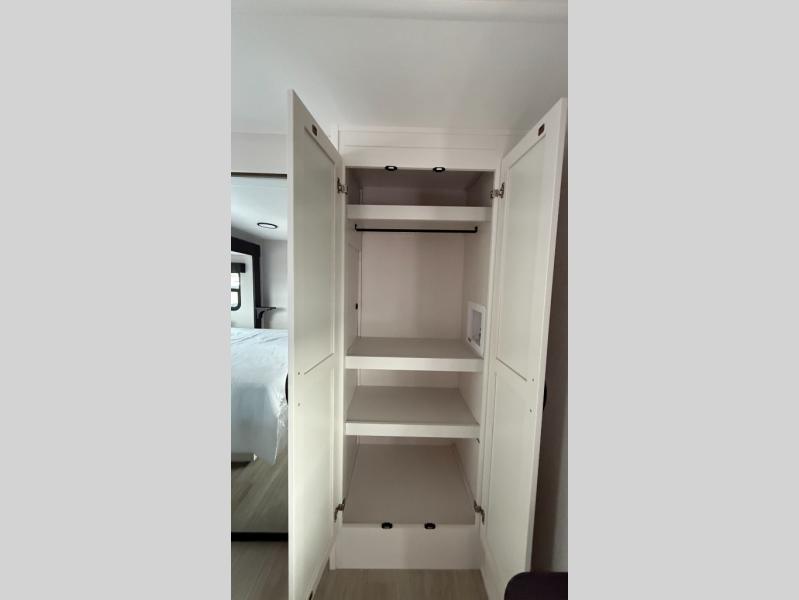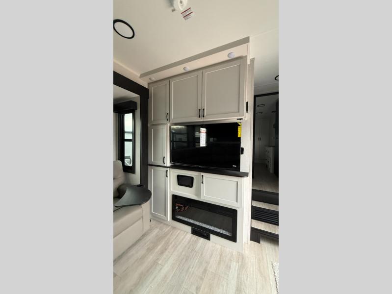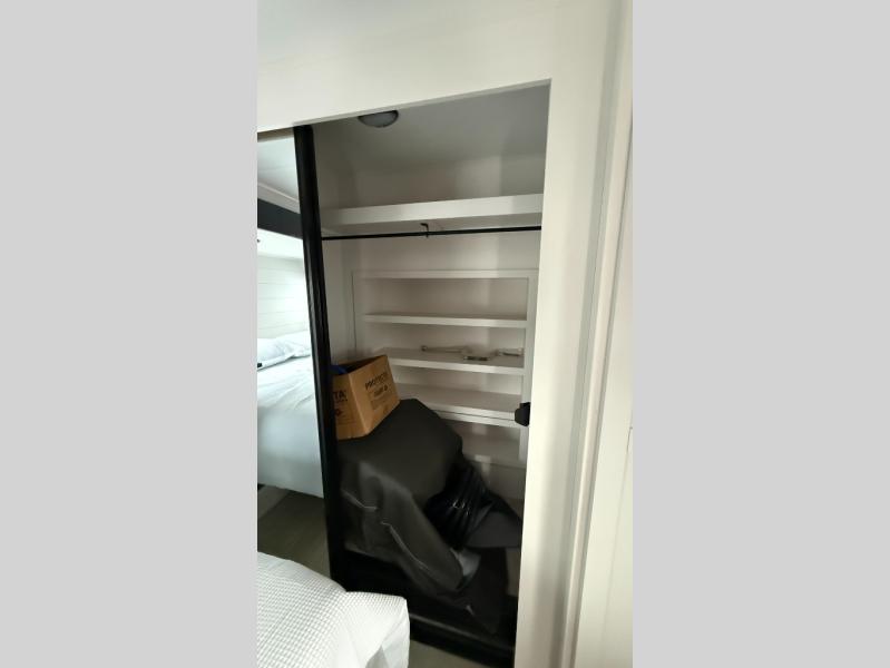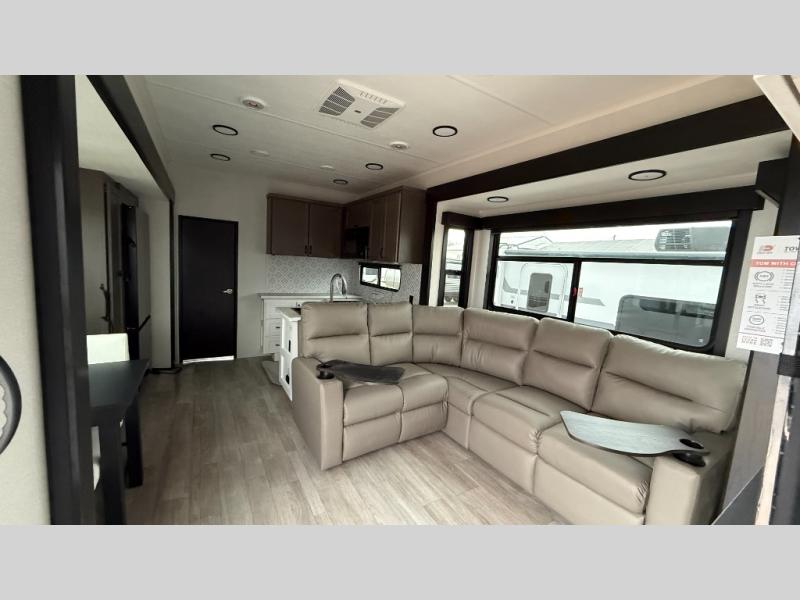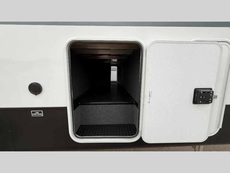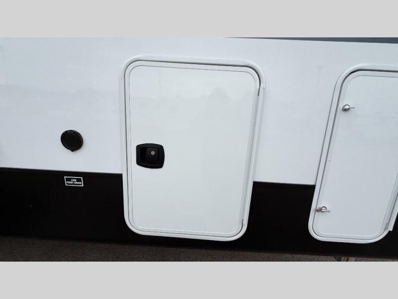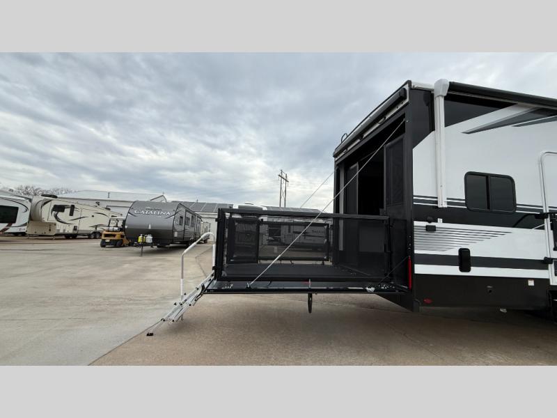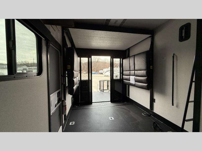 The 13' 6" garage is the perfect space for your toys, with enough room for your ATV, motorcycle, or other gear. Plus, the electric queen bed provides a comfortable spot to rest after a long day. The overhead loft with storage provides additional space for your gear, keeping it out of the way but still accessible. The kitchen is fully equipped with a microwave, sink, overhead cabinets, pantry, and coffee bar. The L-shaped sofa provides ample seating for relaxation, and the TV is perfectly positioned for viewing. The full bathroom is a welcome convenience, providing a private space to freshen up. Also, the front bedroom is a luxurious retreat, featuring a king bed, a walk-in closet, and drawers, and on the exterior, the two entry/exit doors provide easy access to the outside, making it perfect for loading and unloading your gear.