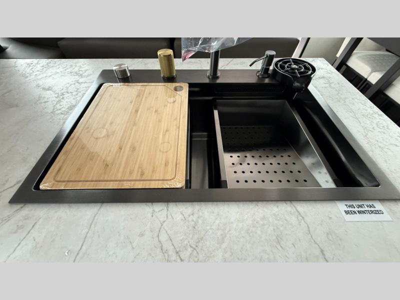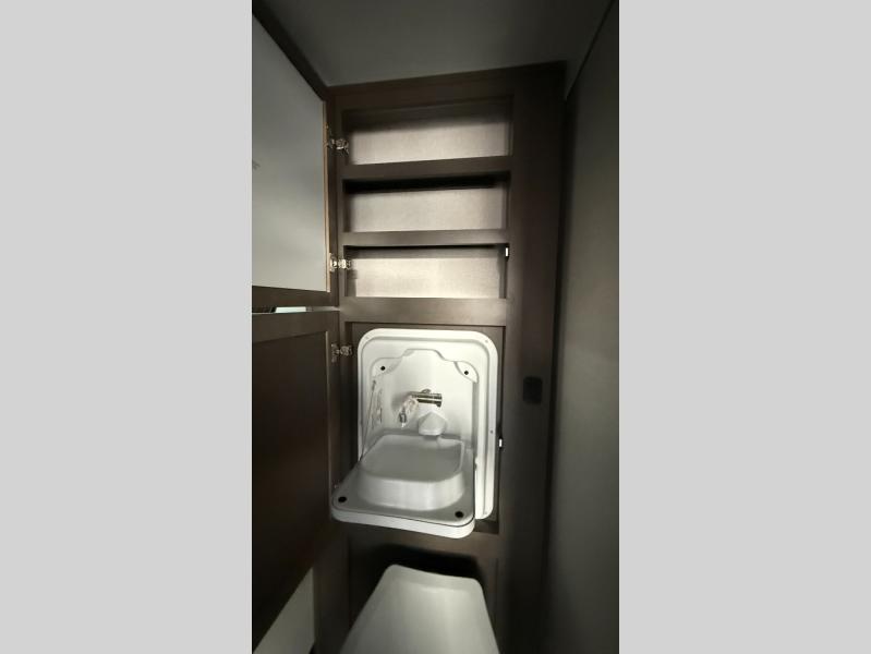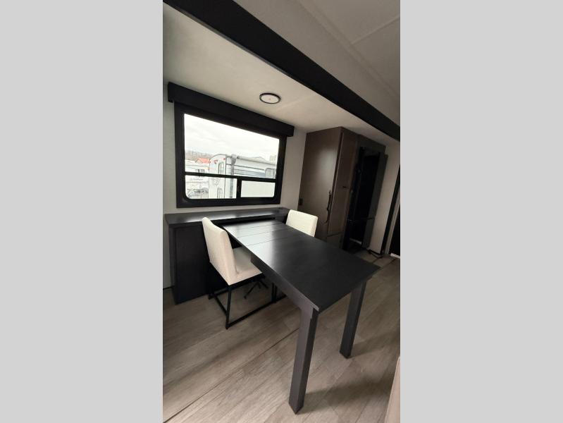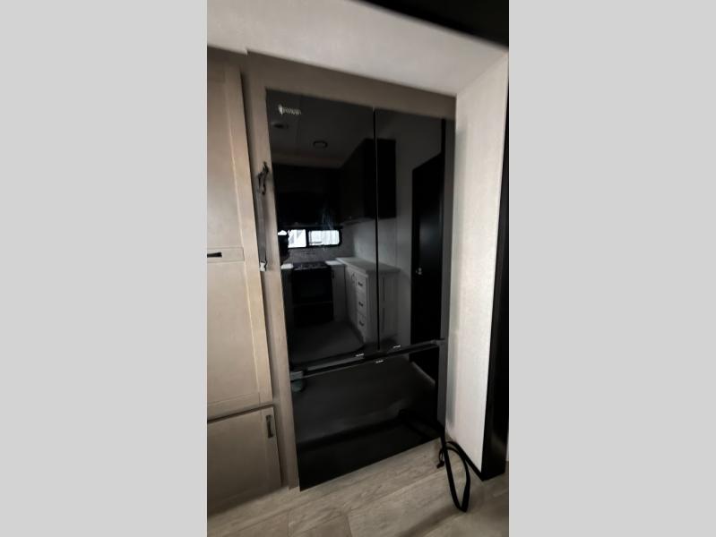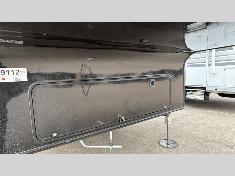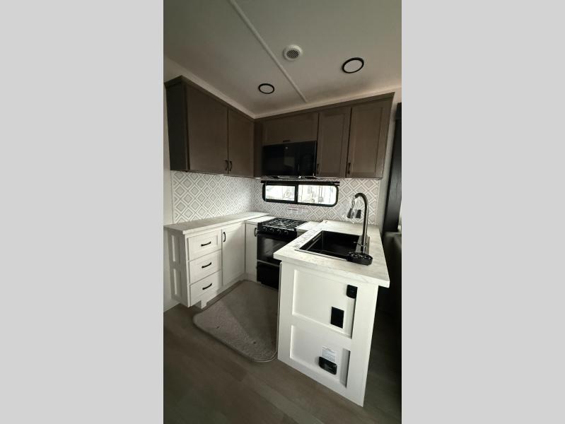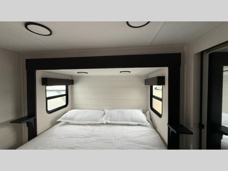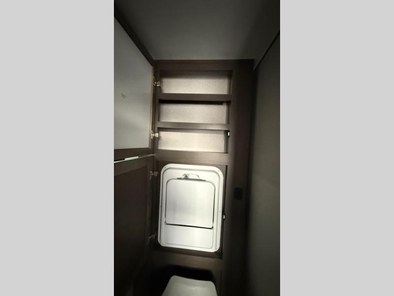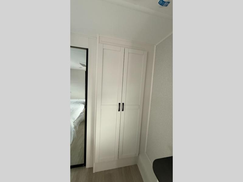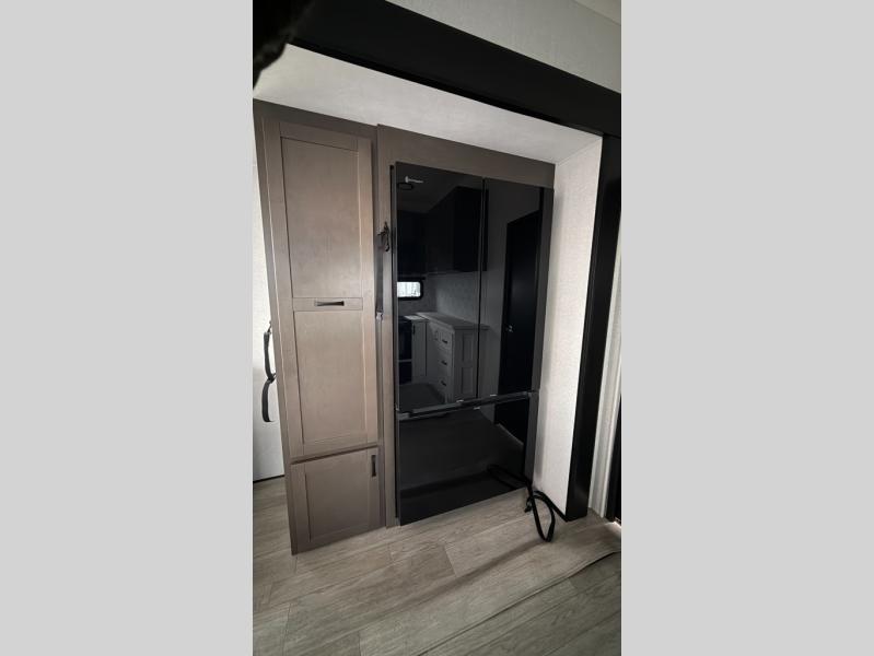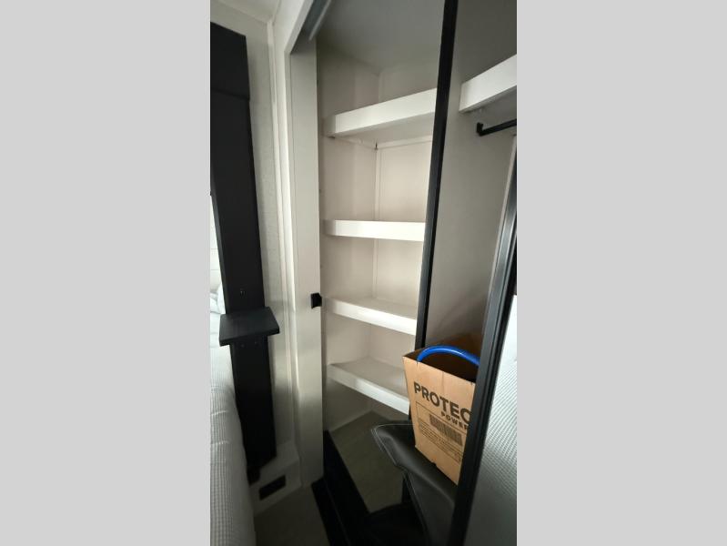 The 13' 6" garage is the perfect space for your toys, with enough room for your ATV, motorcycle, or other gear. Plus, the electric queen bed provides a comfortable spot to rest after a long day. The overhead loft with storage provides additional space for your gear, keeping it out of the way but still accessible. The kitchen is fully equipped with a microwave, sink, overhead cabinets, pantry, and coffee bar. The L-shaped sofa provides ample seating for relaxation, and the TV is perfectly positioned for viewing. The full bathroom is a welcome convenience, providing a private space to freshen up. Also, the front bedroom is a luxurious retreat, featuring a king bed, a walk-in closet, and drawers, and on the exterior, the two entry/exit doors provide easy access to the outside, making it perfect for loading and unloading your gear.
