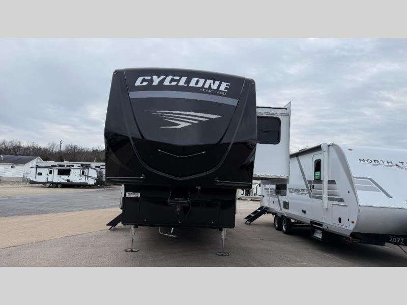 Satisfy your wanderlust with a Heartland Cyclone fifth wheel toy hauler! You won't have to sacrifice any luxury either, with indulgent features like the ducted, fully enclosed, and heated underbelly provides added protection and warmth. Inside, the LED interior lighting throughout ensures that every corner of your RV is bright and inviting, and the bathroom skylight brings in natural light and fresh air, creating a welcoming and refreshing space. Plus, the central command center with built-in tank monitoring keeps you informed and in control, making it easy to manage your resources. Also, the Premium Exterior Package includes diverse features such as Dexter axles with ABS and tow assist with sway mitigation, and the Keyed-Alike lock system ensures that all your locks are keyed the same, providing added security and convenience. Come find the perfect model for you today!