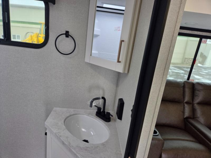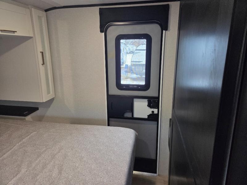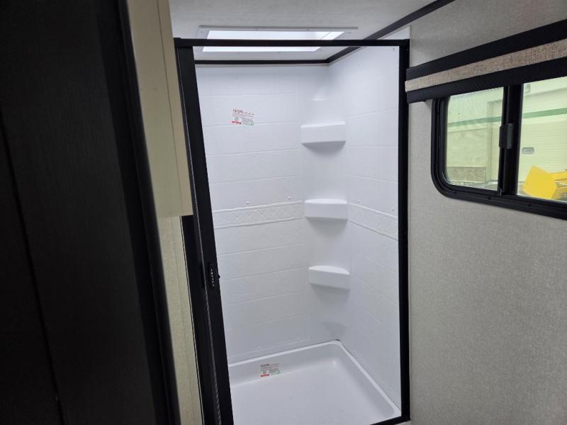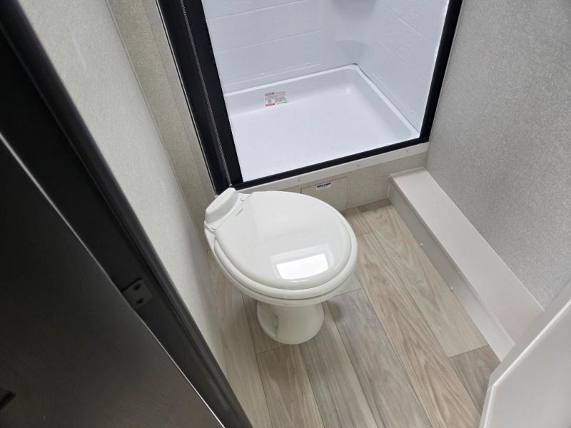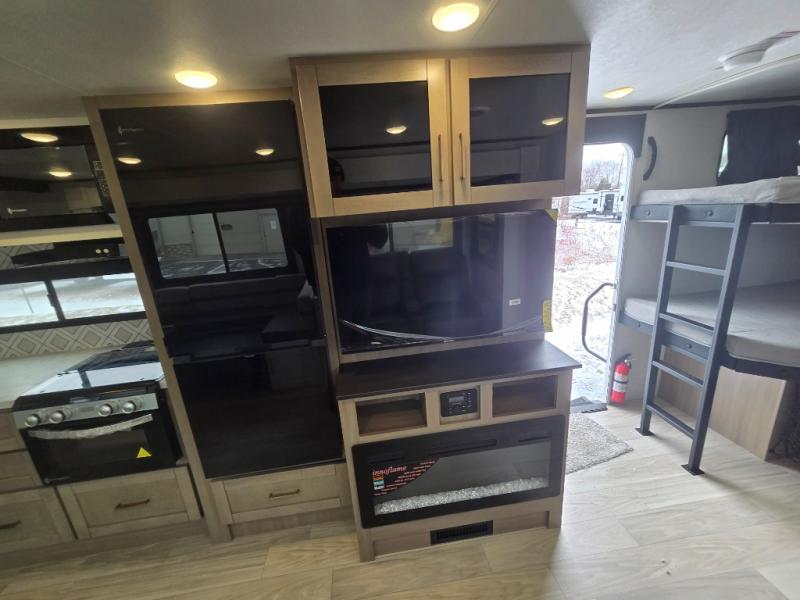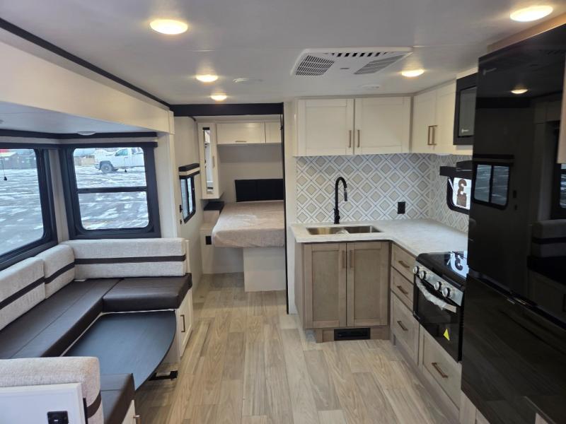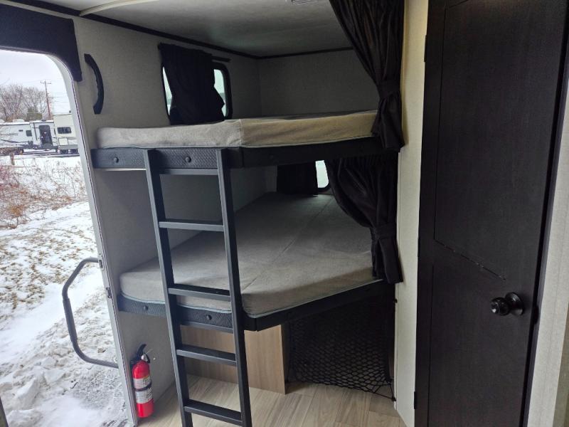 At the front of this trailer, you'll find a private bedroom featuring a 60" x 80" queen bed, complete with pull-out nightstands on each side for storing your essentials. This bedroom also includes one of the two convenient entry doors. In the center of the trailer, a spacious slide-out houses a 60" tri-fold sofa for relaxing, along with a roomy 40" x 82" U-dinette perfect for dining, game nights, or gathering with friends and family. Both the sofa and dinette convert into additional sleeping space when needed. Across from the slide is a fully equipped kitchen with a stainless-steel sink, 11 cu. ft. refrigerator, microwave, and overhead cabinets, plus a walk-in pantry offering plenty of room for snacks and dry goods. In the rear, one corner features two bunks with flip-up storage and a handy kayak door for easy gear access. The opposite corner holds a full bathroom with a 30" x 36" shower, foot-flush toilet, and corner sink. Just next the bunks is the second entry door, adding extra convenience for busy camping days.