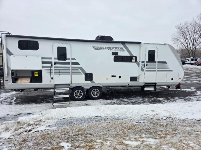 Built for comfort, durability, and modern convenience, these Heartland North Trail travel trailers offer everything you need for a premium camping experience. Each model features a strong American-made Norco Z-frame with an aerodynamic front profile and front diamond plating for added protection. The exclusive TrusstXL Roof System and CoreShield vacuum-bonded walls with Azdel provide superior insulation. Inside, enjoy residential comforts like seamless countertops, solid hardwood maple cabinet doors, LED lighting throughout, and 60 x 80 in. queen beds or 60 x 76 in. Murphy beds. Tech-ready features include an LED smart TV, USB ports, TPMS monitoring, and a 200W solar panel with 30 AMP digital controller. With a Quiet Series A/C, on-demand 60K BTU water heater, with these trailers you are equipped to make every trip comfortable and adventure-ready.