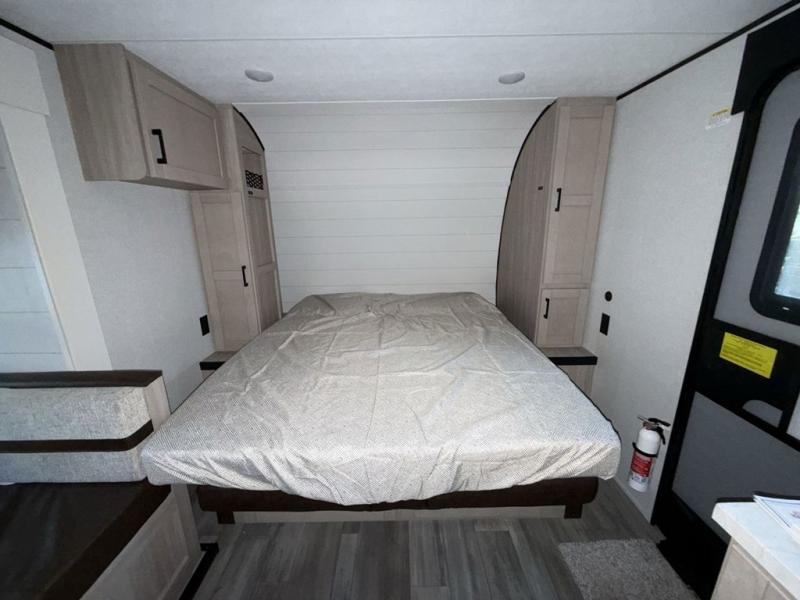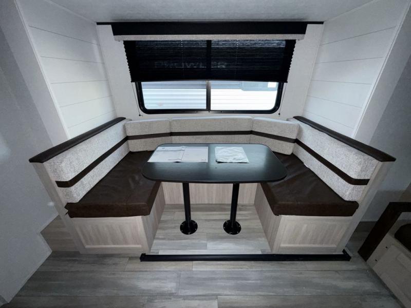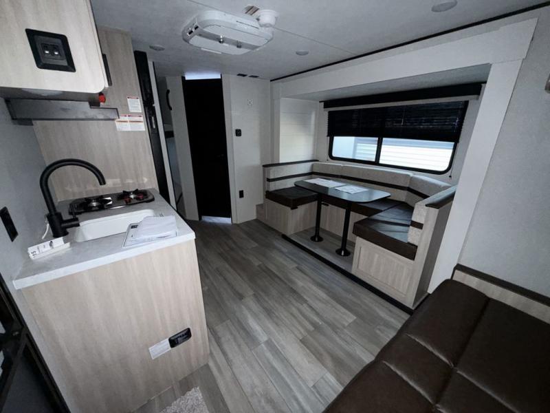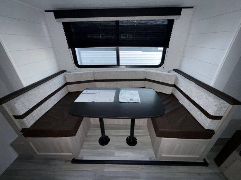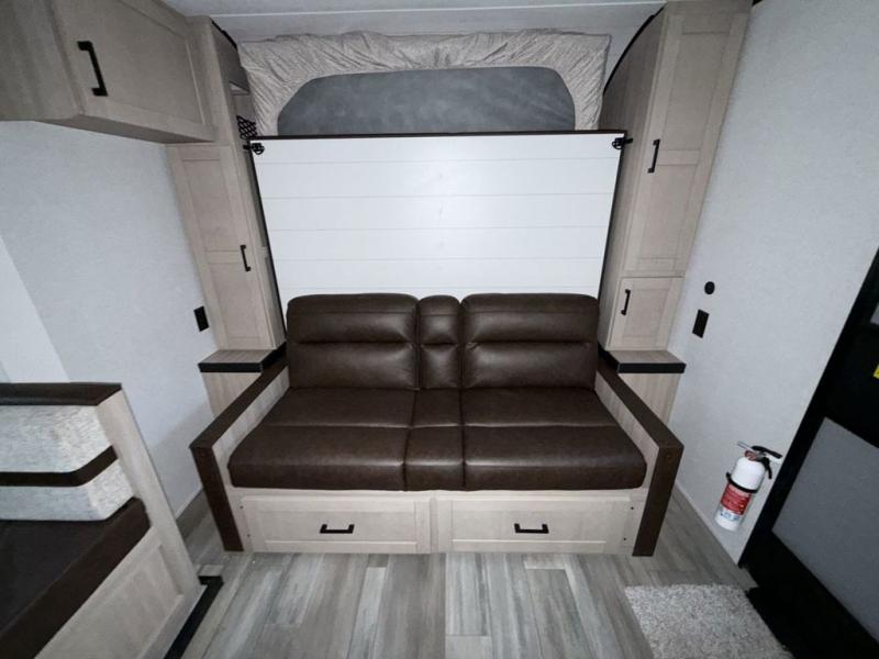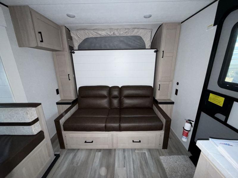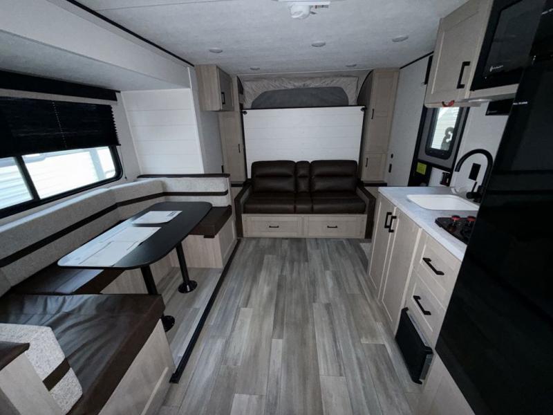 Camping trips are made easy in this travel trailer with double-size bunk beds for guests or little ones. There is a front Murphy bed that will provide you with more space during the day when you put it away to reveal the jack knife sofa. The rear corner full bath includes a foot-flush toilet, a 30" x 36" shower and a sink, so you won't have to leave the camper in the middle of the night. A two-burner cooktop and microwave oven will let you make meals each day, and you can dine around the U-shaped dinette, which is also within a slide out for more space!