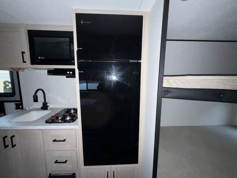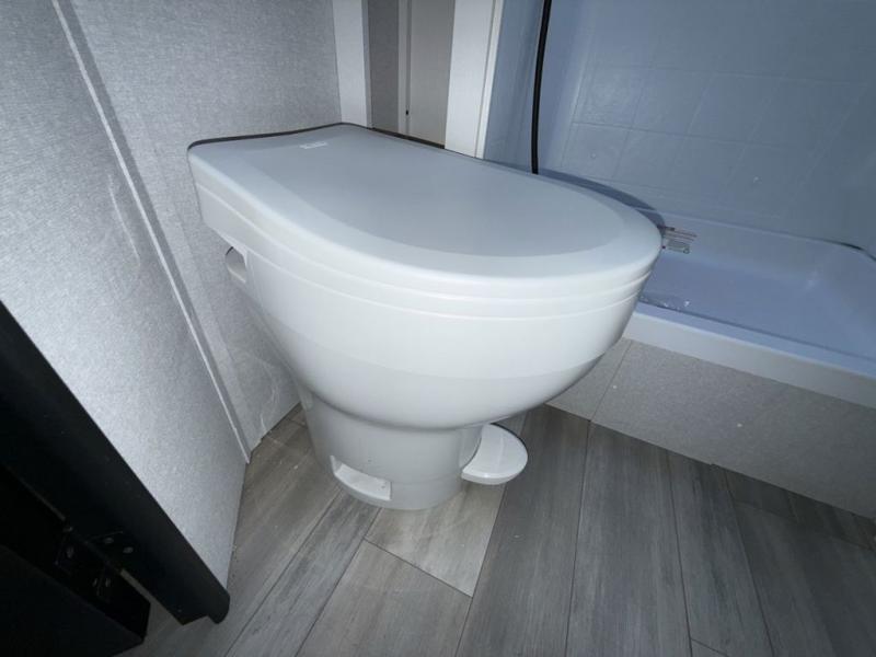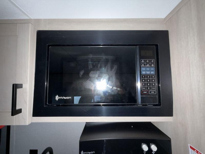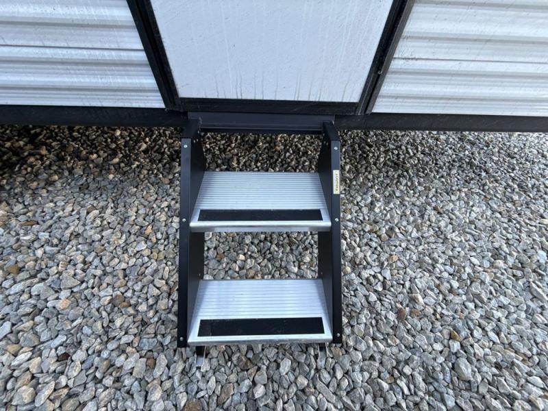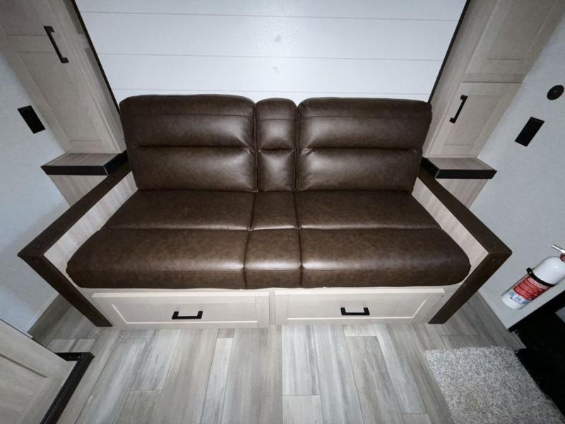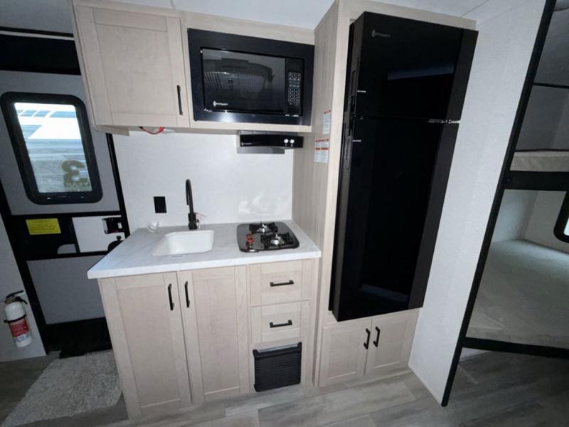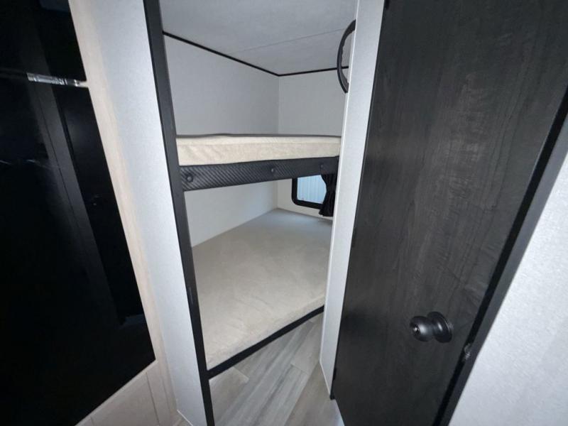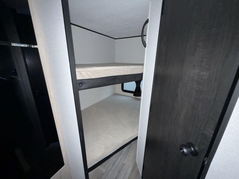 Camping trips are made easy in this travel trailer with double-size bunk beds for guests or little ones. There is a front Murphy bed that will provide you with more space during the day when you put it away to reveal the jack knife sofa. The rear corner full bath includes a foot-flush toilet, a 30" x 36" shower and a sink, so you won't have to leave the camper in the middle of the night. A two-burner cooktop and microwave oven will let you make meals each day, and you can dine around the U-shaped dinette, which is also within a slide out for more space!