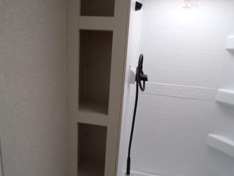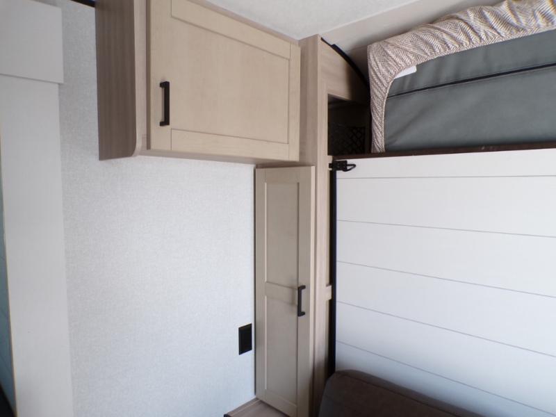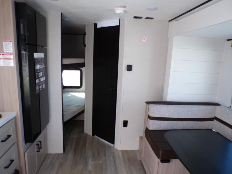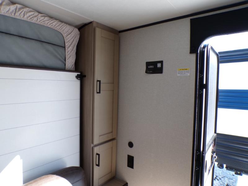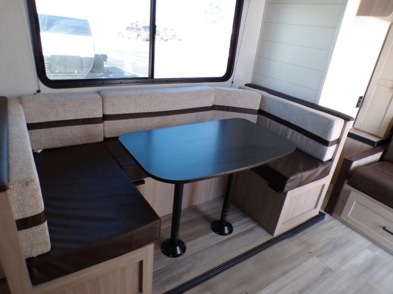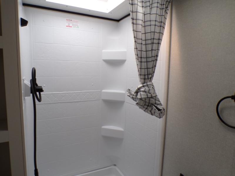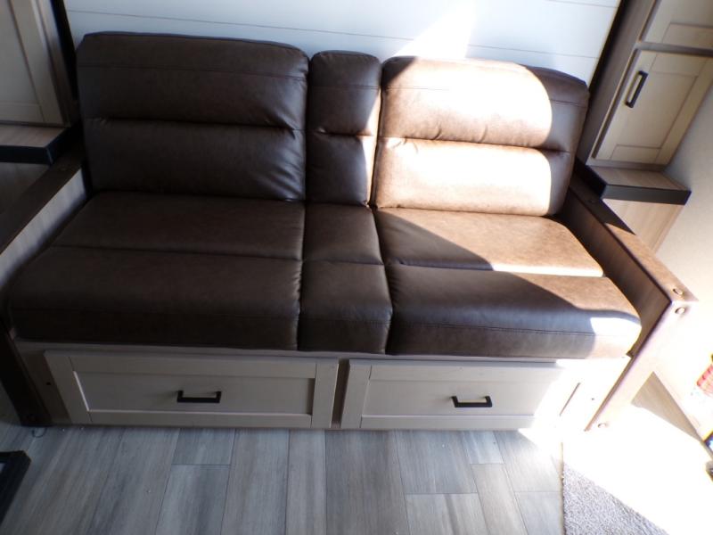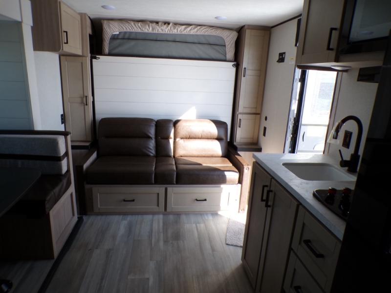 Camping trips are made easy in this travel trailer with double-size bunk beds for guests or little ones. There is a front Murphy bed that will provide you with more space during the day when you put it away to reveal the jack knife sofa. The rear corner full bath includes a foot-flush toilet, a 30" x 36" shower and a sink, so you won't have to leave the camper in the middle of the night. A two-burner cooktop and microwave oven will let you make meals each day, and you can dine around the U-shaped dinette, which is also within a slide out for more space!