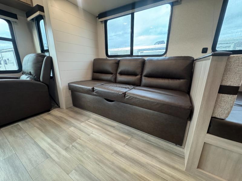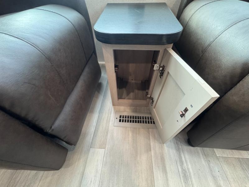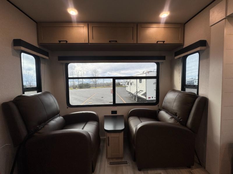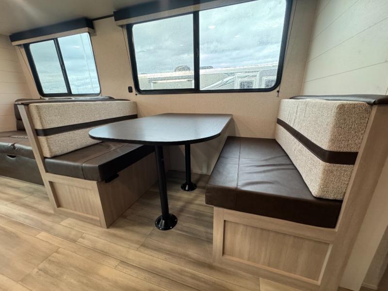Time spent in this spacious travel trailer will be time well spent! Once you arrive at your campsite, you can put out the 18' power awning and relax in your camp chairs. The dual entry doors will allow you to enter in through the rear living room with dual lounge chairs, or the front private bedroom with an RV queen bed! The chef of your group can make lunch on the three-burner cooktop or in the microwave oven, and there is a booth dinette where you can dine together. Your guests can convert the dinette to sleeping space at night, along with the jack-knife sofa!