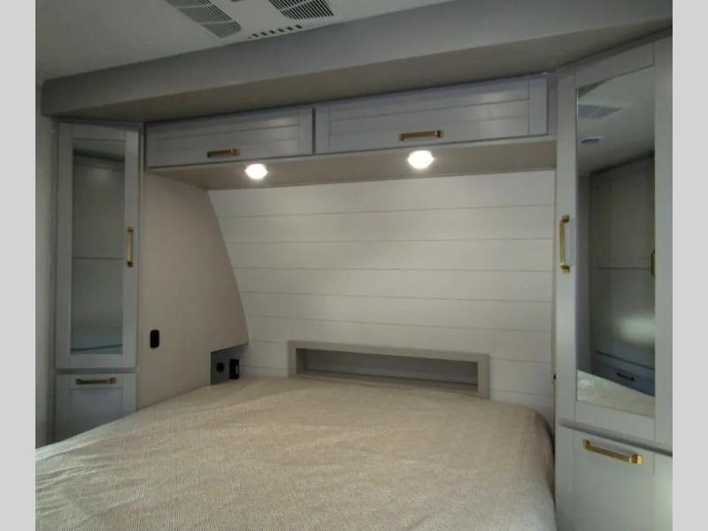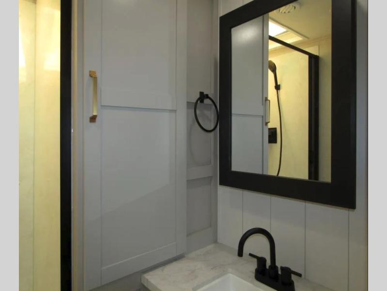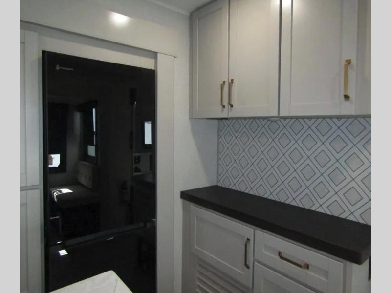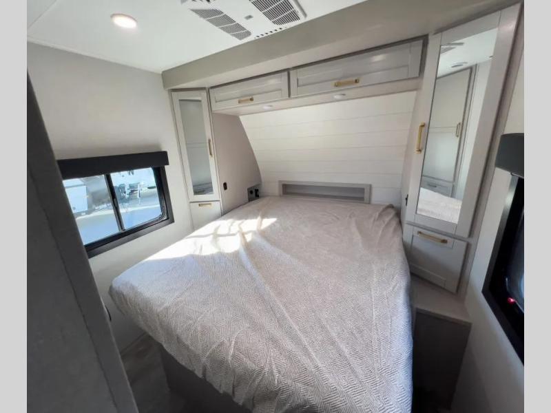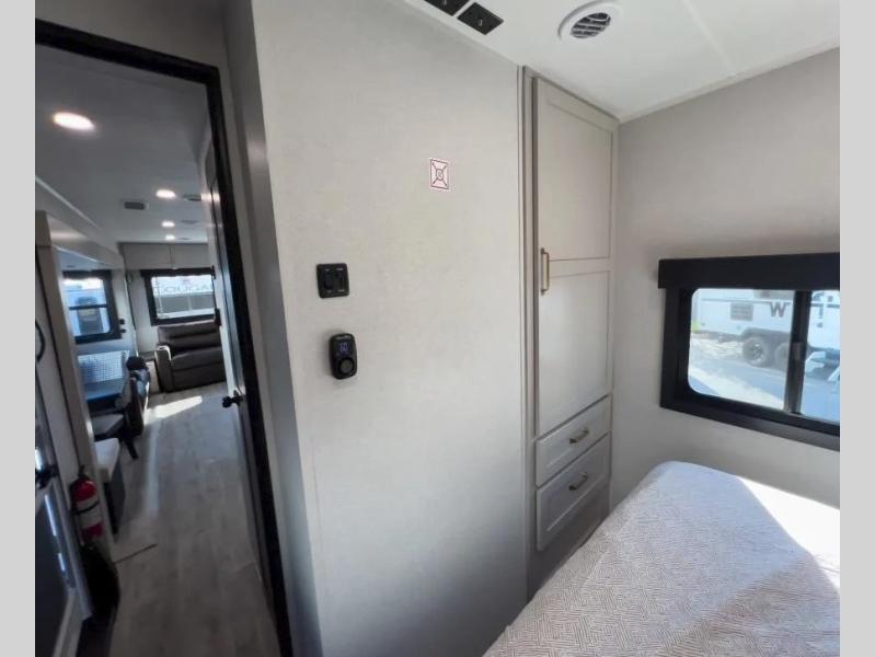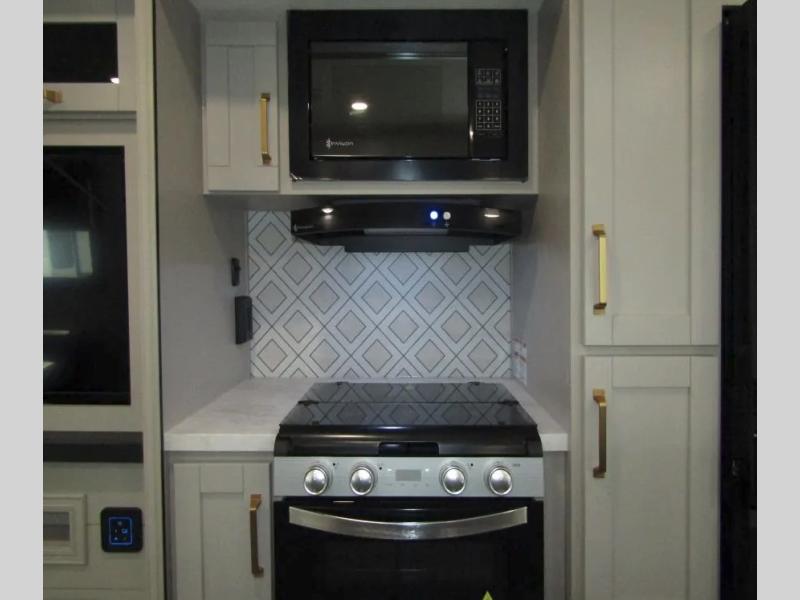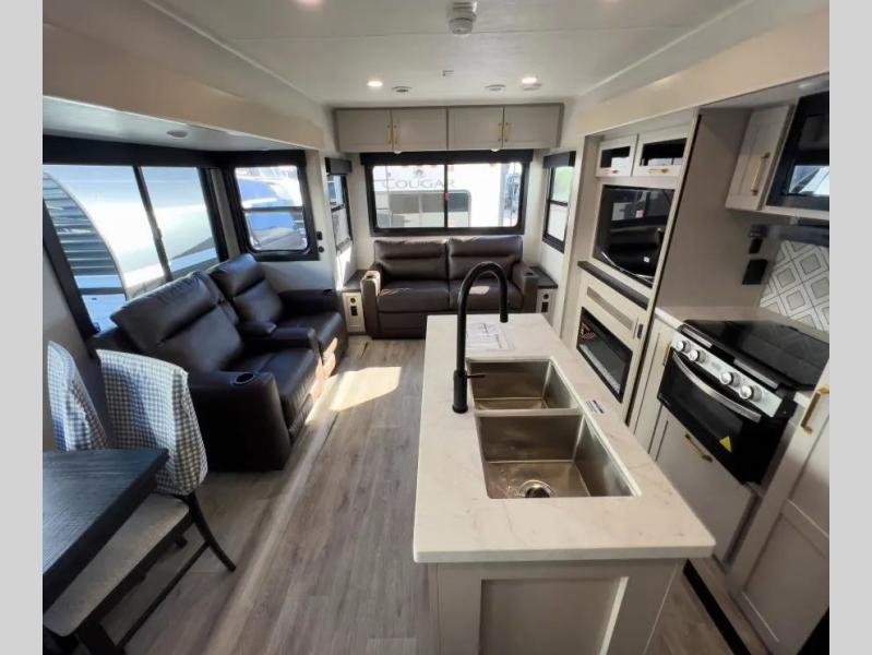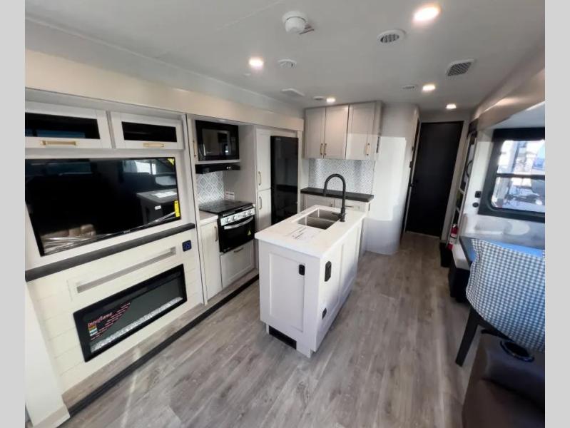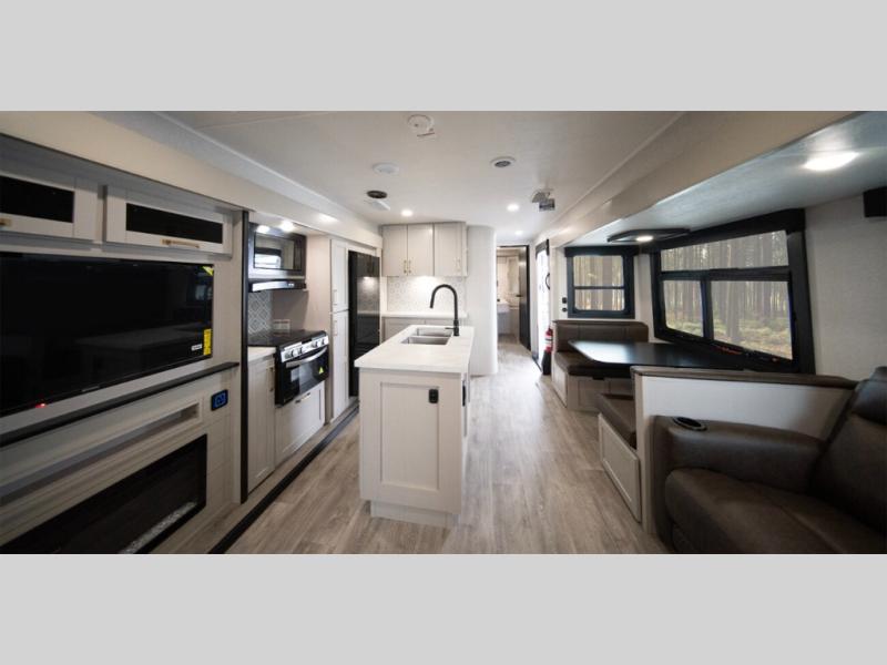 At the front of this trailer, you'll find a spacious full bedroom featuring a 66" x 80" Olympic queen bed, flanked by wardrobes on each side, overhead cabinets, and an additional corner wardrobe, providing plenty of storage for clothes, camping gear, and more. As you head down the hallway, the full bathroom offers a comfortable 30" x 36" shower with a skylight that adds extra headroom and natural light, along with a porcelain foot flush toilet and convenient linen storage for easy access to towels. Toward the rear, the main living area opens up with dual slide-outs, creating a roomy and inviting space. One slide houses the kitchen with a three-burner range, pantry, and a 10-cu. ft. refrigerator, all within easy reach. At the center, a kitchen island features a sink with a pull-out sprayer for added functionality. Opposite the kitchen, the second slide includes a 60" theater sofa and a table with chairs perfect for relaxing, dining, or gathering with friends. At the very rear, a 75" tri-fold sofa adds even more seating and can double as extra-sleeping space when needed