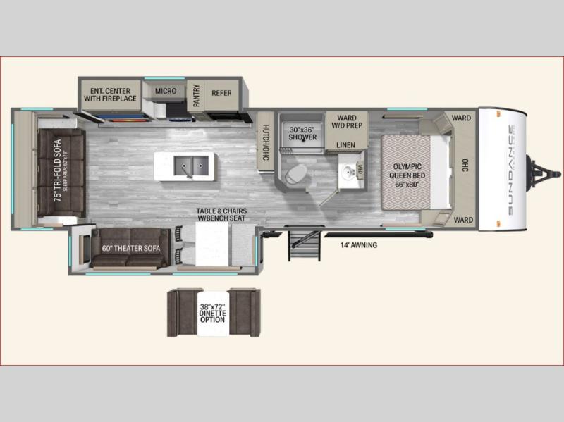 The Sundance Ultra-Lite travel trailers by Heartland are built with quality materials and smart features that enhance both durability and functionality. The 5" TrusstXL Roof System provides a strong, stable structure with plywood roof decking and a thick Alpha Ply TPO membrane, giving you confidence wherever you tow. The ThermaShield protection package includes a fully enclosed, heated underbelly, 35,000 BTU furnace, and double-layer fiberglass insulation in the ceiling and floor, helping to maintain a comfortable interior climate. For added convenience, the 50-amp detachable power cord allows for easy power hookups, while the LP quick connect makes setting up your outdoor cooking station simple and efficient. The CoreShield construction adds strength and insulation with 2” vacuum-bonded laminated walls and floors, helping to keep your trailer solid and comfortable throughout your travels.