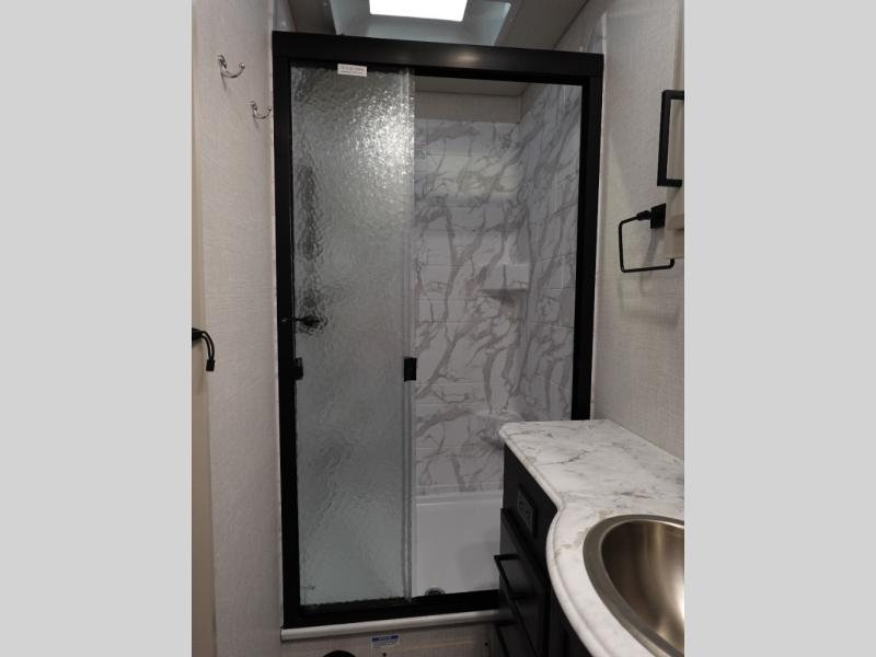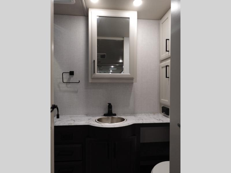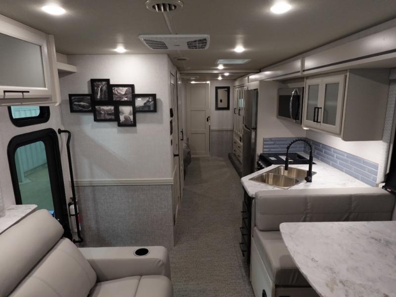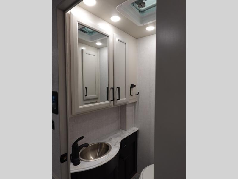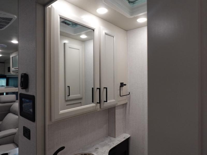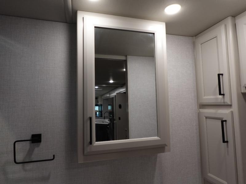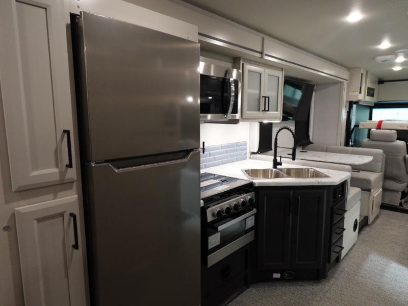 It's a clean decision to take this motorhome out on your adventures with a bath and a half! The full rear bathroom has a 30" x 36" shower to freshen up in each morning and creates a master suite by connecting to the private bedroom which has a Serenity Series king bed slide across from a wardrobe and dresser with an LED TV to watch movies in true comfort. The half bathroom is conveniently located by the fully equipped kitchen so you can take a bathroom break without worrying about your food cooking on the three burner cooktop. Enjoy your delicious meals on the Dream Dinette then relax on the jackknife sofa or head outside to watch the big game at the exterior entertainment center with LED TV. You even have exterior storage space to bring along all of your essentials!