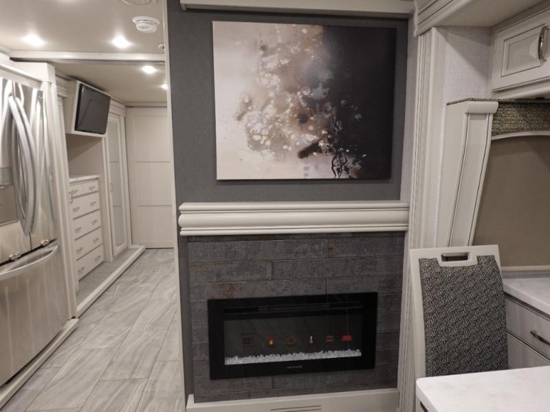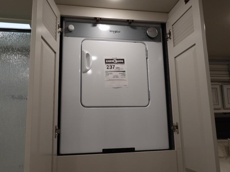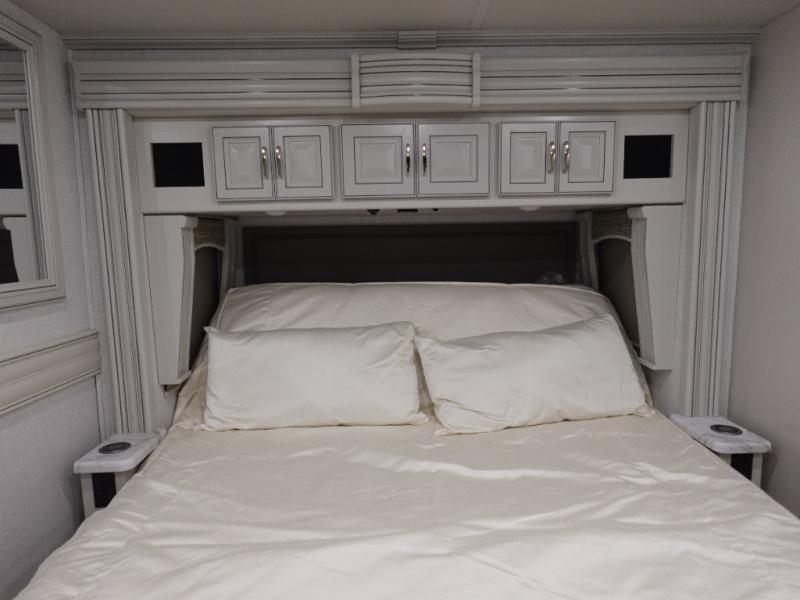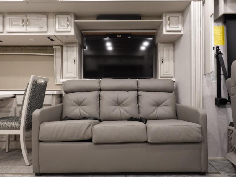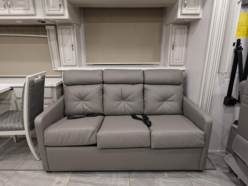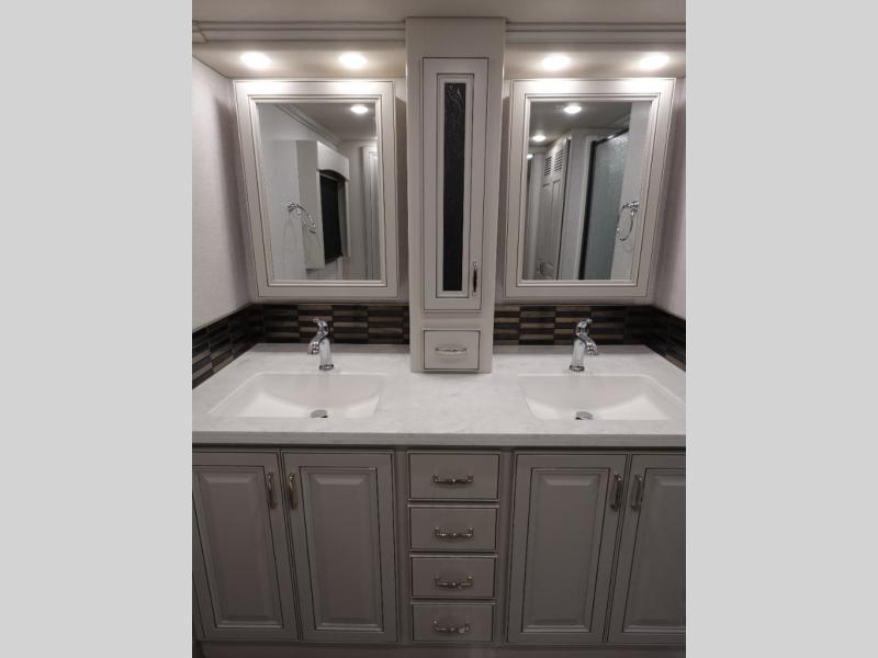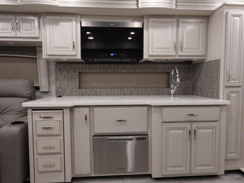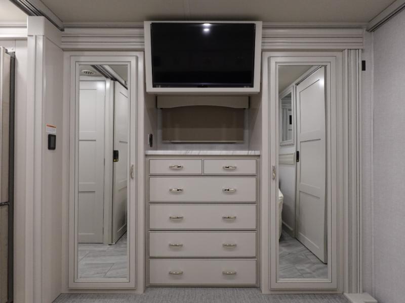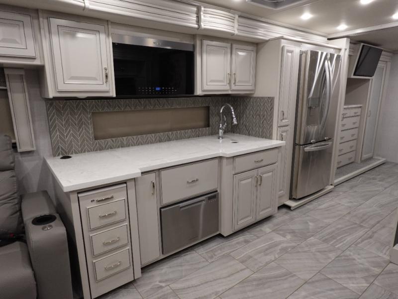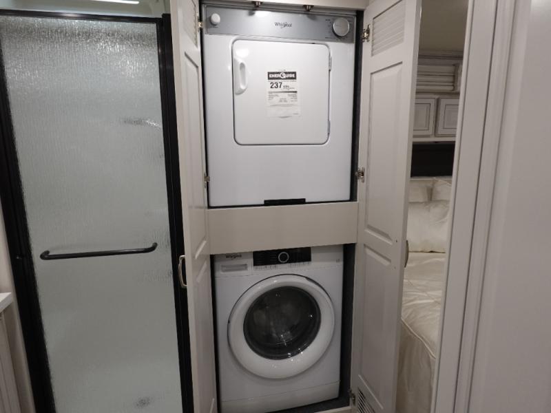 Whether you travel for business, pleasure, or both, you will appreciate all the comforts and luxury found throughout this coach! There is a spacious master bedroom with a king bed, dual wardrobes and an LED TV above a dresser, and a rear full bathroom with two sinks. You will be able to keep everything clean using the stackable washer/dryer, and there is a linen closet for storage. The mid-coach half bath is convenient especially when you have guests, and the sofa sleeper with a full mattress offers more sleeping space. The kitchen will make any cook happy with a convection microwave, a residential refrigerator with ice and water in the door, and the style of the polished solid surface galley countertop with lighting.