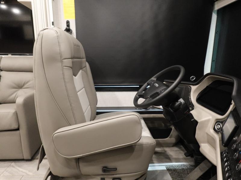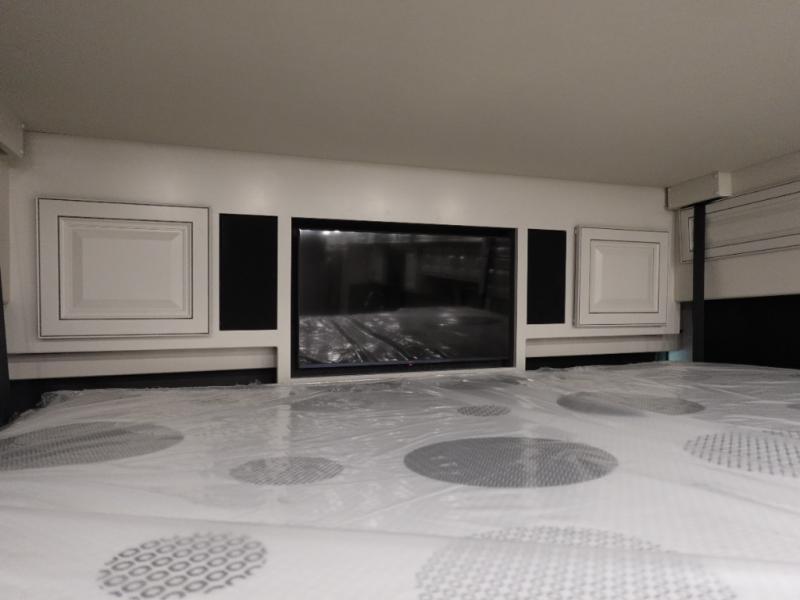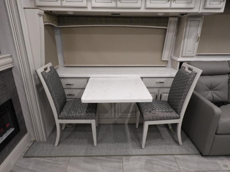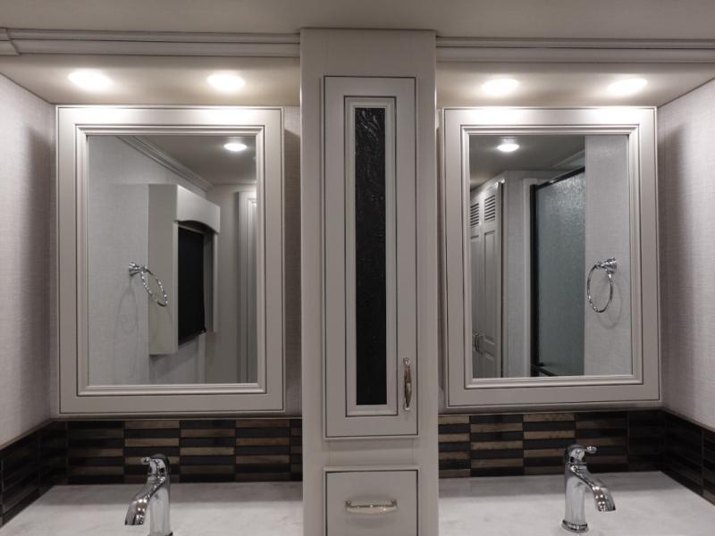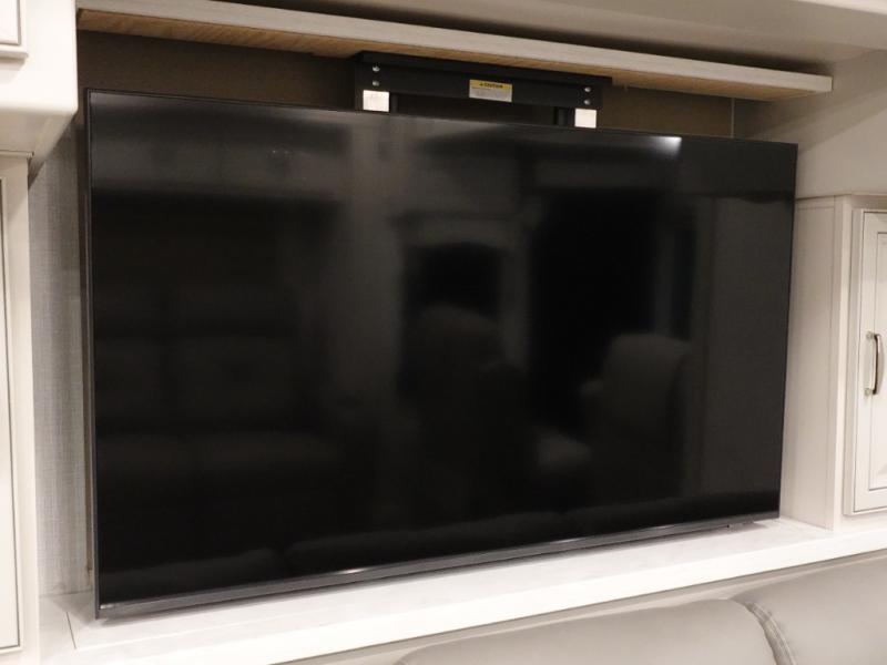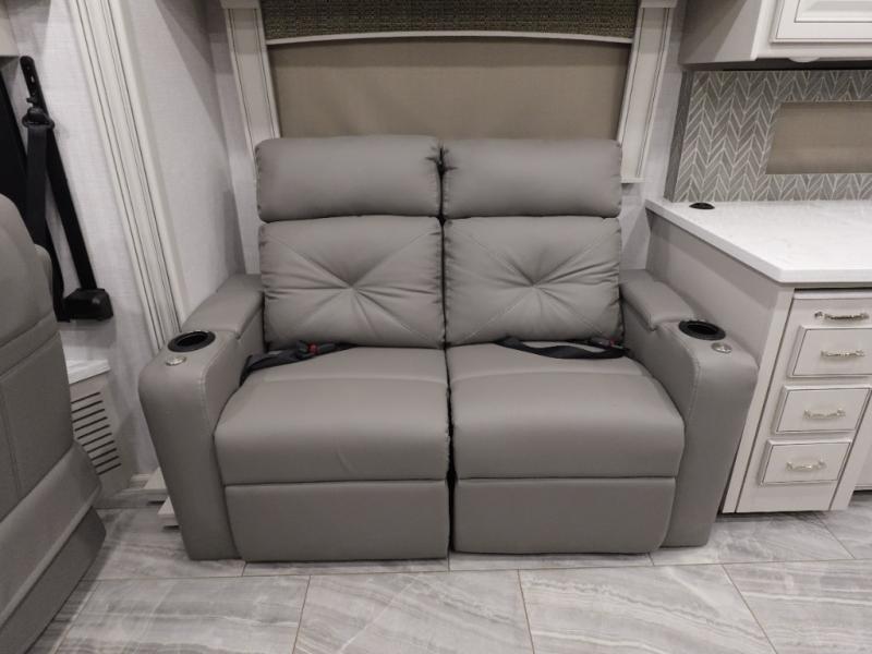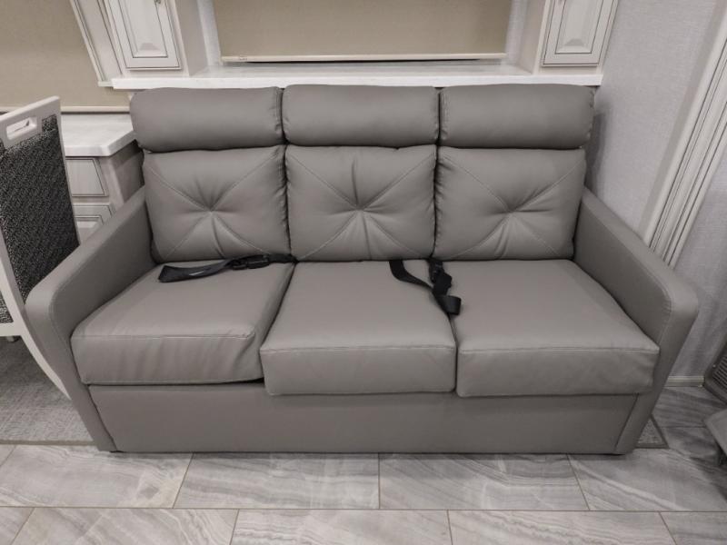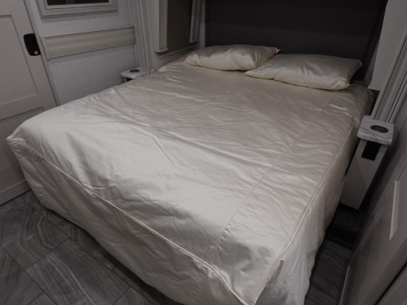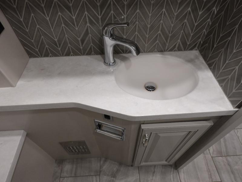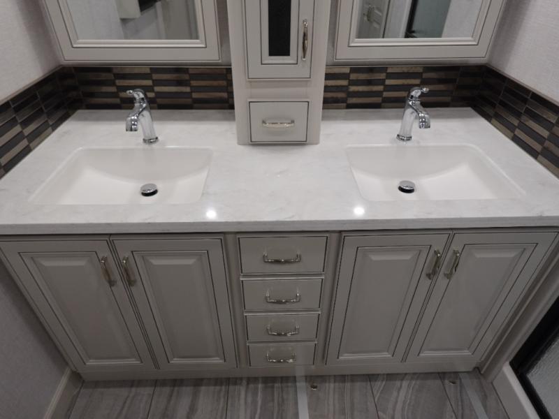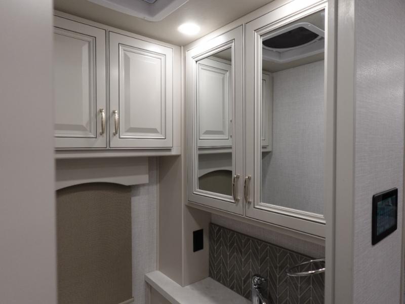 Whether you travel for business, pleasure, or both, you will appreciate all the comforts and luxury found throughout this coach! There is a spacious master bedroom with a king bed, dual wardrobes and an LED TV above a dresser, and a rear full bathroom with two sinks. You will be able to keep everything clean using the stackable washer/dryer, and there is a linen closet for storage. The mid-coach half bath is convenient especially when you have guests, and the sofa sleeper with a full mattress offers more sleeping space. The kitchen will make any cook happy with a convection microwave, a residential refrigerator with ice and water in the door, and the style of the polished solid surface galley countertop with lighting.