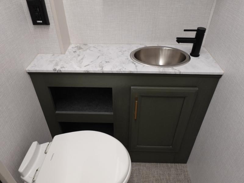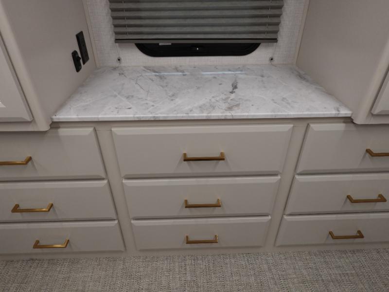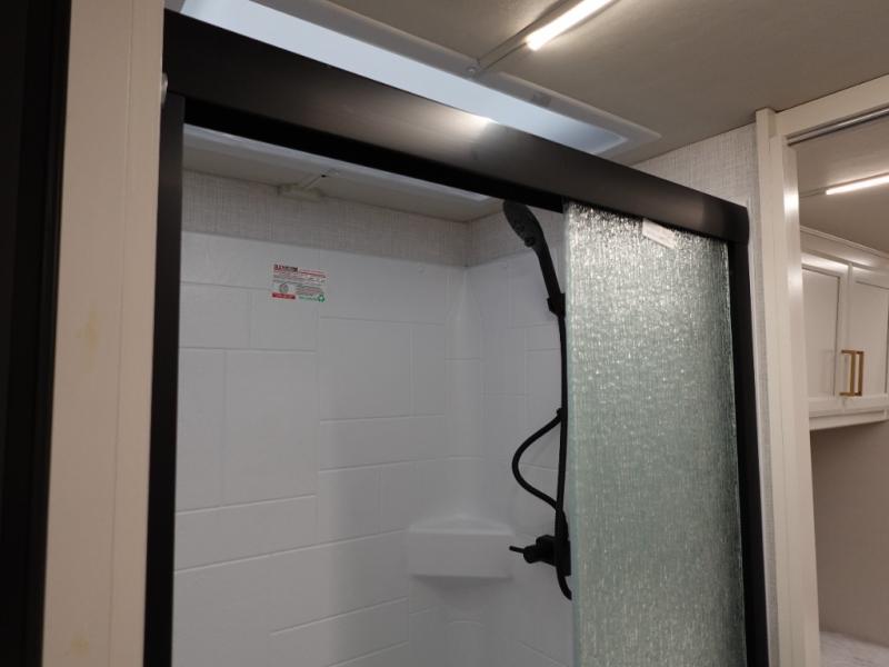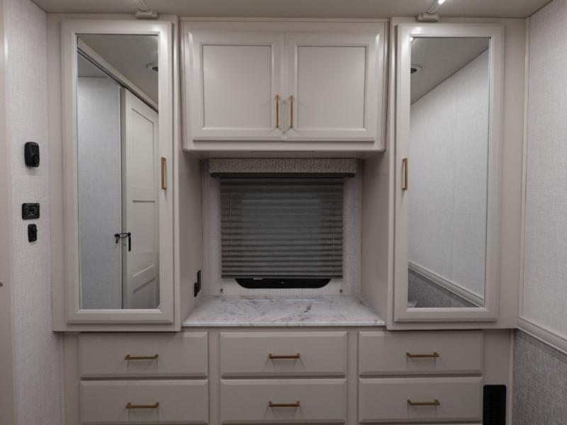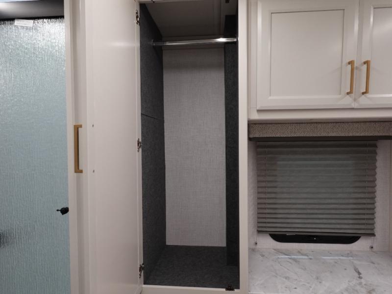 This double slide out coach is perfect for weekend excursions or extended stays! You will love having your own private bedroom in the back with a queen bed slide out and a wardrobe to keep your things organized. The private toilet and sink is right across the hall from the shower, so two people can freshen up at once. While the chef of your group is making lunch on the three burner range/convection microwave combo, the others can visit around the U-shaped dinette or relax on the sofa. These pieces of furniture will also double as additional sleeping space for guests, along with the overhead bunk!