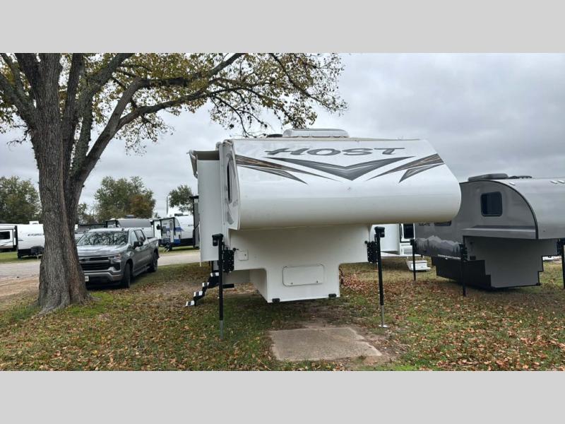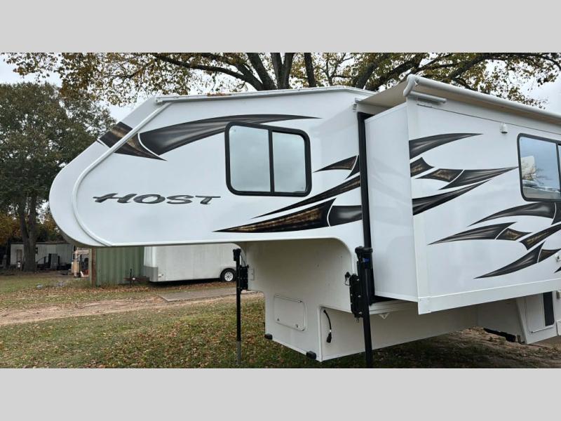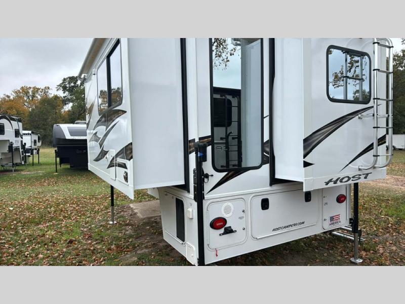 With any Host Industries Host Campers truck camper, there is ease of setting up with electric jacks with a wireless remote, and security when traveling thanks to the heavy duty camper tie down brackets. Each is constructed with two or three slide outs giving you more interior space on an Ultralite 100% aluminum structure with vacuum bonded foam insulated walls, a floor and a ceiling, plus there is a one-piece TPO roof. Some conveniences include an enclosed service center, enclosed and heated holding tanks, large J-rail rain gutters, and access panels for the slide out motors, water tank and holding tanks to mention a few. And the interior is just as impressive from the style, decor choices, the 12 volt LED lighting system, the Grani-coat solid surface countertops, and the many options you can add to customize your Host Camper!