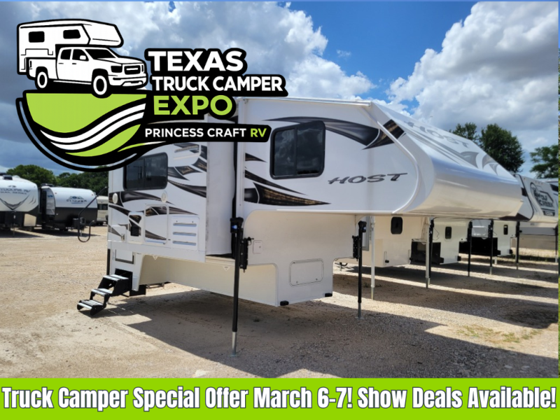 With any Host Industries Host Campers truck camper, there is ease of setting up with electric jacks with a wireless remote, and security when traveling thanks to the heavy duty camper tie down brackets. Each is constructed with two or three slide outs giving you more interior space on an Ultralite 100% aluminum structure with vacuum bonded foam insulated walls, a floor and a ceiling, plus there is a one-piece TPO roof. Some conveniences include an enclosed service center, enclosed and heated holding tanks, large J-rail rain gutters, and access panels for the slide out motors, water tank and holding tanks to mention a few. And the interior is just as impressive from the style, decor choices, the 12 volt LED lighting system, the Grani-coat solid surface countertops, and the many options you can add to customize your Host Camper!
