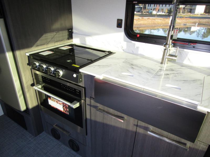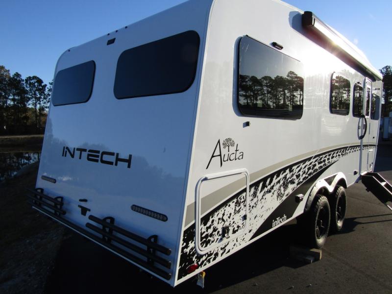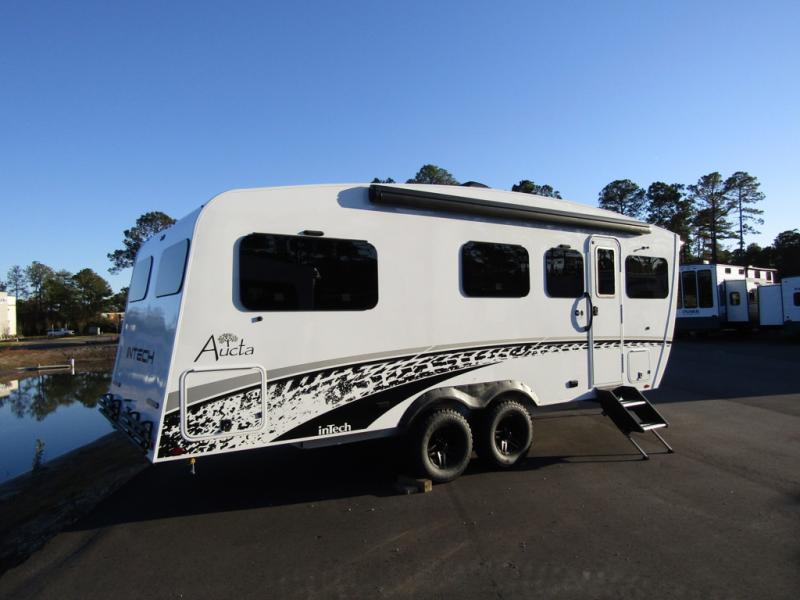 With any Aucta travel trailer by inTech RV you will enjoy creative interior spaces, luxury features, and smart storage spaces for a one-of-a-kind trailer. The one-piece fiberglass roof, all-aluminum cage frame, and Dexter torsion axle provide durable construction and smooth towing, and the fold-away double entry steps and power tongue jack will make set-up easier than ever. Inside, you'll find Infinity woven flooring, a large farmhouse sink, USB ports and 120V outlets, plenty of storage compartments, and MaxxAir vent fans to keep everything fresh. These models also include bubble foil insulation in the walls and ceiling, along with a 25K BTU furnace and a 15K BTU A/C so you can make memories year around!