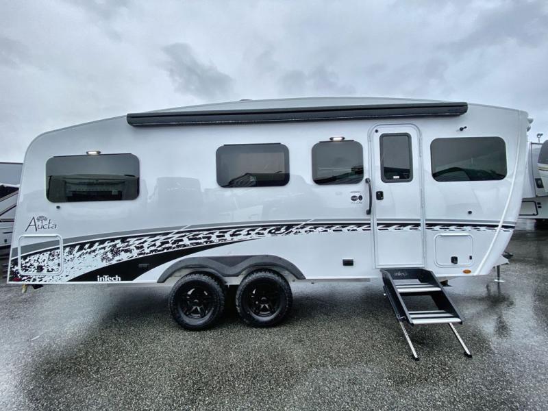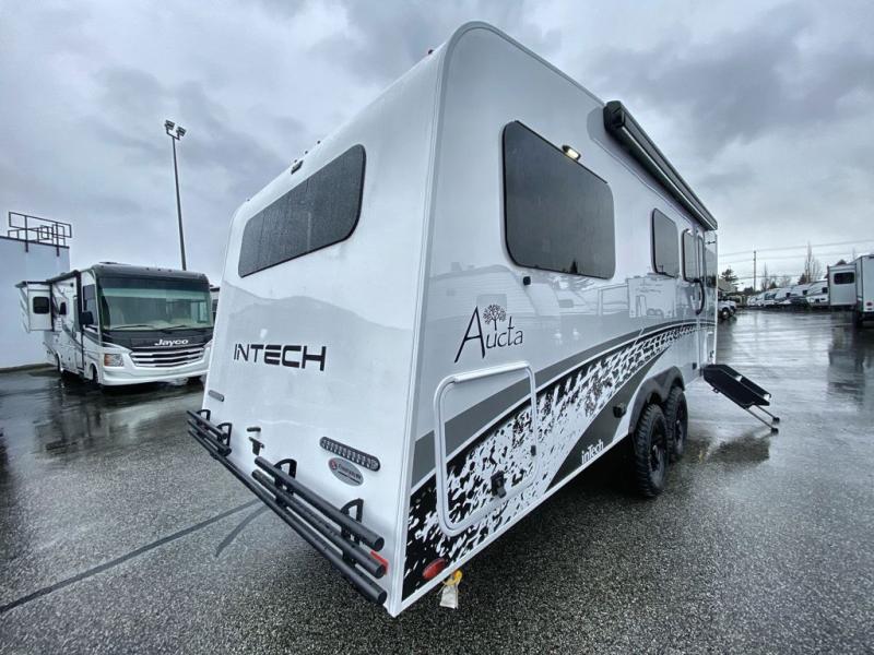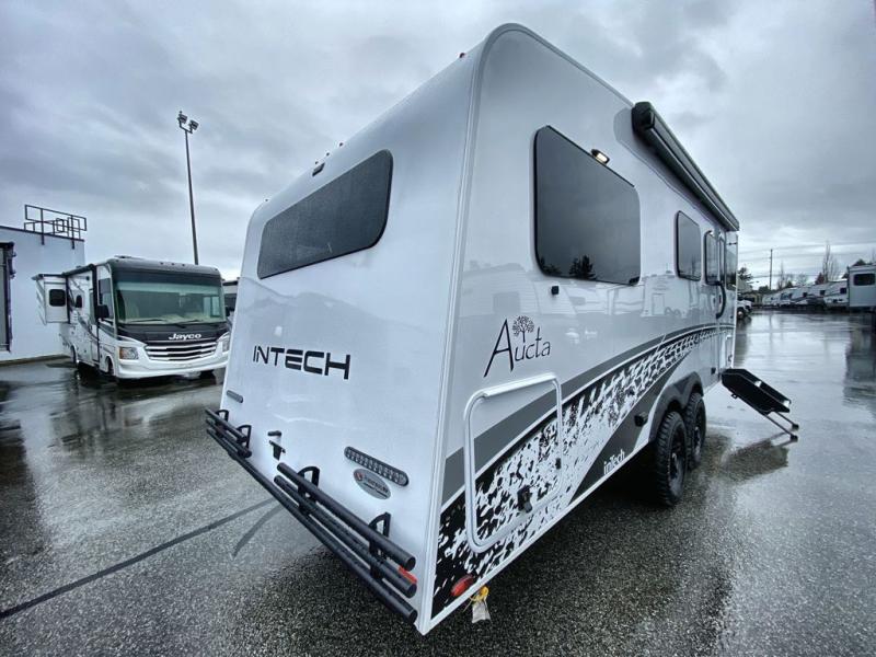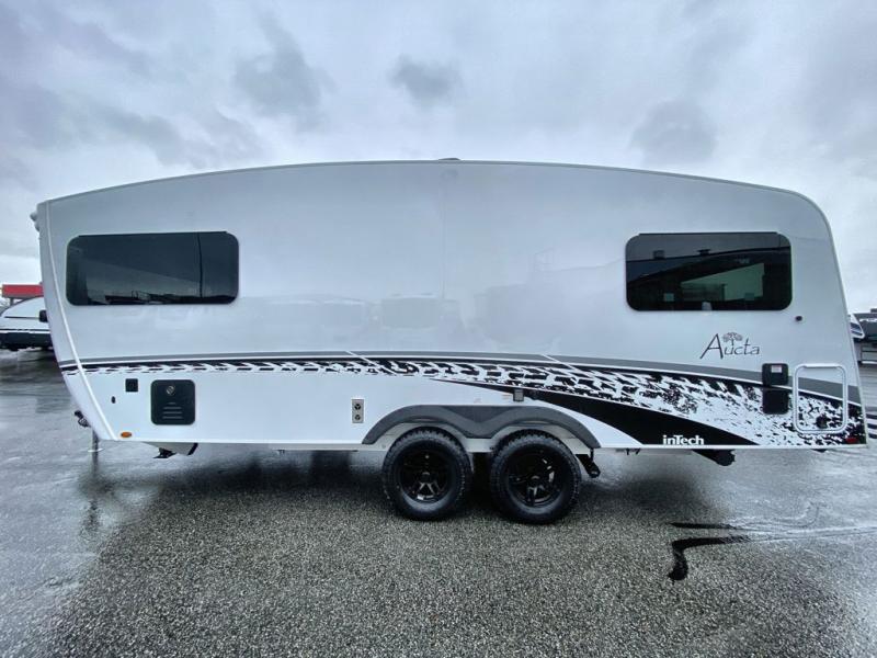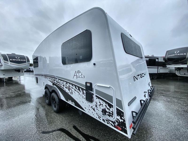 With any Aucta travel trailer by inTech RV you will enjoy creative interior spaces, luxury features, and smart storage spaces for a one-of-a-kind trailer. The one-piece fiberglass roof, all-aluminum cage frame, and Dexter torsion axle provide durable construction and smooth towing, and the fold-away double entry steps and power tongue jack will make set-up easier than ever. Inside, you'll find Infinity woven flooring, a large farmhouse sink, USB ports and 120V outlets, plenty of storage compartments, and MaxxAir vent fans to keep everything fresh. These models also include bubble foil insulation in the walls and ceiling, along with a 25K BTU furnace and a 15K BTU A/C so you can make memories year around!