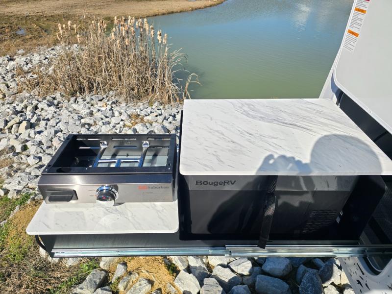 Pack your bags for a new adventure in this Willow travel trailer. You and your spouse or camping friend will love the natural light that streams in from the panoramic windows as you relax on the U-shaped dinette. Prepare meals each day on the two burner stainless steel cooktop or use the convection microwave, and you'll find plenty of overhead cabinets for all your necessities. This model features a private toilet and sink, with the shower right across the hall so two people can freshen up at once. When it's time to call it a night, you can rest comfortably on the walk-around queen bed, and the 32" bedroom TV will allow you to watch a late-night movie in bed! If you like to have your own space at night, just choose the optional twin beds! This model also has a dry weight that ranges from 5,650-5,850 lbs., a tongue weight between 725-790 lbs., and a carrying capacity between 1,650-1,850 lbs. You may also like to choose the optional Rover Package that includes a 3" lift, an aluminum tube rear bumper, rugged decals, and more!