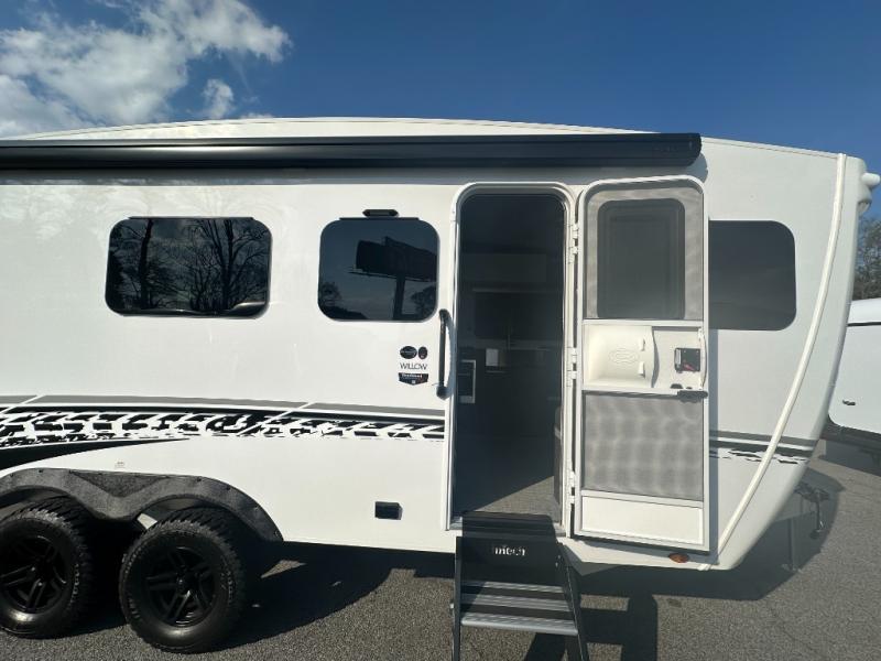 Pack your bags for a new adventure in this Willow travel trailer. You and your spouse or camping friend will love the natural light that streams in from the panoramic windows as you relax on the U-shaped dinette. Prepare meals each day on the two burner stainless steel cooktop or use the convection microwave, and you'll find plenty of overhead cabinets for all your necessities. This model features a private toilet and sink, with the shower right across the hall so two people can freshen up at once. When it's time to call it a night, you can rest comfortably on the optional twin beds, and the 32" bedroom TV will allow you to watch a late-night movie in bed! This model also has a dry weight that ranges from 5,650-5,850 lbs., a tongue weight between 725-790 lbs., and a carrying capacity between 1,650-1,850 lbs. You may also like to choose the optional Rover Package that includes a 3" lift, an aluminum tube rear bumper, rugged decals, and more!