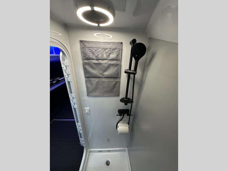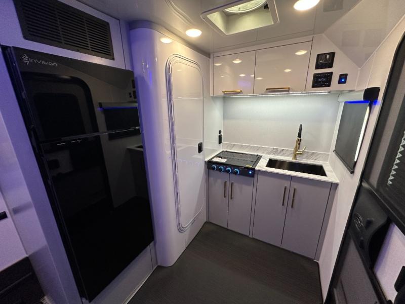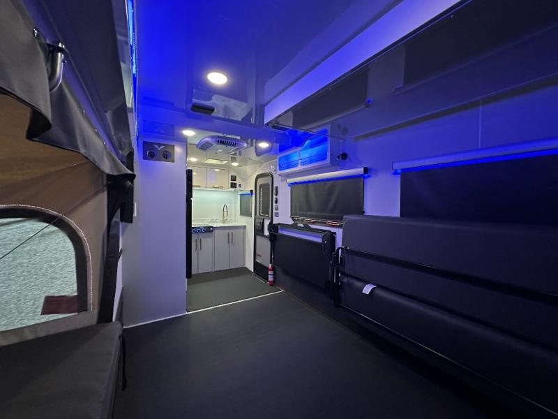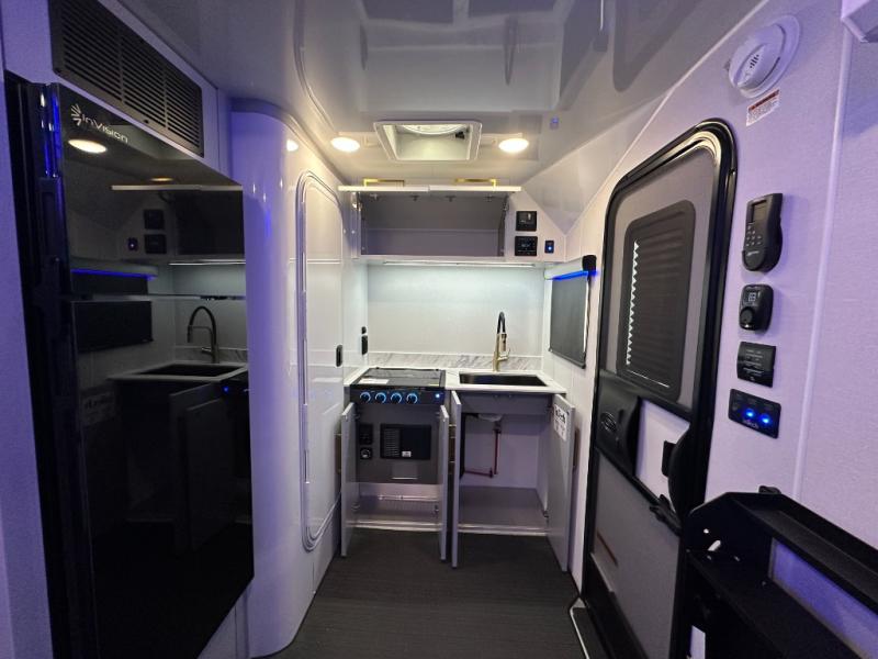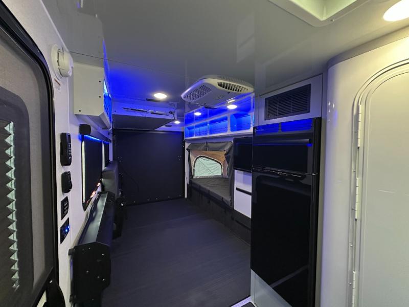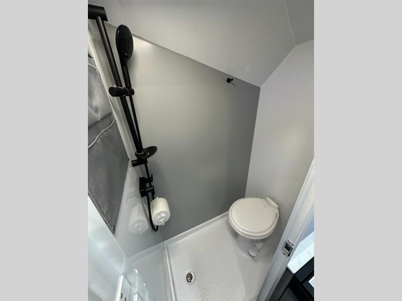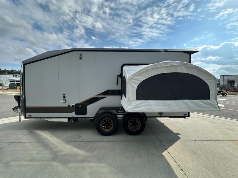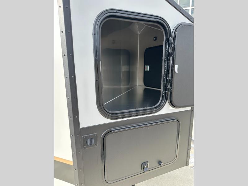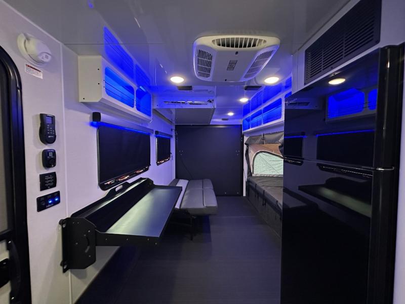 With any Black Wing toy hauler travel trailer by inTech RV, you will durable construction thanks to the fully welded cage and frame construction. There is also a one-piece aluminum roof, a power tongue jack, and solar prep outside for off-grid capabilities. The interior features ample storage space, a MaxxAir vent, a large farmhouse style sink with a gold faucet, and a Bluetooth stereo plus a Smart TV to keep you entertained. Additional features include USB and 120V outlets, an on-demand water heater, aluminum garage flooring, and available options to further customize your toy hauler!