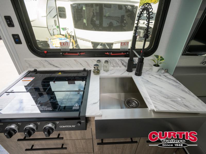 This travel trailer is ready to hit the great outdoors whenever you are! You and your loved one will have a front convertible U-shaped dinette to enjoy meals at and sleep on at night. And the rear twin beds include a filler if you want to convert them into one king-size bed In the morning. You can also prepare eggs and bacon on the two burner cooktop before heading out for the day. If you've chosen the optional 10' awning, you may not wander off too far from your trailer. This model also includes a wet bath with a porcelain toilet and a roof vent to eliminate any unwanted steam. This model has a dry weight that ranges from 3,540-3,970 lbs., a tongue weight between 540-575 lbs., and a carrying capacity between 820-1210 lbs.