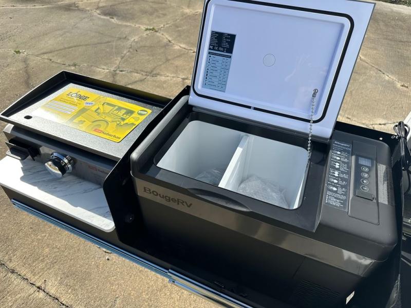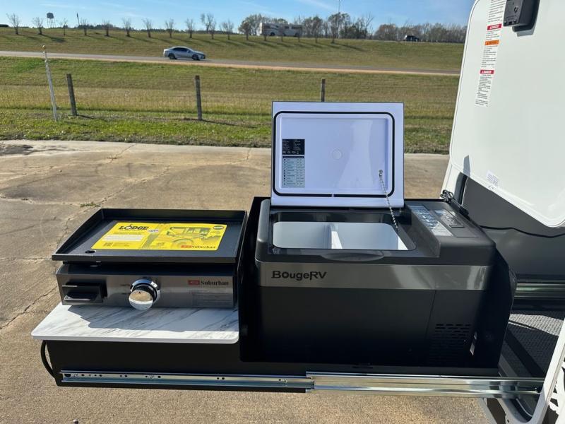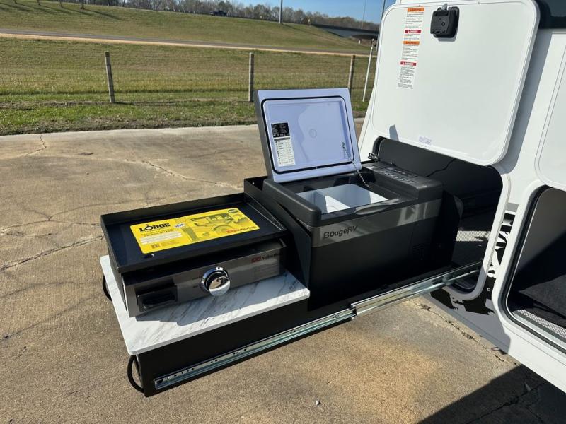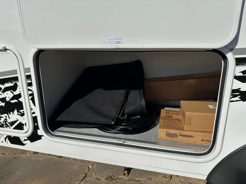 This travel trailer is ready to hit the great outdoors whenever you are! You and your loved one will have a front convertible U-shaped dinette to enjoy meals at and sleep on at night. And the rear twin beds include a filler if you want to convert them into one king-size bed In the morning. You can also prepare eggs and bacon on the two burner cooktop before heading out for the day. If you've chosen the optional 10' awning, you may not wander off too far from your trailer. This model also includes a wet bath with a porcelain toilet and a roof vent to eliminate any unwanted steam. This model has a dry weight that ranges from 3,590-3,980 lbs., a tongue weight between 540-575 lbs., and a carrying capacity between 820-1210 lbs. When the optional Rover Package is chosen on this model, you'll enjoy rugged decals, a 3" lift, blackout wheels, and more; see dealer for more details!