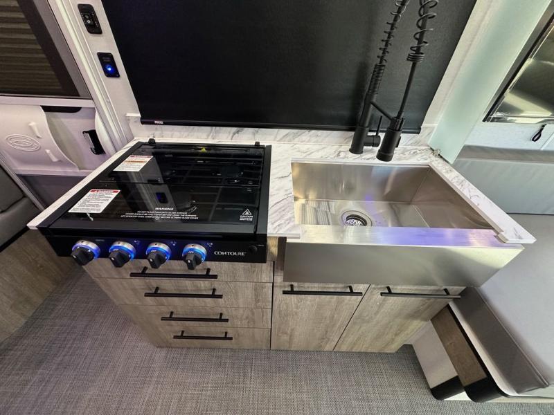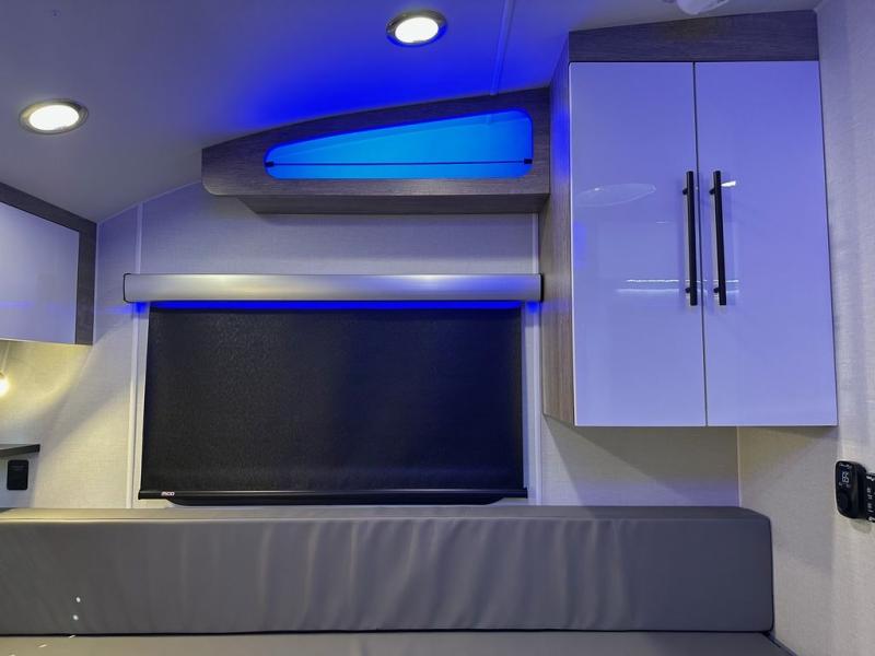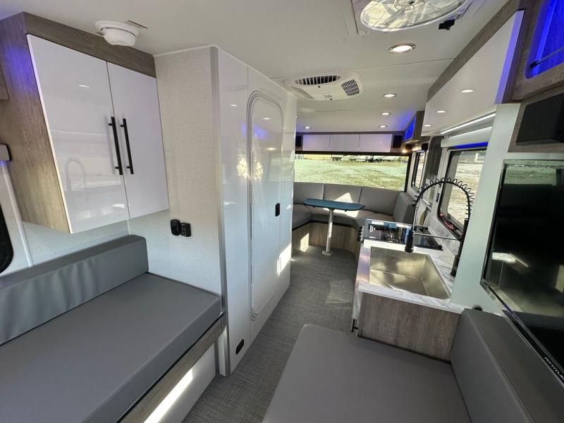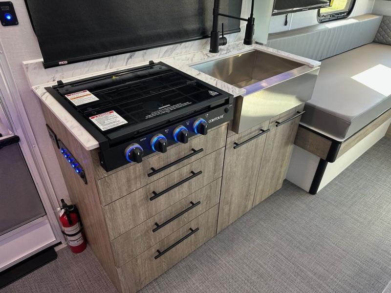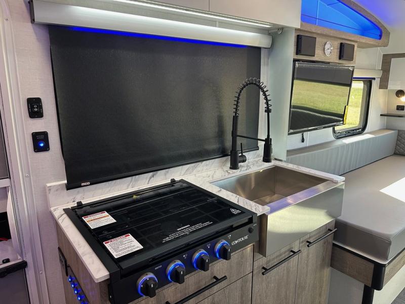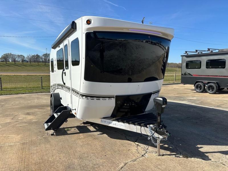 With any Sol travel trailer by inTech RV you will find strong, durable construction consisting of lightweight aluminum that is easier to tow and resists rust, water, and dents. The Tilt-Forward Design creates more space inside so you can stretch out, and the panoramic windshield gives a great view of the mountains, ocean, or forest! The elegant interior features tinted windows with shades, Infinity woven flooring, and a stainless steel cooktop and microwave. You will stay comfortable year around since these models include a 15K BTU A/C and a 16K BTU furnace.