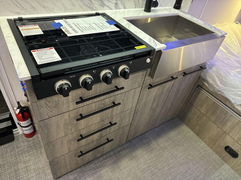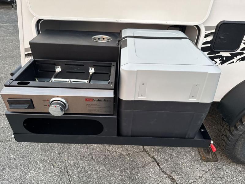 You will love the added space in this travel trailer that can sleep four people each night. There is a queen-size bed in the back, plus a convertible U-shaped dinette up front for the kids or your camping friends. The kitchen includes a two burner stainless steel cooktop, a stainless steel microwave, and a 4.5 12V compressor refrigerator for your perishables. You can also add the optional 10' power awning outside for shade as you visit with loved ones! This model has a dry weight that ranges from 3,113-3,543 lbs., a tongue weight between 465-495 lbs., and a carrying capacity between 525-610 lbs. When the optional Rover Package is chosen on this model, you'll enjoy rugged decals, a 3" lift, blackout wheels, and more; see dealer for more details!