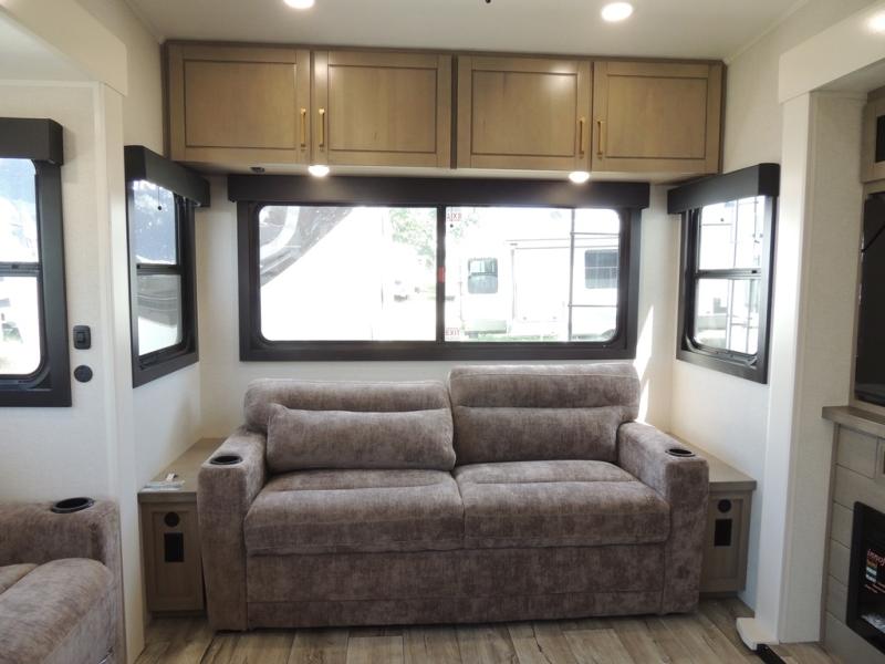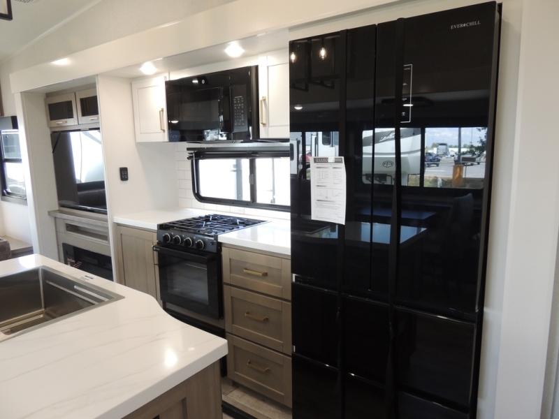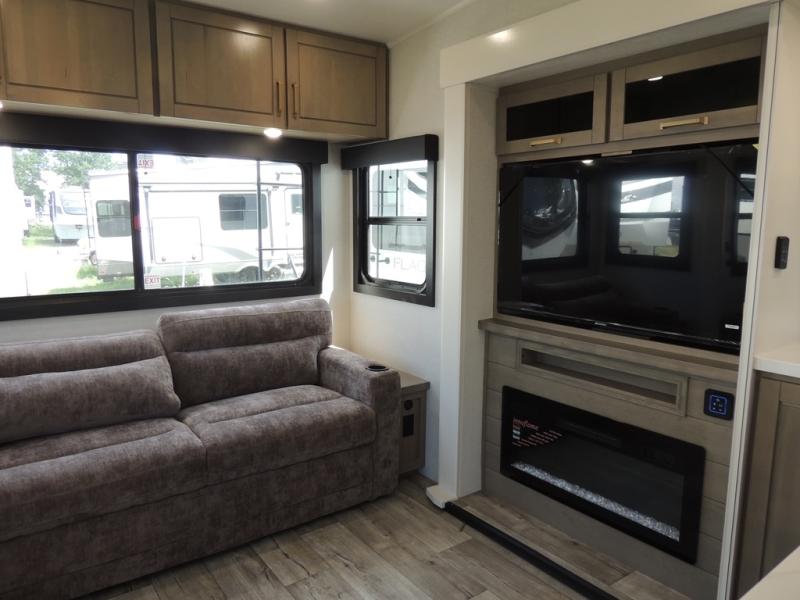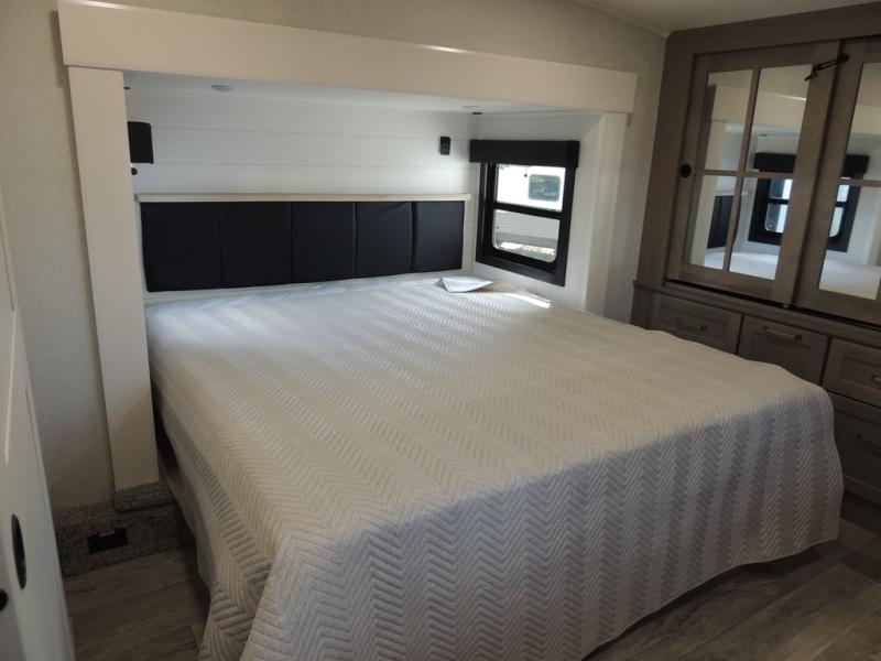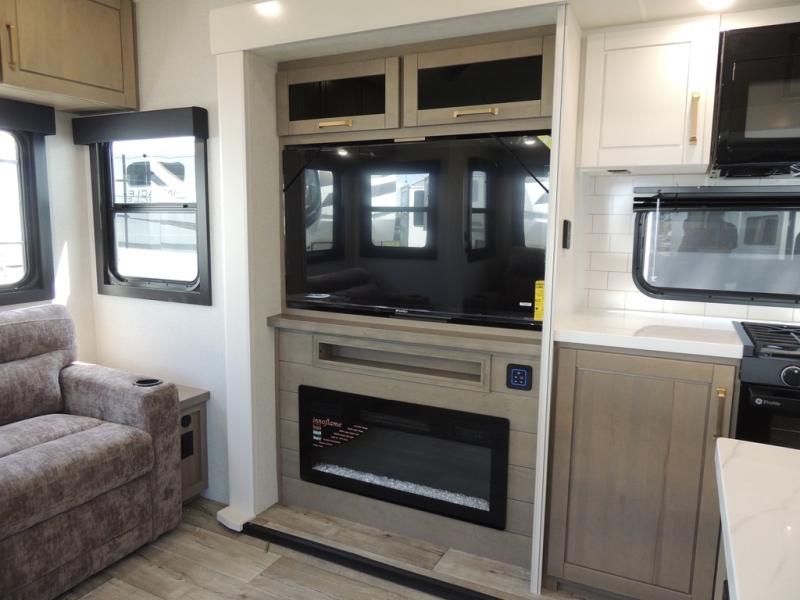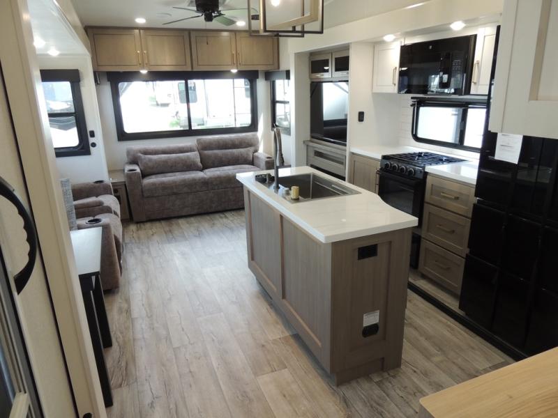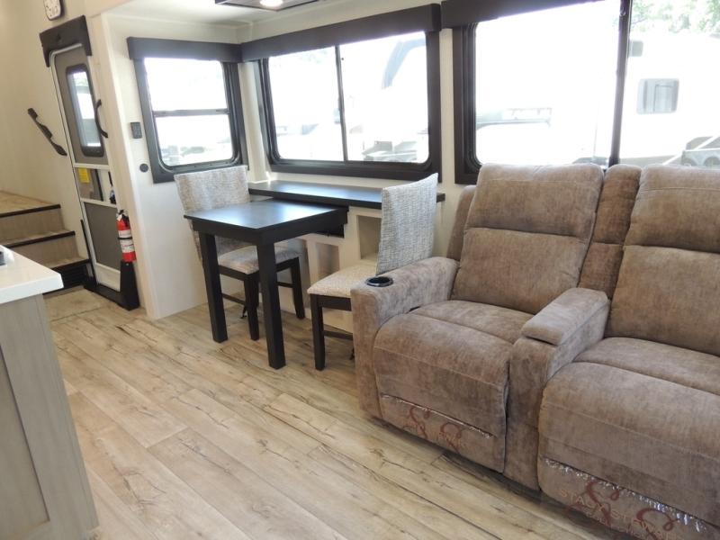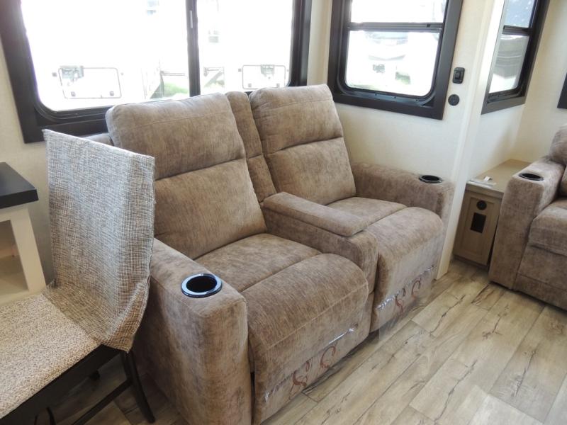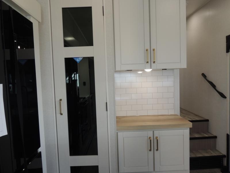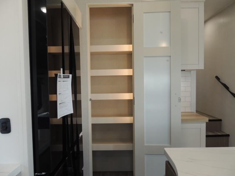 Triple slides for space, plenty of seating spaces, plus a spacious private bedroom make this fifth wheel one you won't want to pass up! You can freshen up each day in the full bath that includes a residential style glass shower door, a bathroom skylight, and a medicine cabinet to keep this space organized. Once you've cut up some fresh fruit at the kitchen island, whip up some eggs and bacon for breakfast, or just grab the cereal from the pantry. There is a spacious 16 cu. ft. 12V refrigerator, plus a hutch where you can store your own coffee machine. Relax on the tri-fold sofa, theater seat, or free-standing table with chairs/bench before heading out for the day. The king bed slide out in the front private bedroom will be waiting for you when you return!