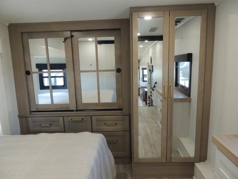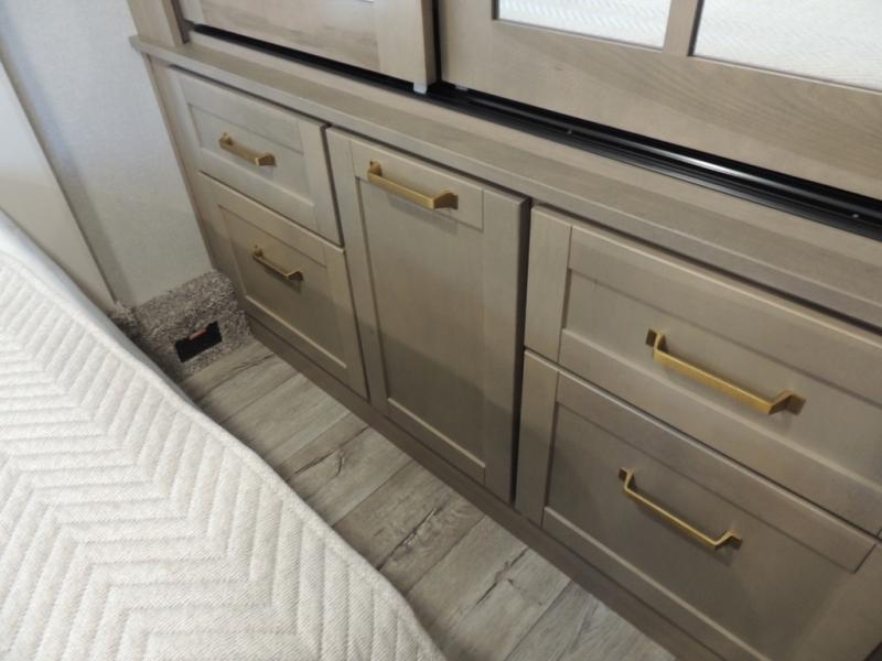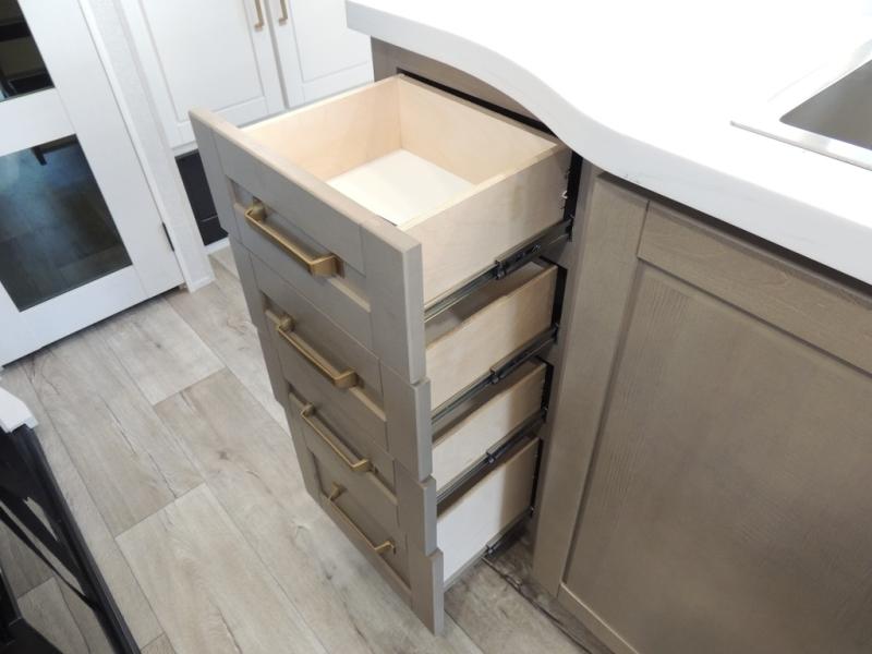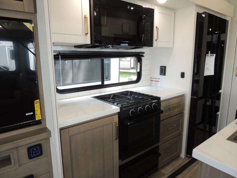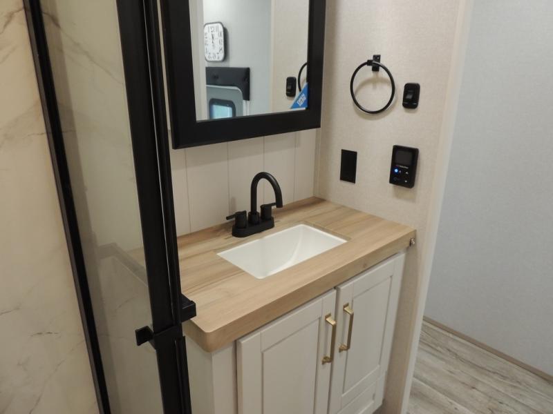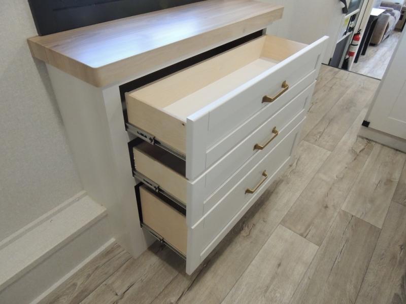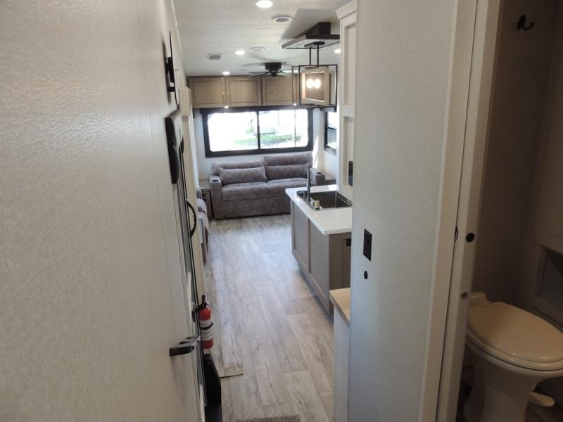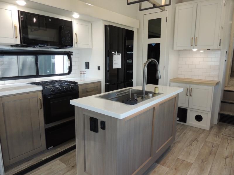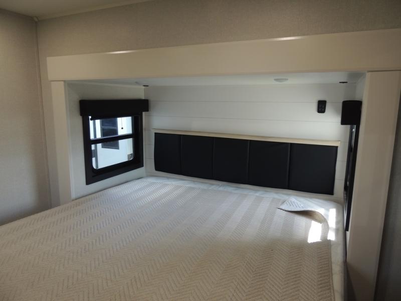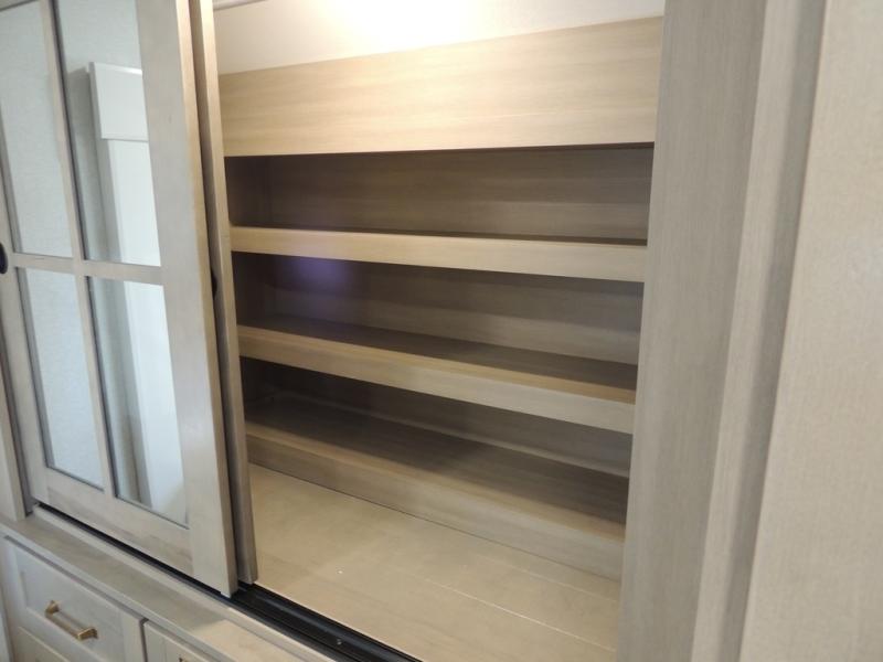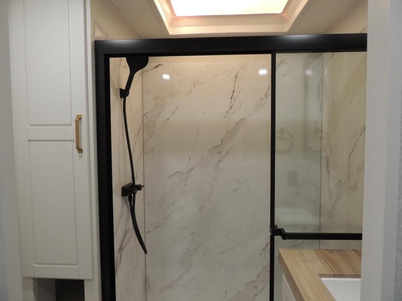 Triple slides for space, plenty of seating spaces, plus a spacious private bedroom make this fifth wheel one you won't want to pass up! You can freshen up each day in the full bath that includes a residential style glass shower door, a bathroom skylight, and a medicine cabinet to keep this space organized. Once you've cut up some fresh fruit at the kitchen island, whip up some eggs and bacon for breakfast, or just grab the cereal from the pantry. There is a spacious 16 cu. ft. 12V refrigerator, plus a hutch where you can store your own coffee machine. Relax on the tri-fold sofa, theater seat, or free-standing table with chairs/bench before heading out for the day. The king bed slide out in the front private bedroom will be waiting for you when you return!