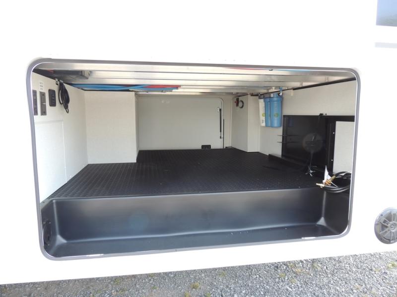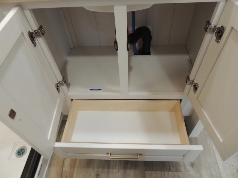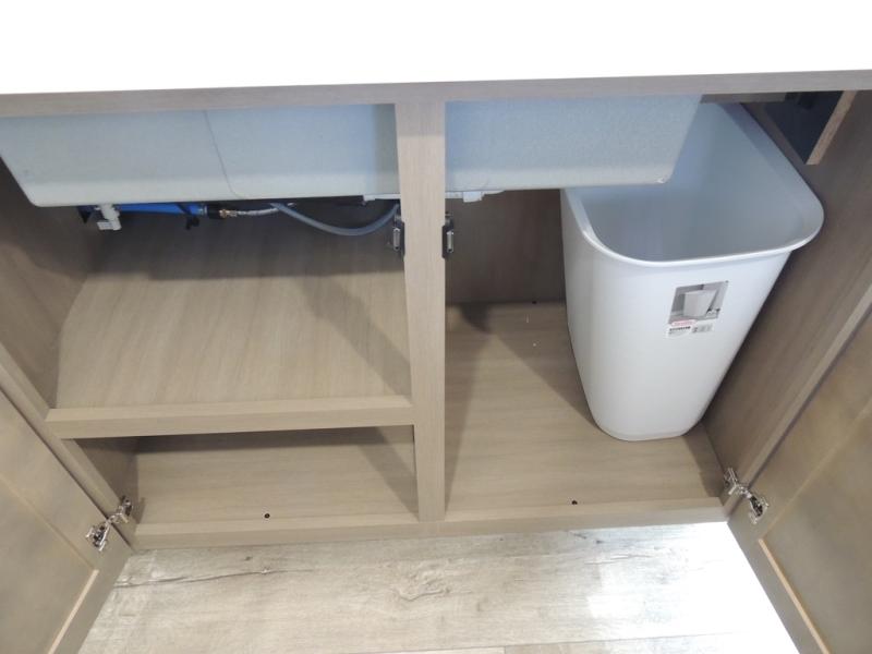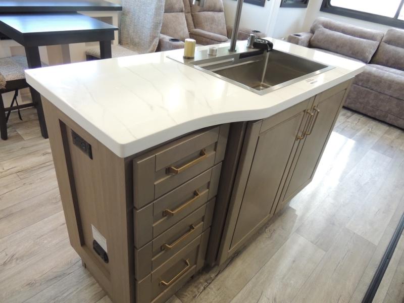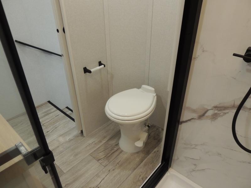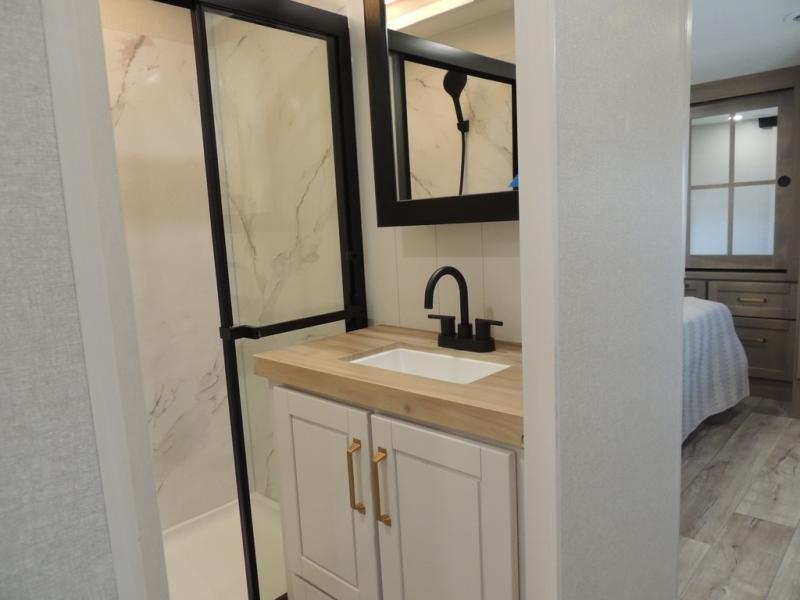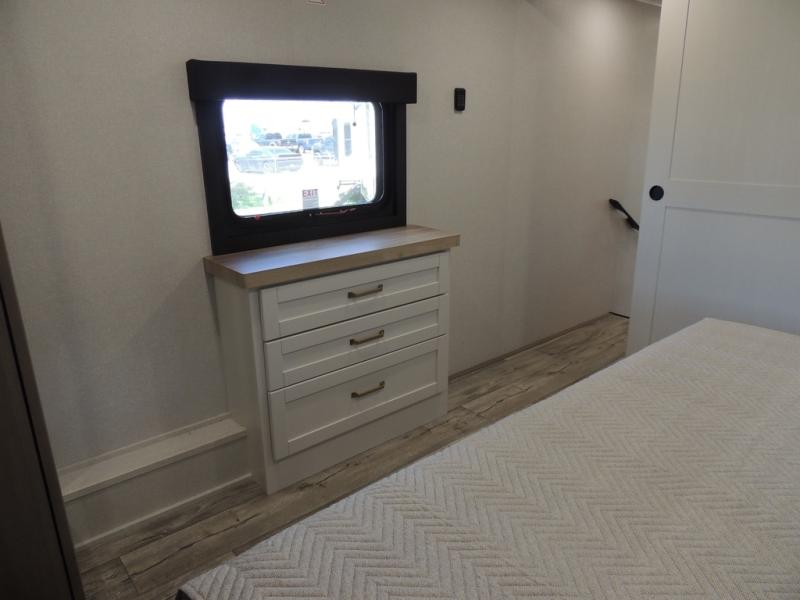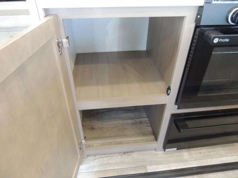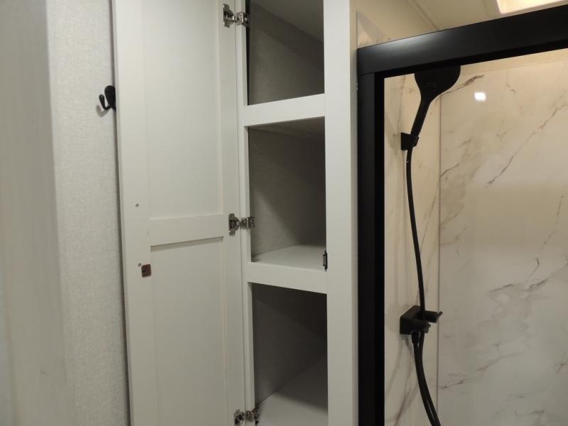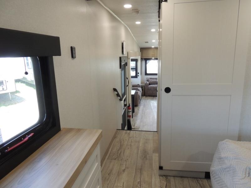 Triple slides for space, plenty of seating spaces, plus a spacious private bedroom make this fifth wheel one you won't want to pass up! You can freshen up each day in the full bath that includes a residential style glass shower door, a bathroom skylight, and a medicine cabinet to keep this space organized. Once you've cut up some fresh fruit at the kitchen island, whip up some eggs and bacon for breakfast, or just grab the cereal from the pantry. There is a spacious 16 cu. ft. 12V refrigerator, plus a hutch where you can store your own coffee machine. Relax on the tri-fold sofa, theater seat, or free-standing table with chairs/bench before heading out for the day. The king bed slide out in the front private bedroom will be waiting for you when you return!