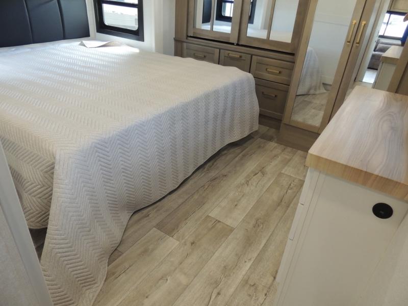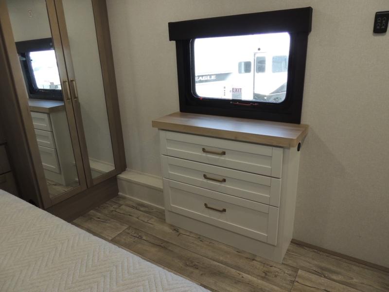 With any Eagle fifth wheel by Jayco you will appreciate durable construction materials, like the Magnum Truss Roof and the Stronghold VBL laminated walls. The JAYCOMMAND Smart RV system puts you in control of your RV's functions, and the 5 Star Handling Package will provide smooth towing from home to camp. Each model features Climate Shield zero-degree tested weather protection and the industry-exclusive HELIX cooling system that features two 15,000 BTU Whisper Quiet A/C's to keep you comfortable year around. Some of the exterior conveniences you are sure to love are the pass-through storage with Slam-Latch baggage doors and an automotive style front cap with max turn radius. The Eagle fifth wheels are designed to make you feel at home with solid hardwood slide fascia, residential vinyl flooring throughout, 100% no floor vents, and blackout roller shades with reflective side throughout for added privacy and insulation.