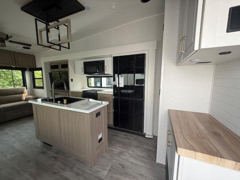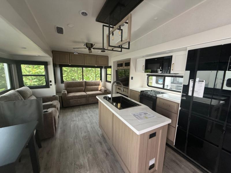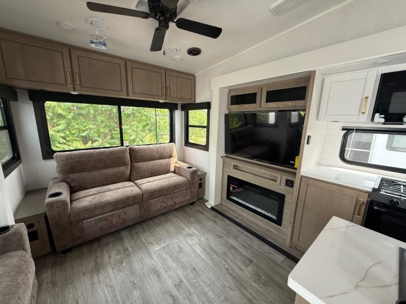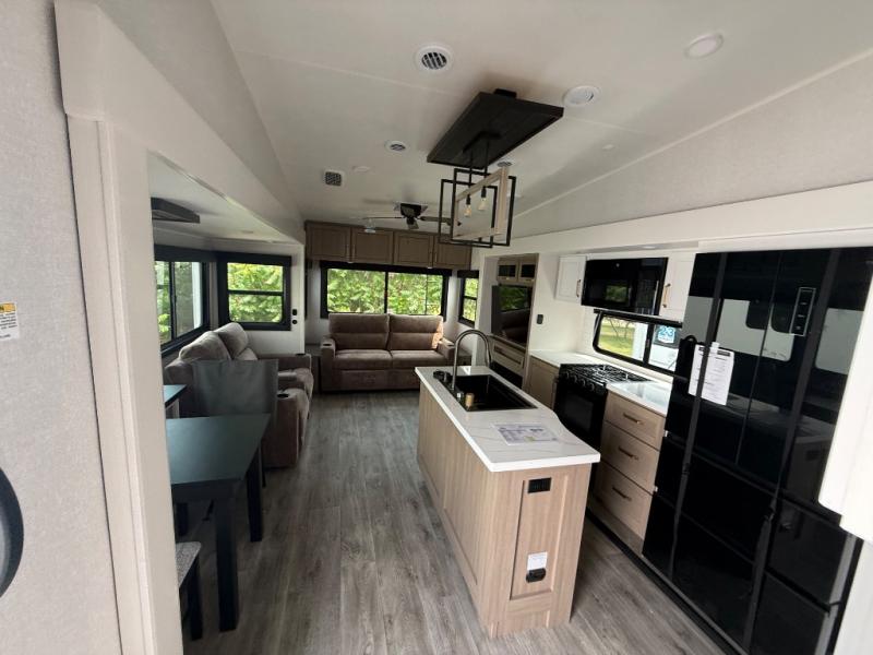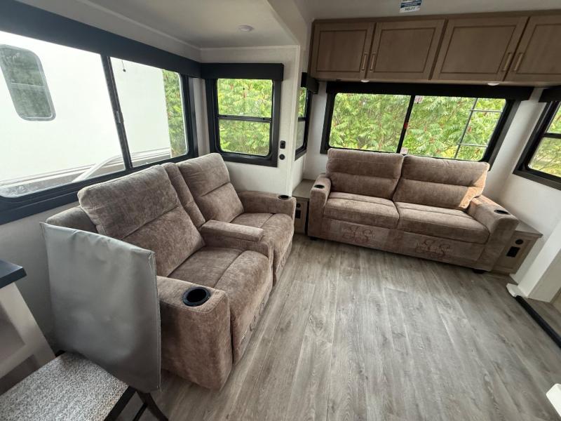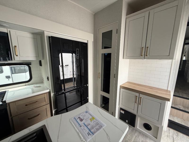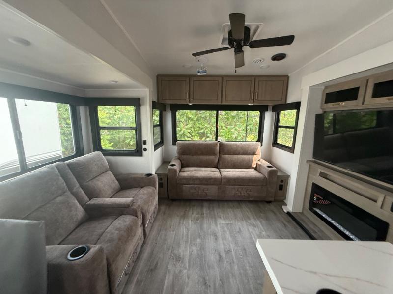Triple slides for space, plenty of seating spaces, plus a spacious private bedroom make this fifth wheel one you won't want to pass up! You can freshen up each day in the full bath that includes a residential style glass shower door, a bathroom skylight, and a medicine cabinet to keep this space organized. Once you've cut up some fresh fruit at the kitchen island, whip up some eggs and bacon for breakfast, or just grab the cereal from the pantry. There is a spacious 16 cu. ft. 12V refrigerator, plus a hutch where you can store your own coffee machine. Relax on the tri-fold sofa, theater seat, or free-standing table with chairs/bench before heading out for the day. The king bed slide out in the front private bedroom will be waiting for you when you return!