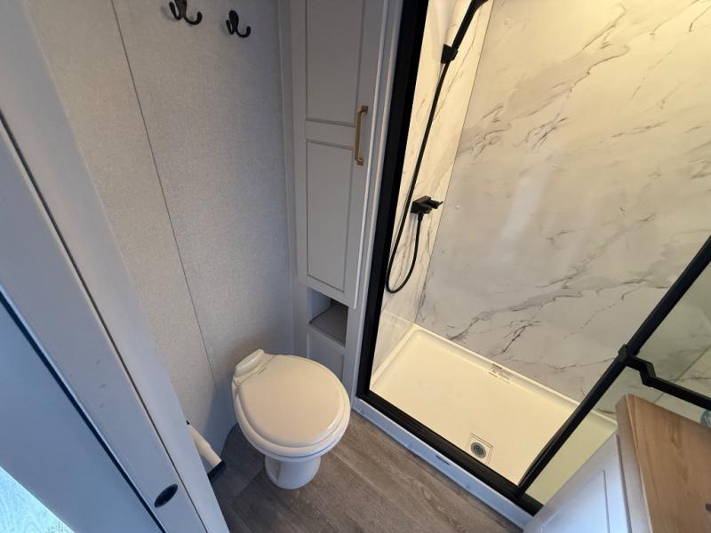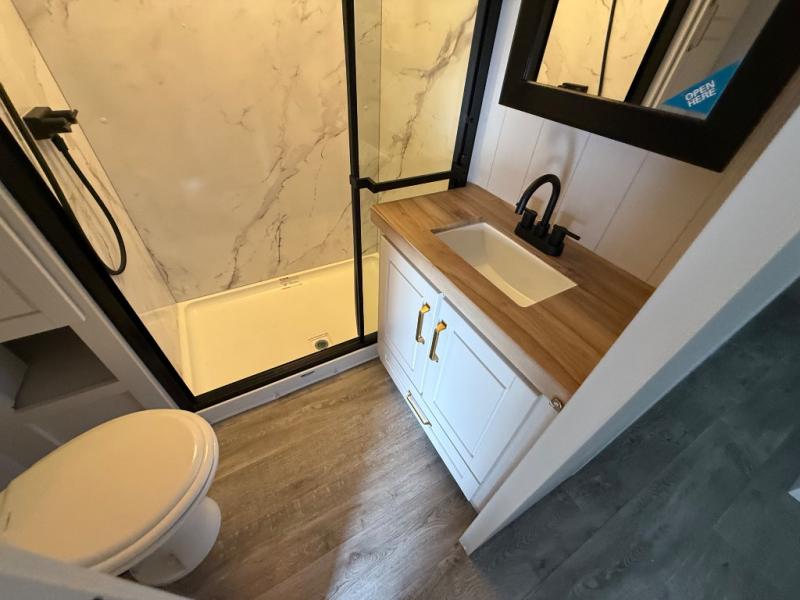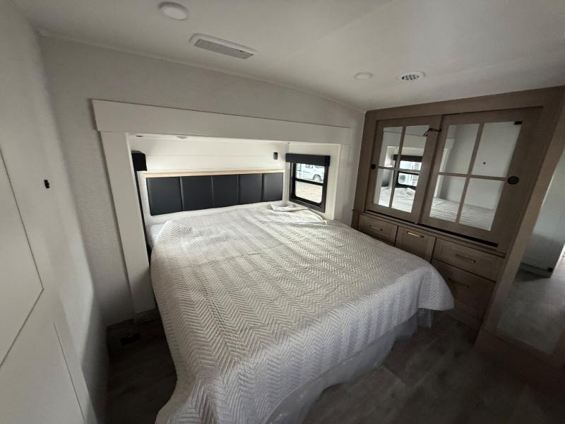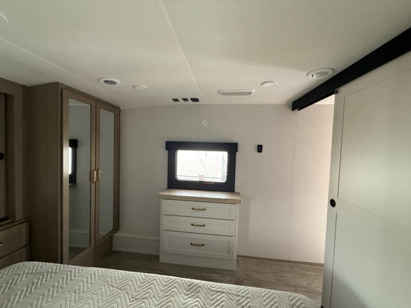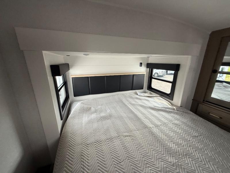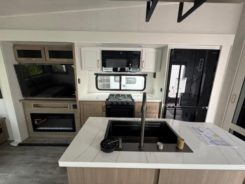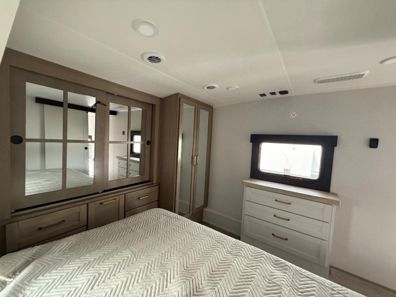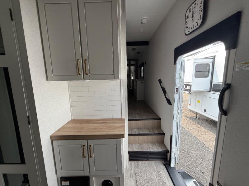 Triple slides for space, plenty of seating spaces, plus a spacious private bedroom make this fifth wheel one you won't want to pass up! You can freshen up each day in the full bath that includes a residential style glass shower door, a bathroom skylight, and a medicine cabinet to keep this space organized. Once you've cut up some fresh fruit at the kitchen island, whip up some eggs and bacon for breakfast, or just grab the cereal from the pantry. There is a spacious 16 cu. ft. 12V refrigerator, plus a hutch where you can store your own coffee machine. Relax on the tri-fold sofa, theater seat, or free-standing table with chairs/bench before heading out for the day. The king bed slide out in the front private bedroom will be waiting for you when you return!