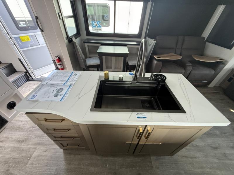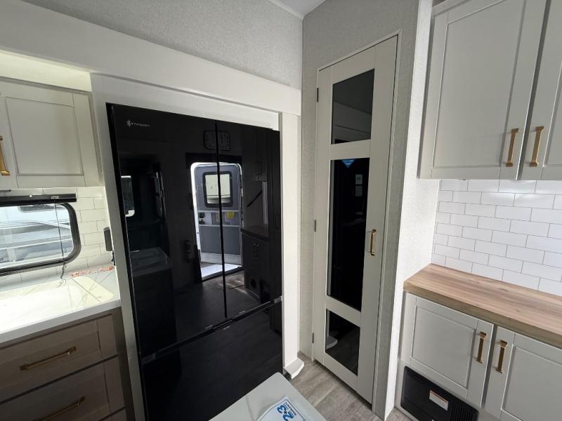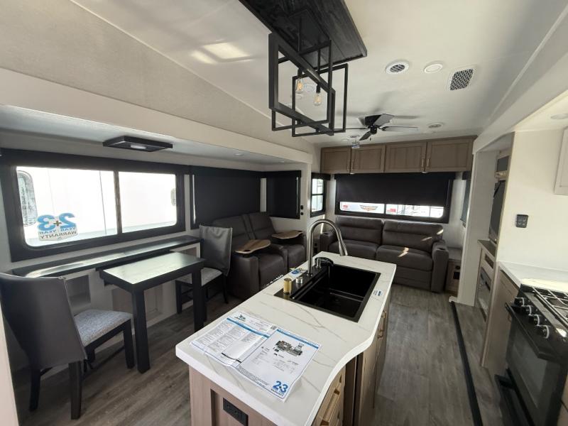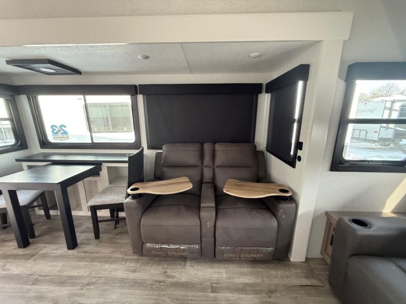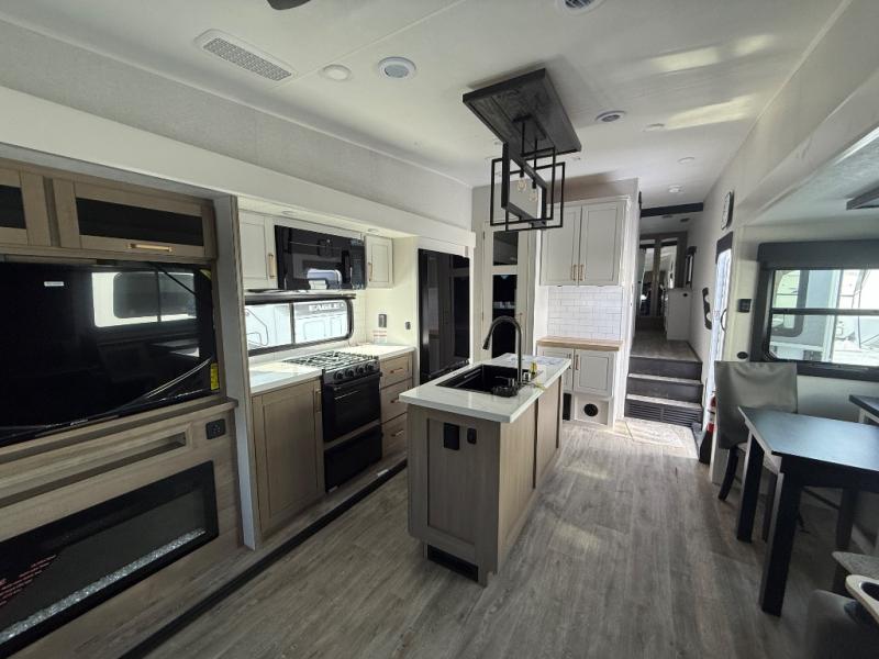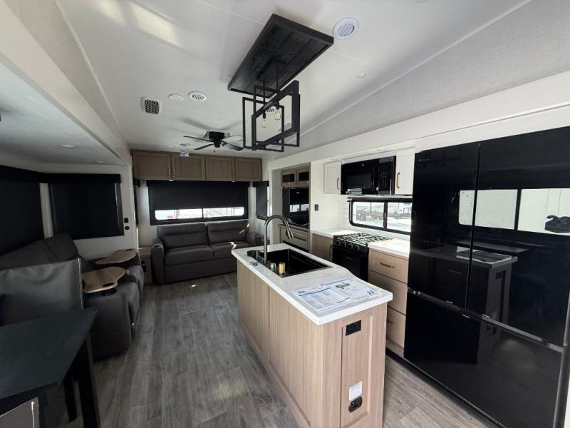 Triple slides for space, plenty of seating spaces, plus a spacious private bedroom make this fifth wheel one you won't want to pass up! You can freshen up each day in the full bath that includes a residential style glass shower door, a bathroom skylight, and a medicine cabinet to keep this space organized. Once you've cut up some fresh fruit at the kitchen island, whip up some eggs and bacon for breakfast, or just grab the cereal from the pantry. There is a spacious 16 cu. ft. 12V refrigerator, plus a hutch where you can store your own coffee machine. Relax on the tri-fold sofa, theater seat, or roll top dinette table with chairs before heading out for the day. The king bed slide out in the front private bedroom will be waiting for you when you return!