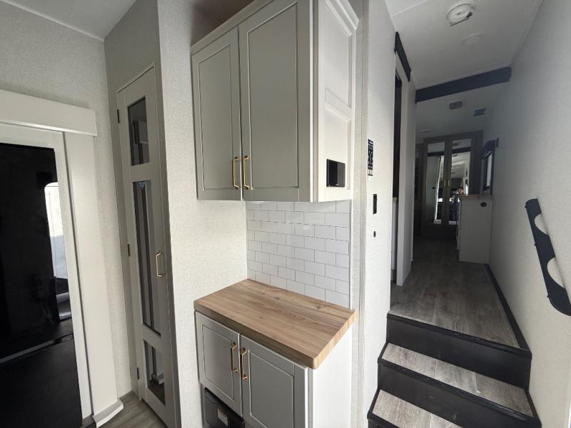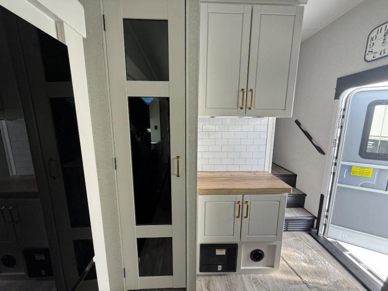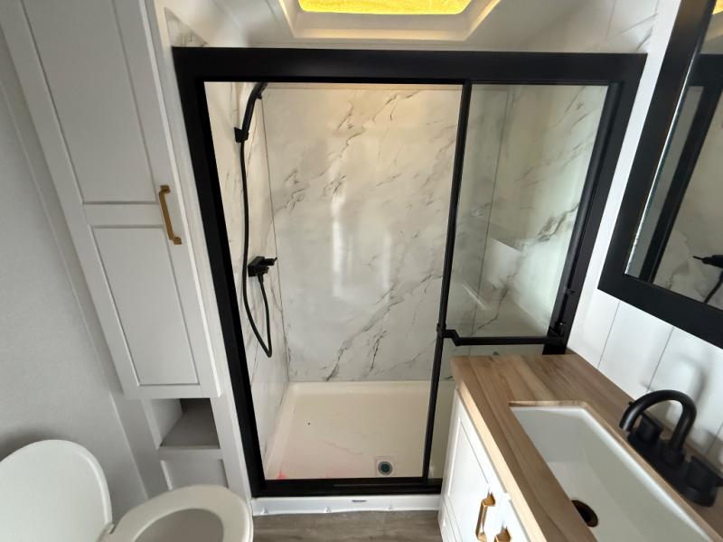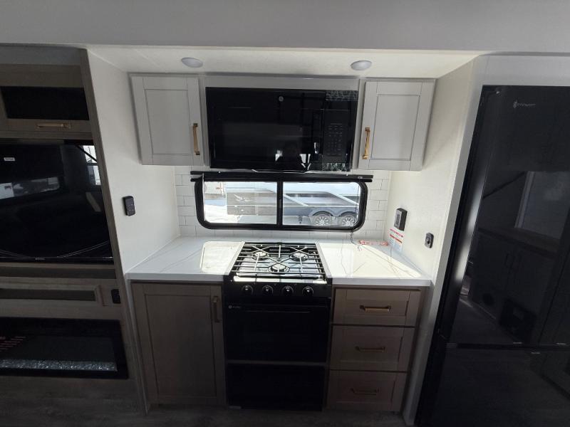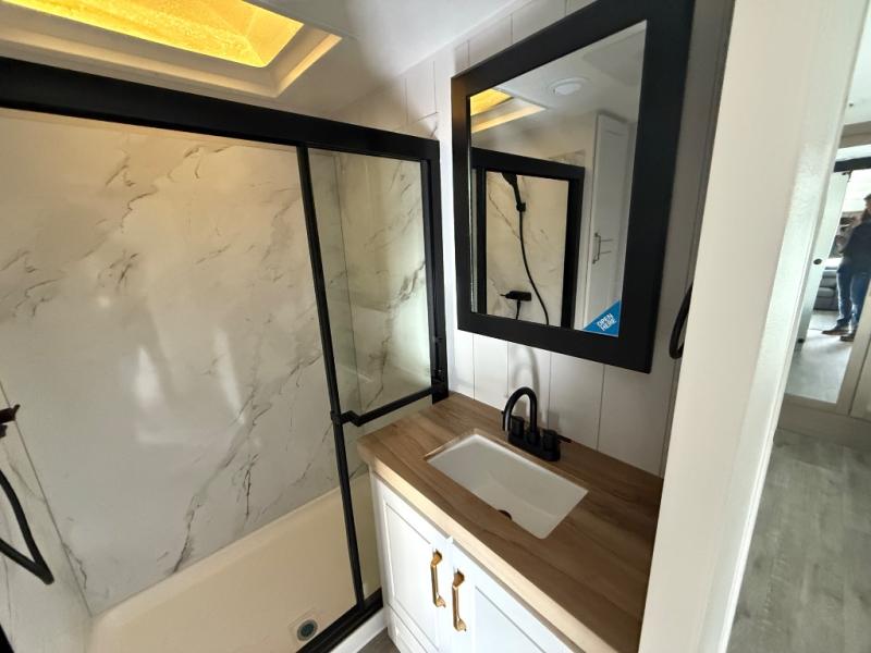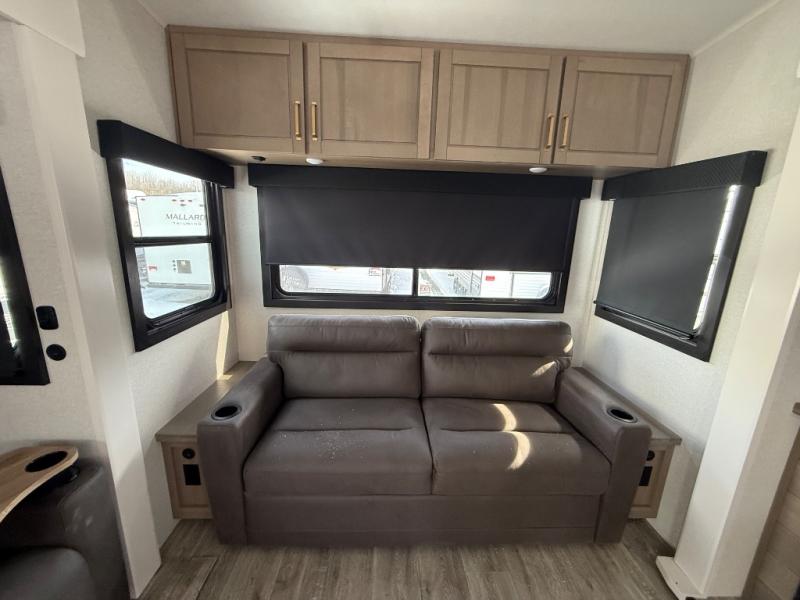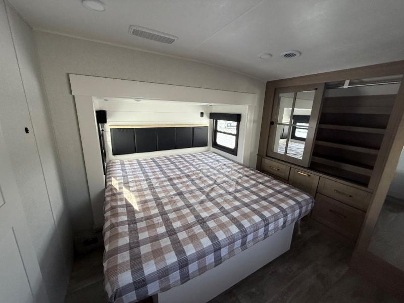 Triple slides for space, plenty of seating spaces, plus a spacious private bedroom make this fifth wheel one you won't want to pass up! You can freshen up each day in the full bath that includes a residential style glass shower door, a bathroom skylight, and a medicine cabinet to keep this space organized. Once you've cut up some fresh fruit at the kitchen island, whip up some eggs and bacon for breakfast, or just grab the cereal from the pantry. There is a spacious 16 cu. ft. 12V refrigerator, plus a hutch where you can store your own coffee machine. Relax on the tri-fold sofa, theater seat, or roll top dinette table with chairs before heading out for the day. The king bed slide out in the front private bedroom will be waiting for you when you return!