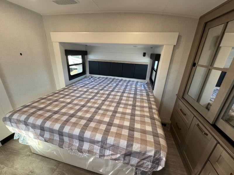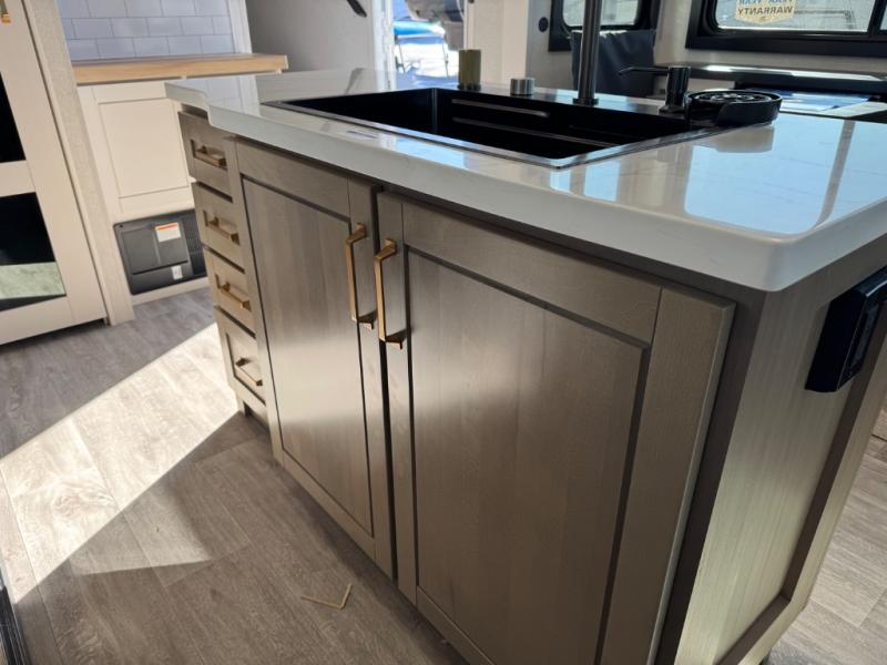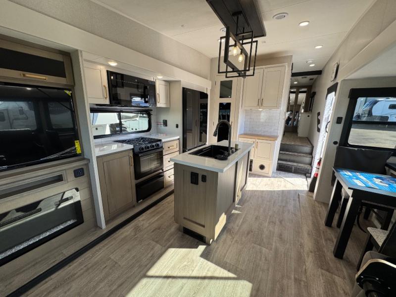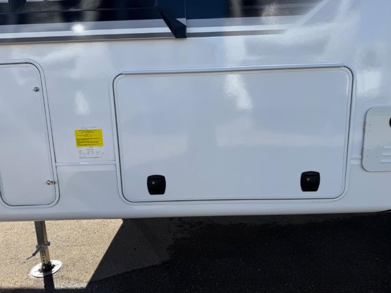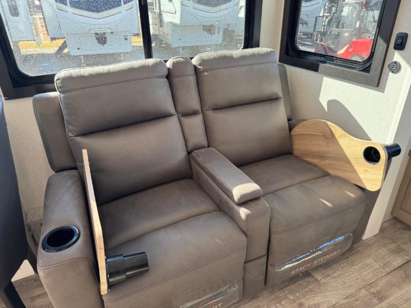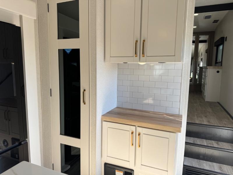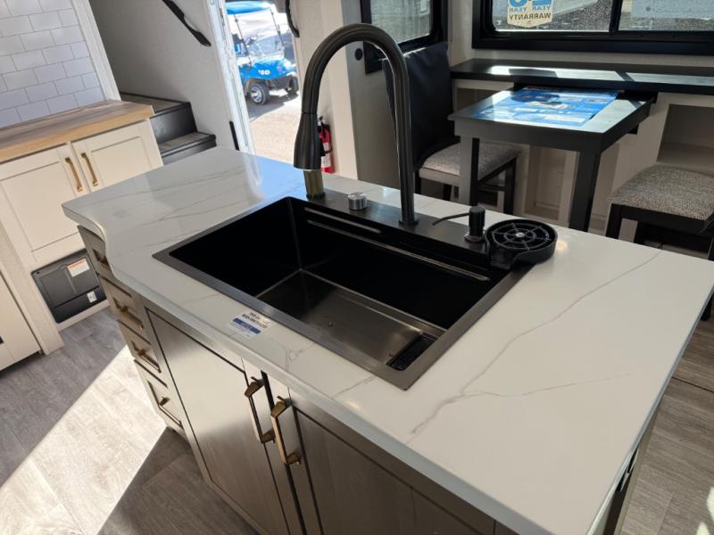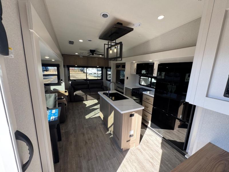 Triple slides for space, plenty of seating spaces, plus a spacious private bedroom make this fifth wheel one you won't want to pass up! You can freshen up each day in the full bath that includes a residential style glass shower door, a bathroom skylight, and a medicine cabinet to keep this space organized. Once you've cut up some fresh fruit at the kitchen island, whip up some eggs and bacon for breakfast, or just grab the cereal from the pantry. There is a spacious 16 cu. ft. 12V refrigerator, plus a hutch where you can store your own coffee machine. Relax on the tri-fold sofa, theater seat, or roll top dinette table with chairs before heading out for the day. The king bed slide out in the front private bedroom will be waiting for you when you return!