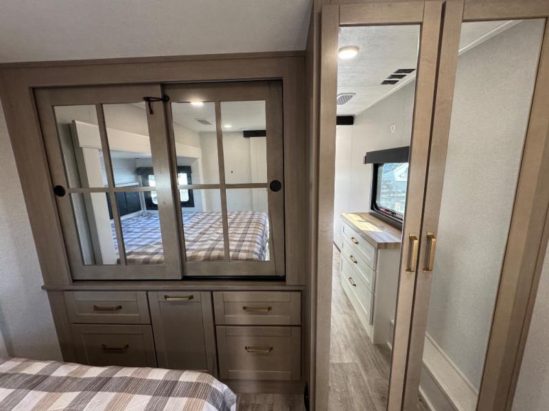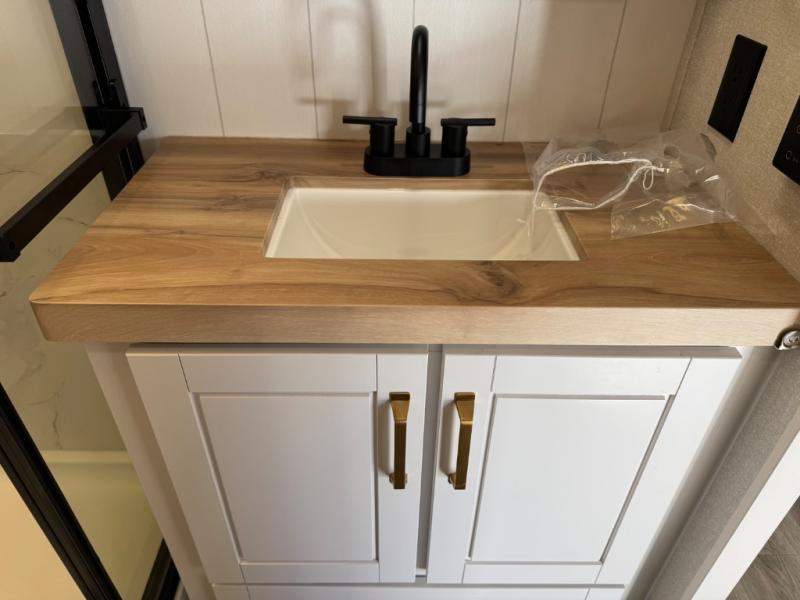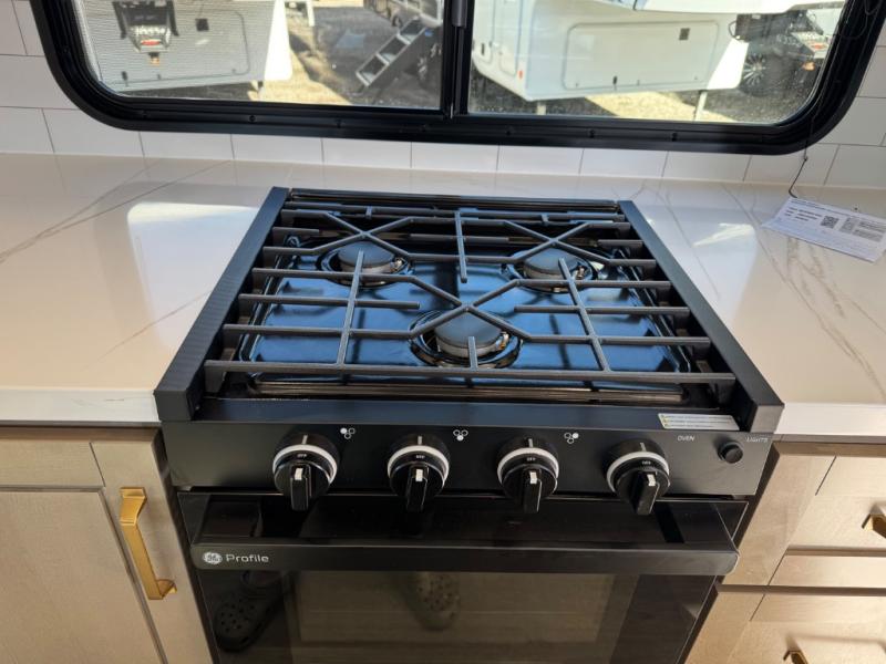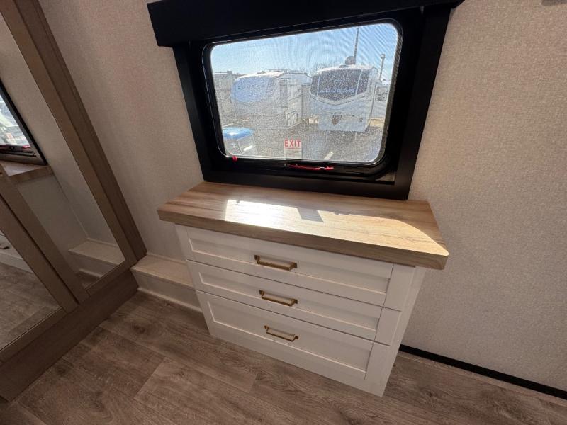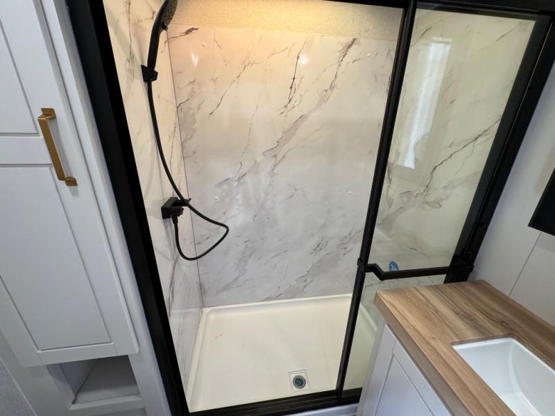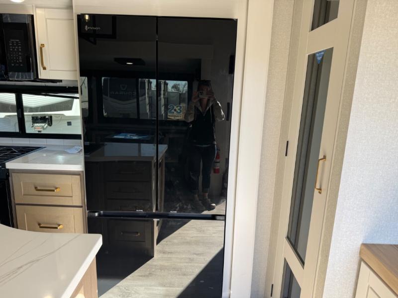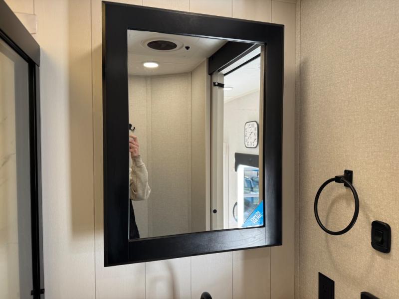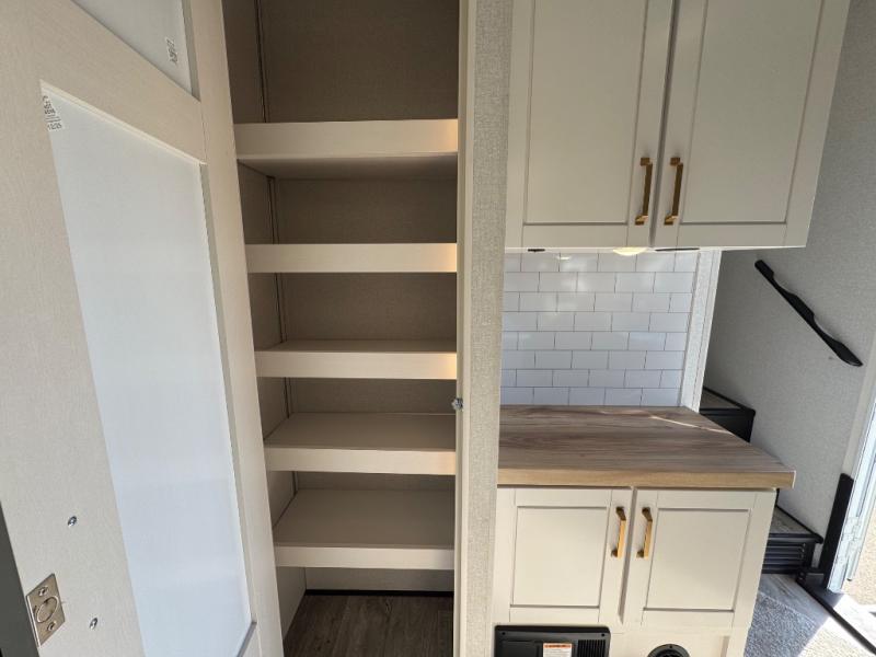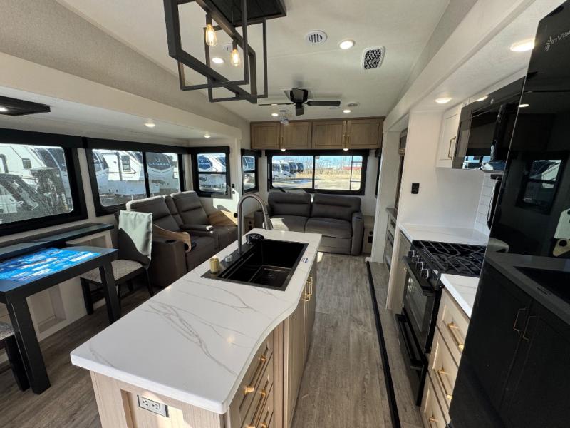 Triple slides for space, plenty of seating spaces, plus a spacious private bedroom make this fifth wheel one you won't want to pass up! You can freshen up each day in the full bath that includes a residential style glass shower door, a bathroom skylight, and a medicine cabinet to keep this space organized. Once you've cut up some fresh fruit at the kitchen island, whip up some eggs and bacon for breakfast, or just grab the cereal from the pantry. There is a spacious 16 cu. ft. 12V refrigerator, plus a hutch where you can store your own coffee machine. Relax on the tri-fold sofa, theater seat, or roll top dinette table with chairs before heading out for the day. The king bed slide out in the front private bedroom will be waiting for you when you return!